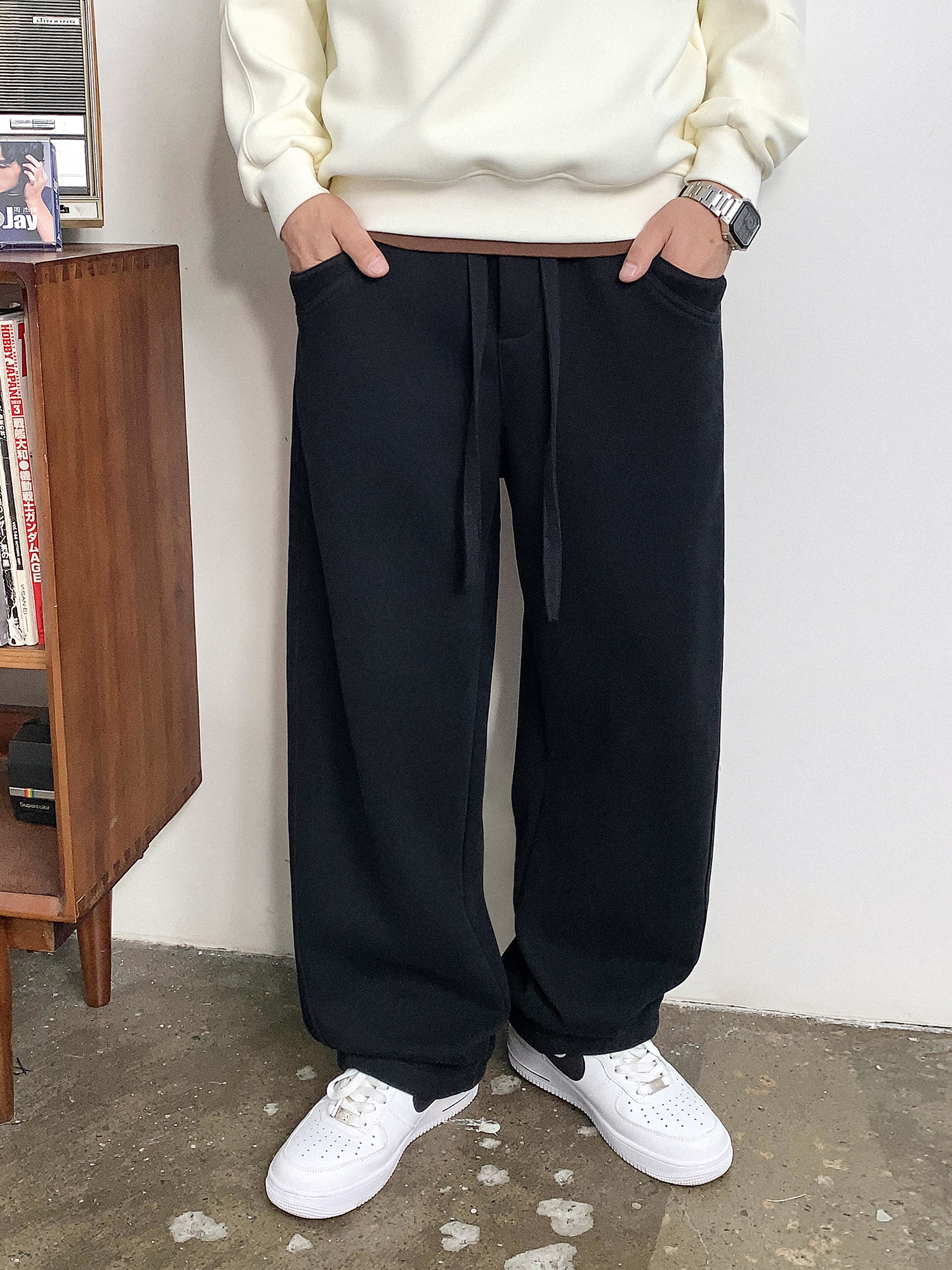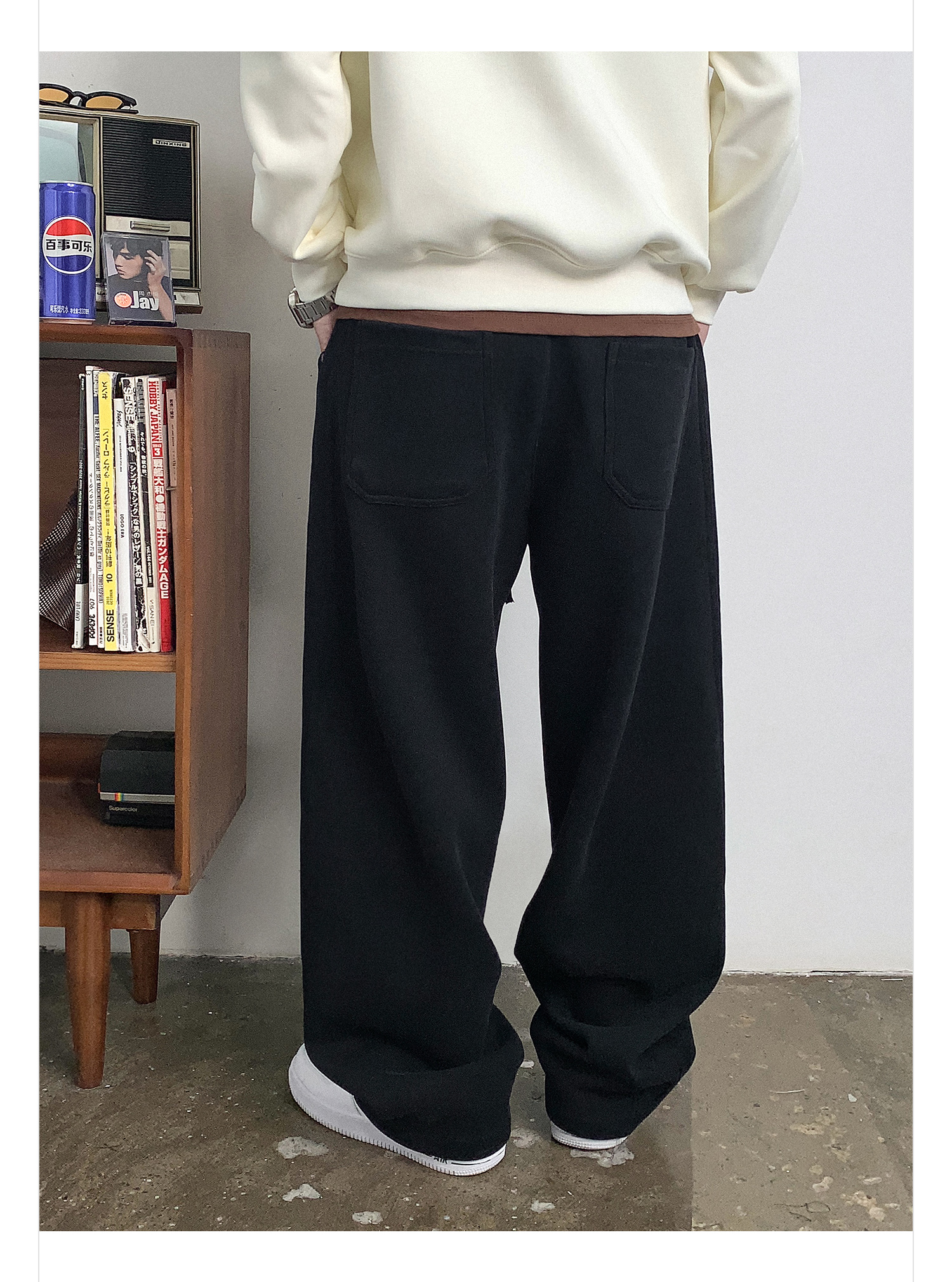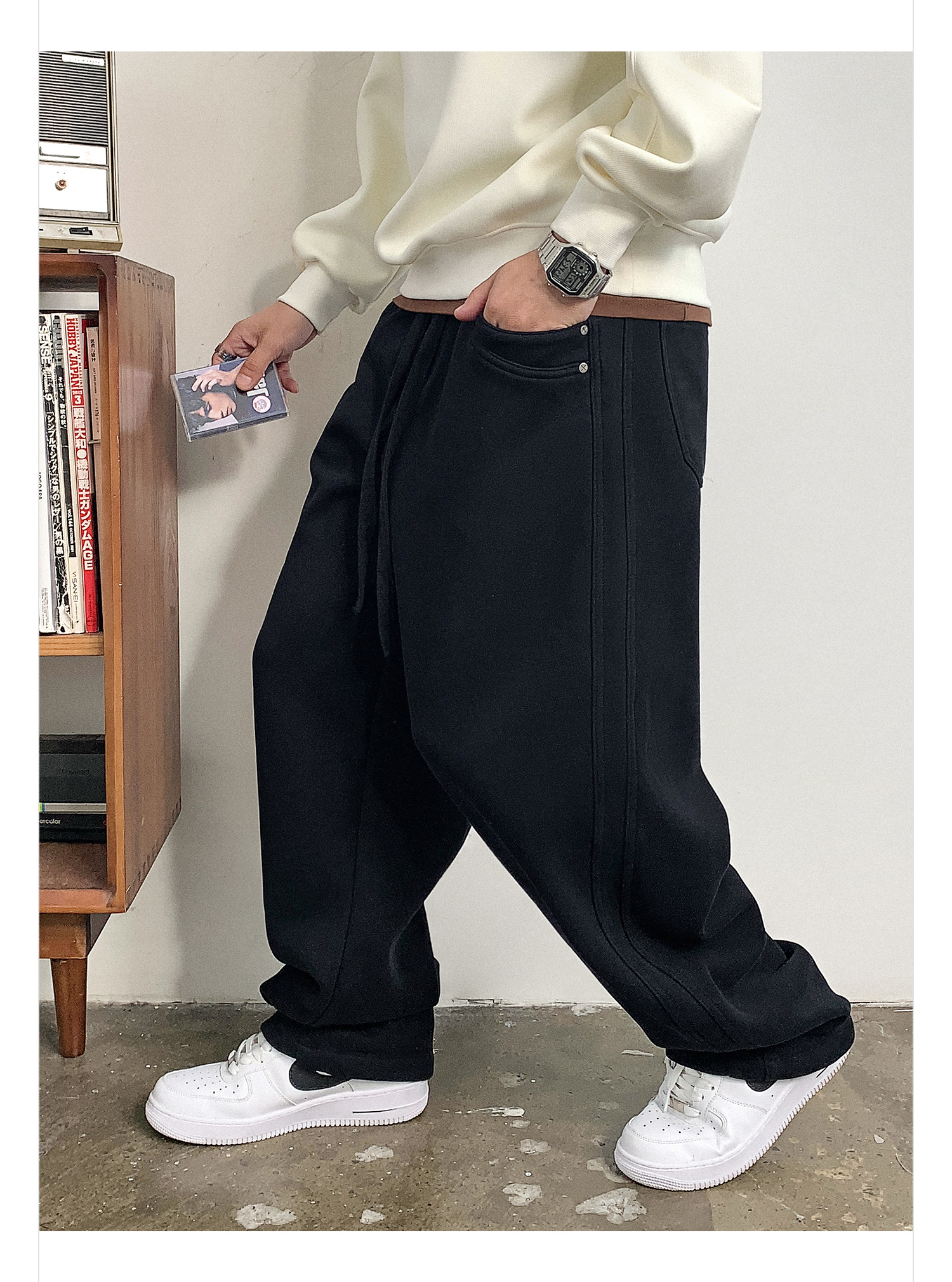 徐太浪黑色缉明线磨毛休闲裤男秋冬季潮流百搭宽松直筒运动裤长裤