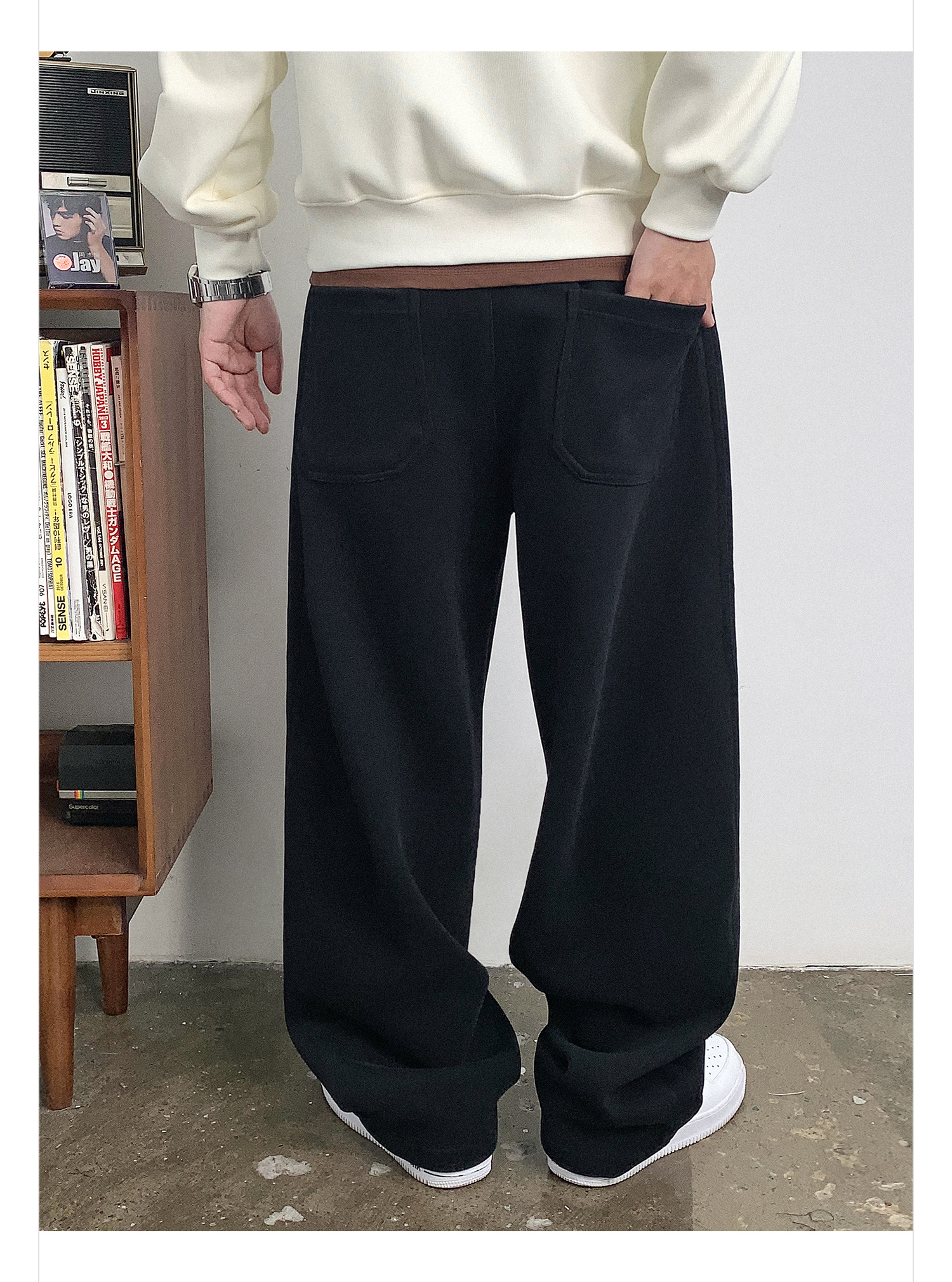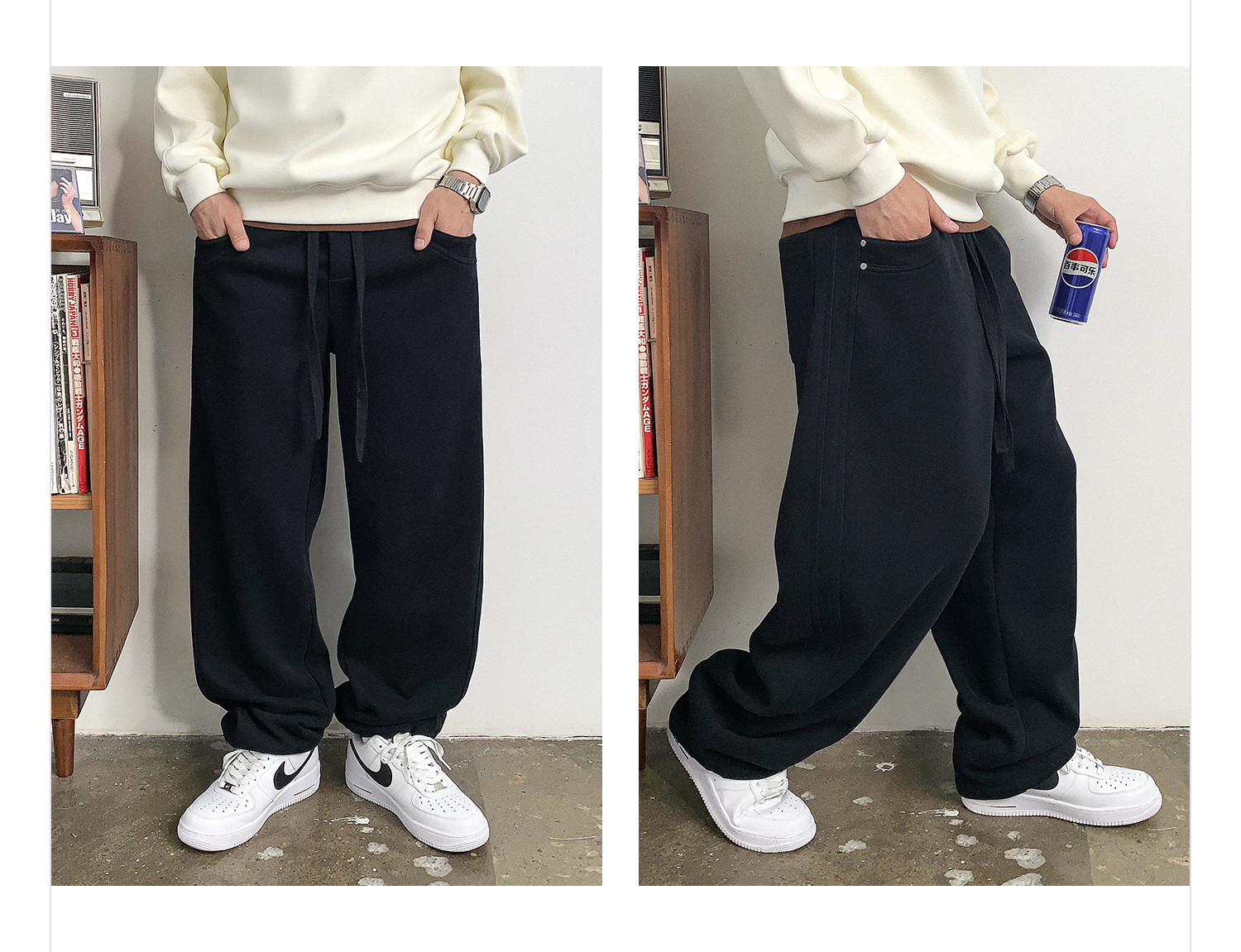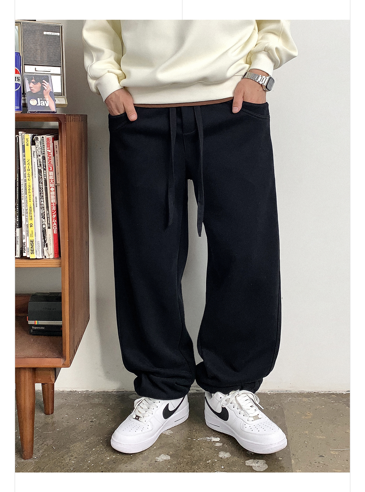 徐太浪黑色缉明线磨毛休闲裤男秋冬季潮流百搭宽松直筒运动裤长裤
