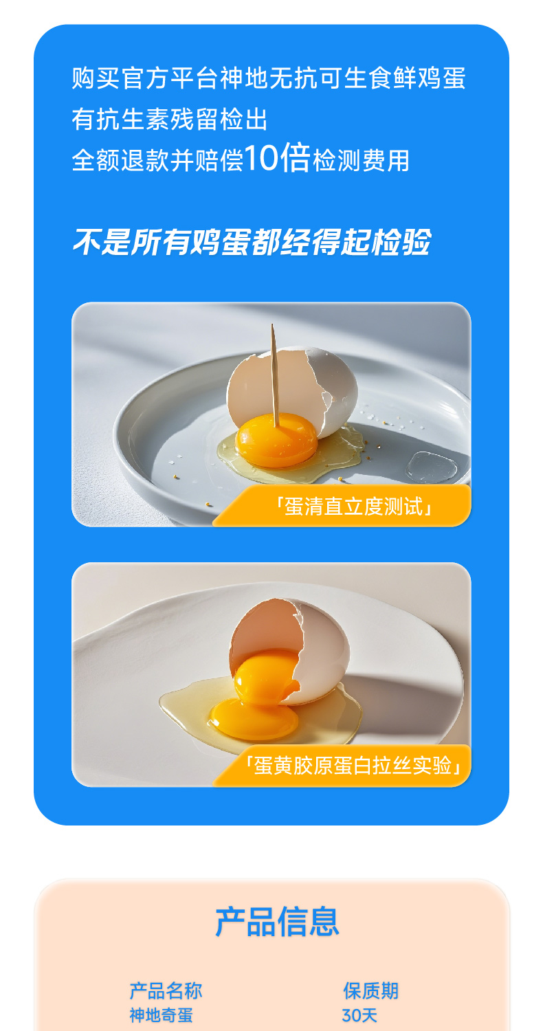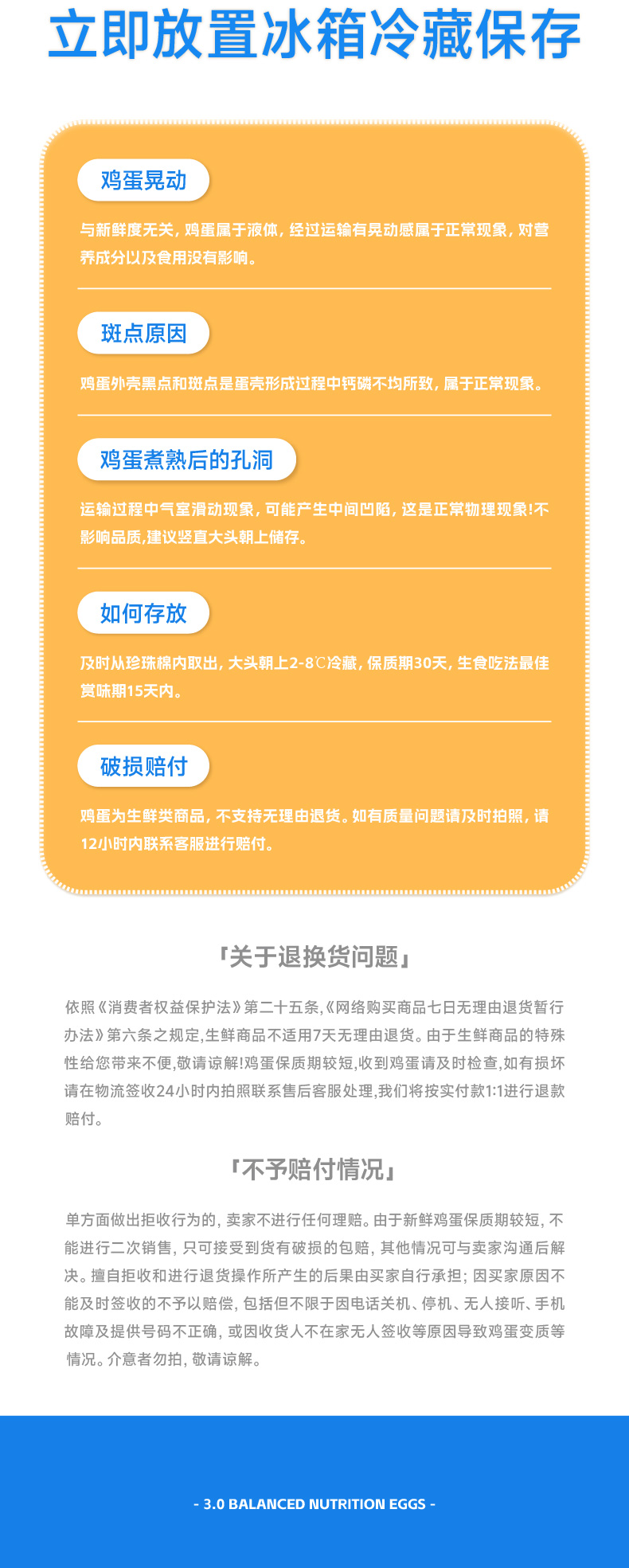 3.鸡蛋保质期较短,收到鸡蛋请及时检查,如有破损,请在签收之后,24小时提供产品附带快递面单照片联系客服处理,按损坏量进行比例赔偿。