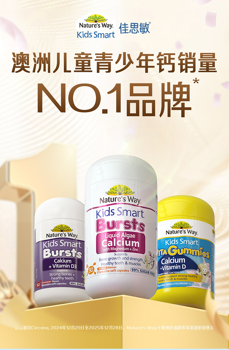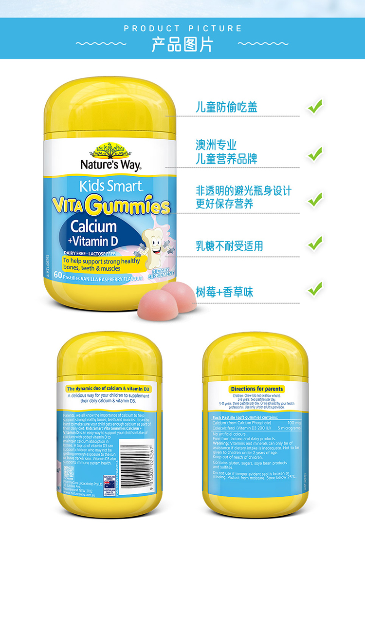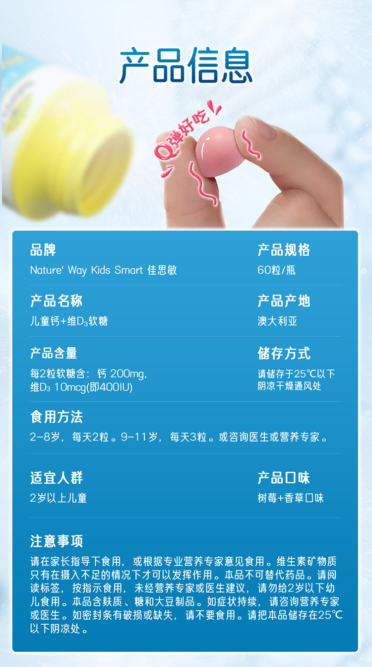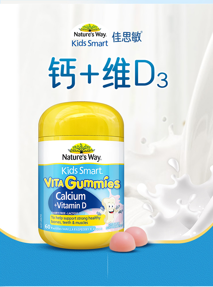 Nature’s Way佳思敏儿童维生素D3钙软糖补充钙骨骼发育60粒(效期27年7月)