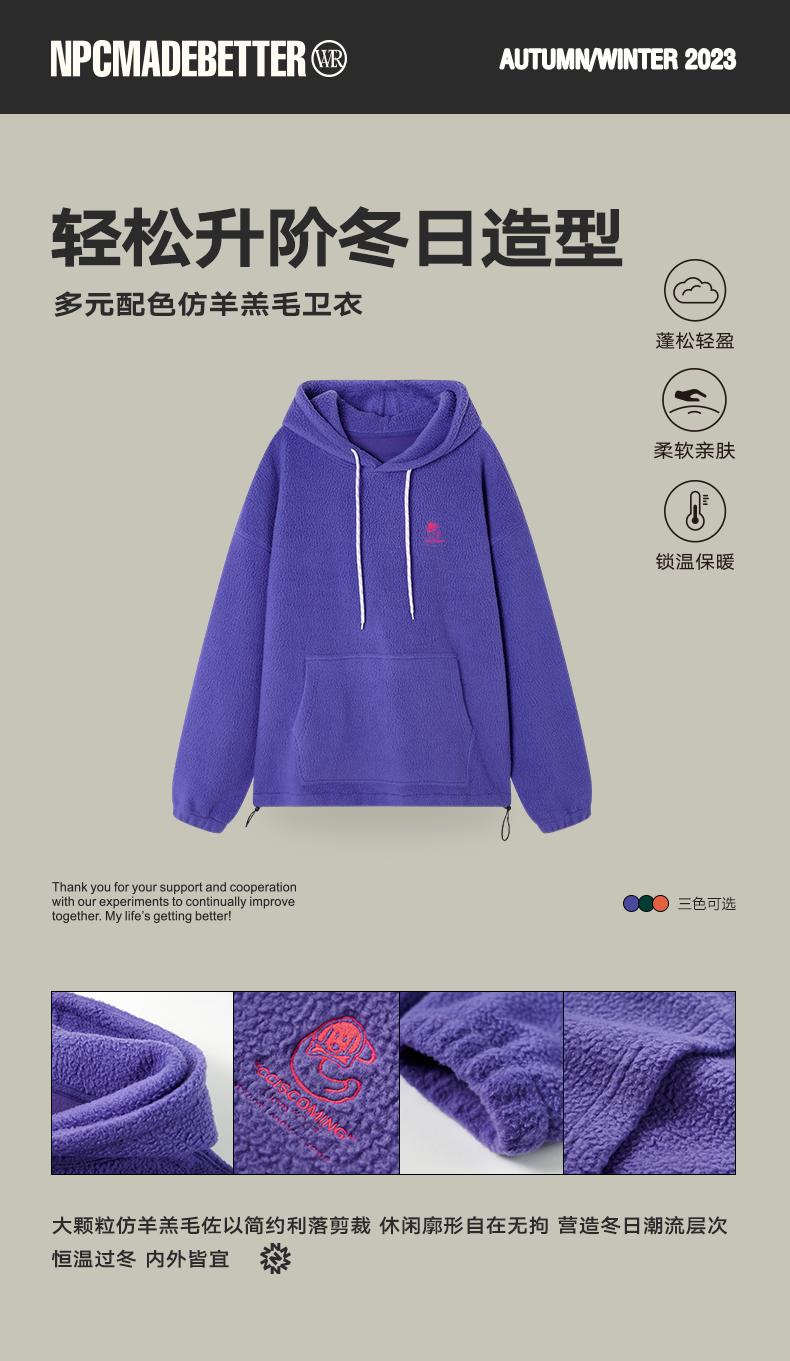 NPC潮牌CC系列仿羊羔毛连帽刺绣卫衣秋冬情侣加绒卫衣CC3AST40