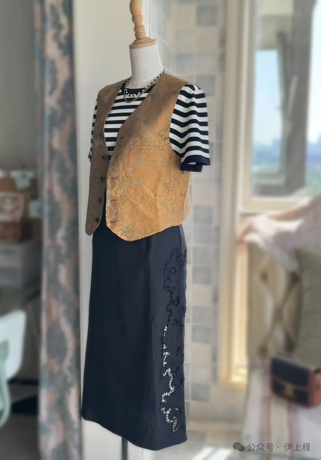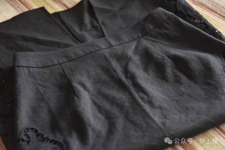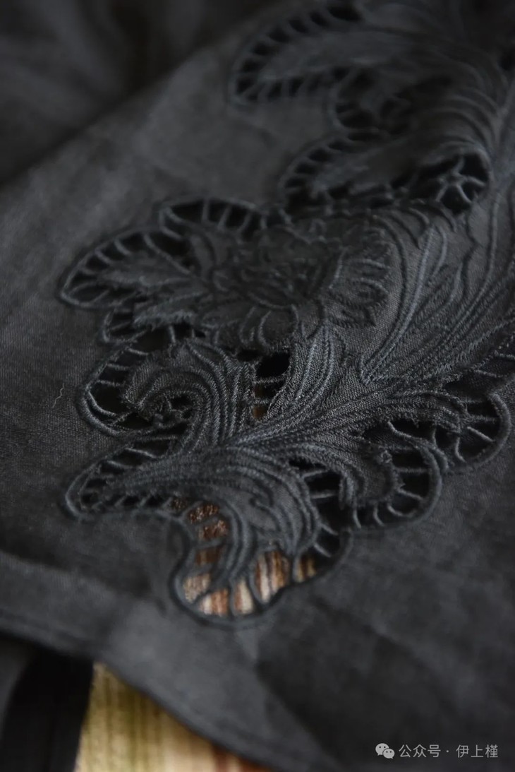 La Maison Jade黑色亚麻镂花半裙,之前开团的绿色开衫外套一个品牌,这款因为风格更偏白富美,不像绿色外套那样大开大合,所以在镂花的刺绣和剪裁工艺上更加讲求一个精细,刺绣针脚选择得更细,工艺难度也更高。