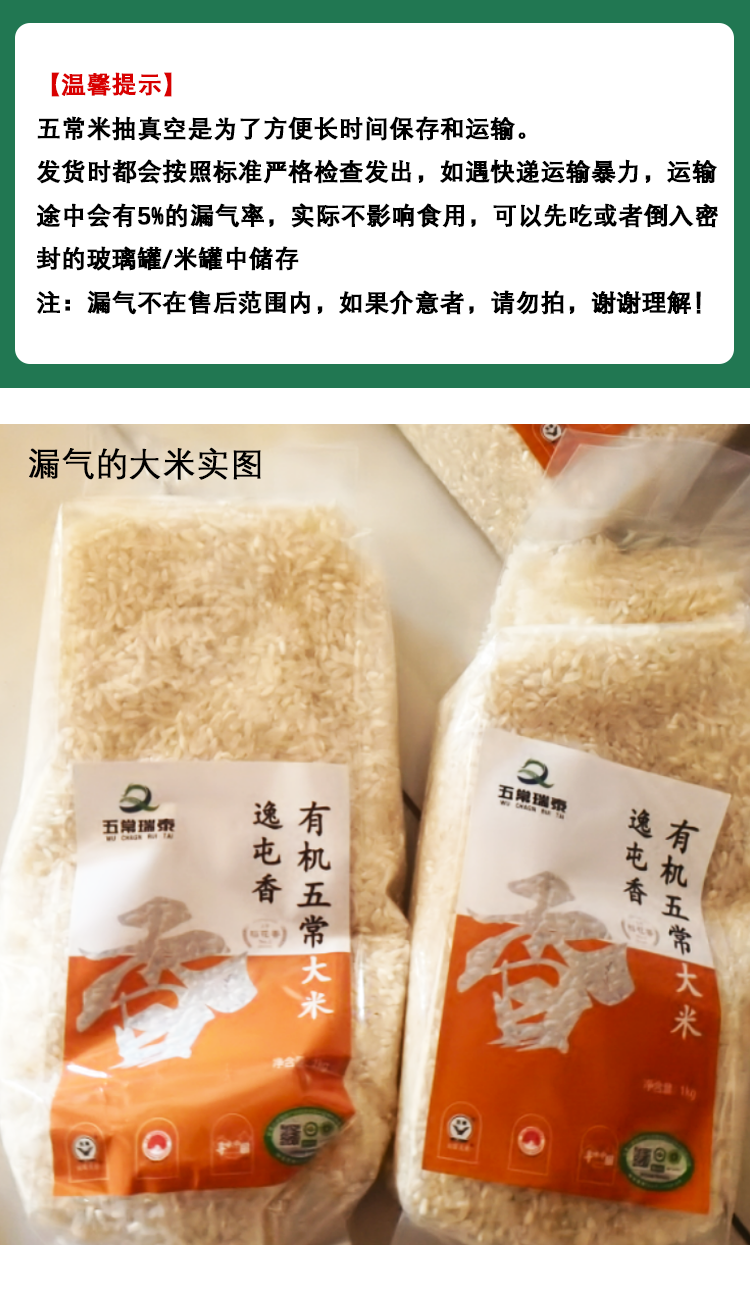 注意!!!米是非常重的,真空包装是为了方便运输,路途遥远,在路上快递暴力,有时候会出现漏气的情况,属于正常情况,不在售后范围,介意者慎拍!!!