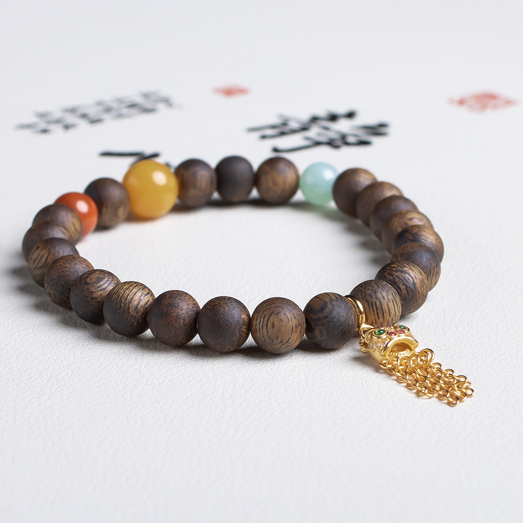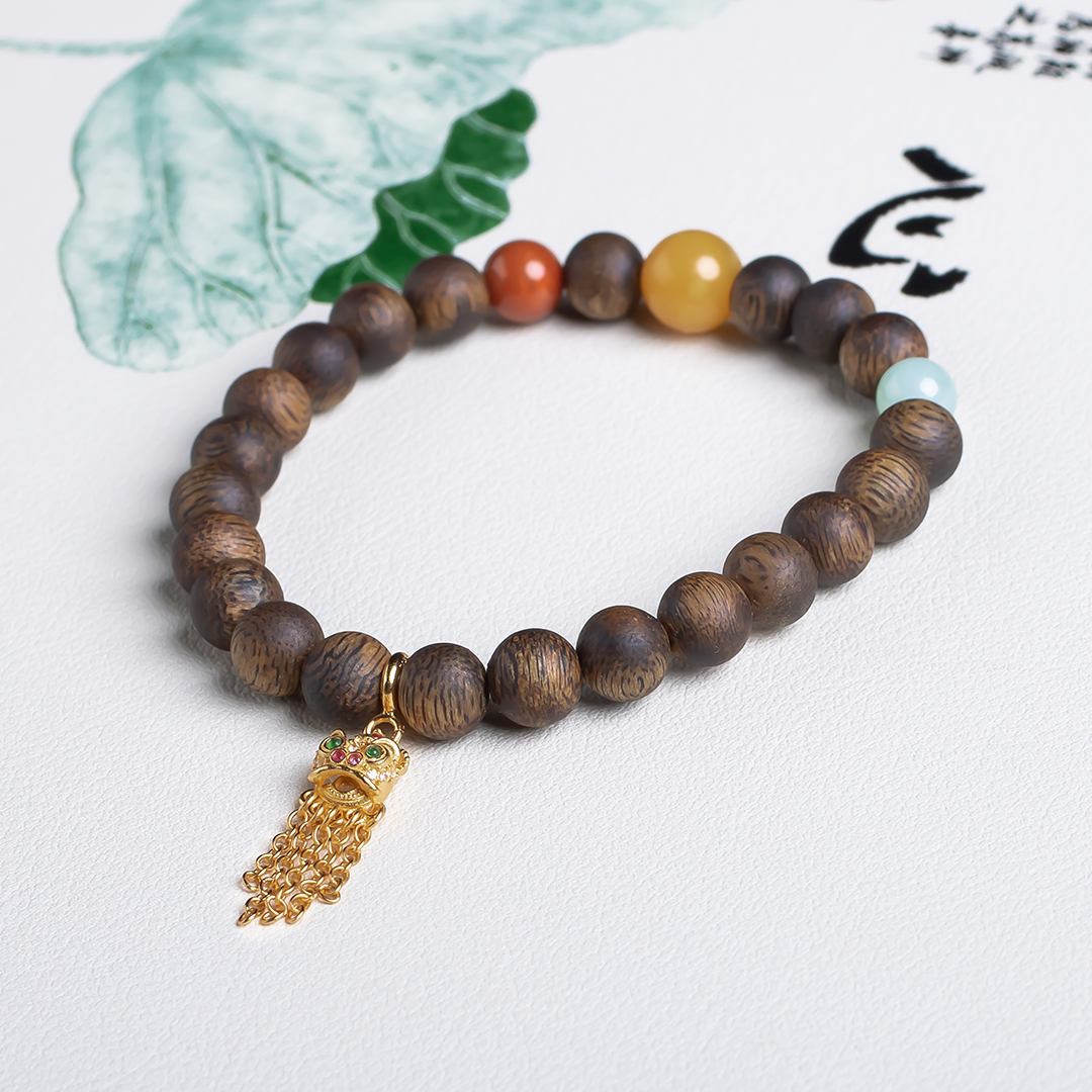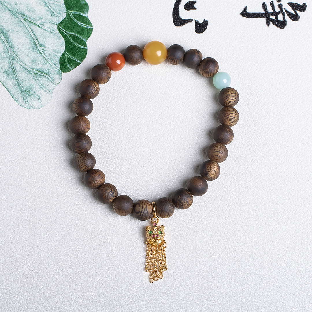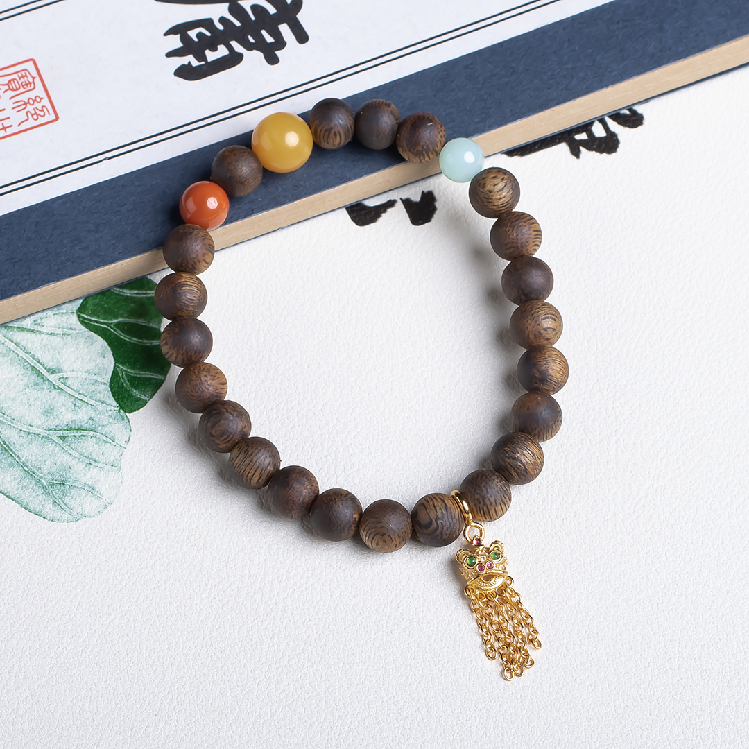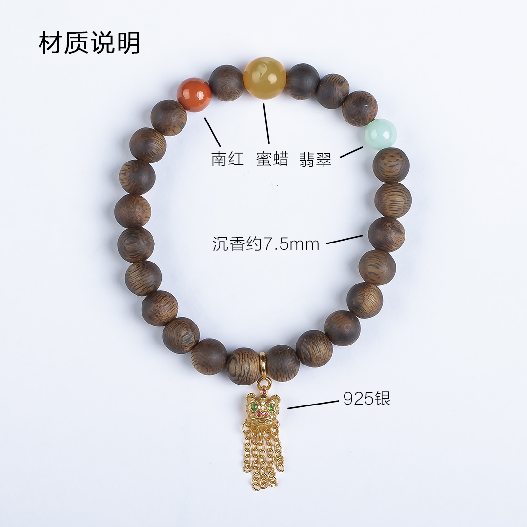 xy0548沉香+蜜蜡南红翡翠手串,天然沉香约7.5mm,原色原味,香味自然清甜,南红蜜蜡翡翠三宝温润养身,一枚925银醒狮小坠,吉祥、安康,事业和顺。