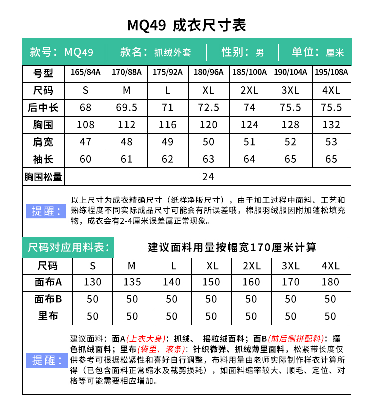 裁缝学苑MQ49秋冬防风保暖全拉链抓绒衣外套纸样男士上衣版型图纸