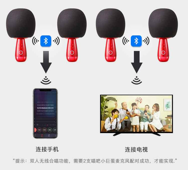 两只麦克风还能互联,情歌对唱、K歌比试都不在话下。