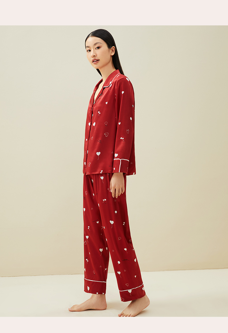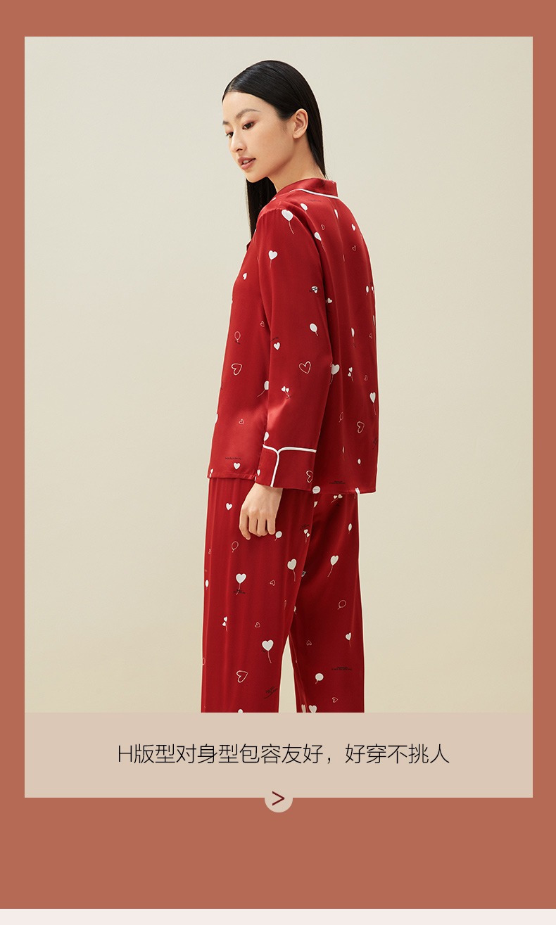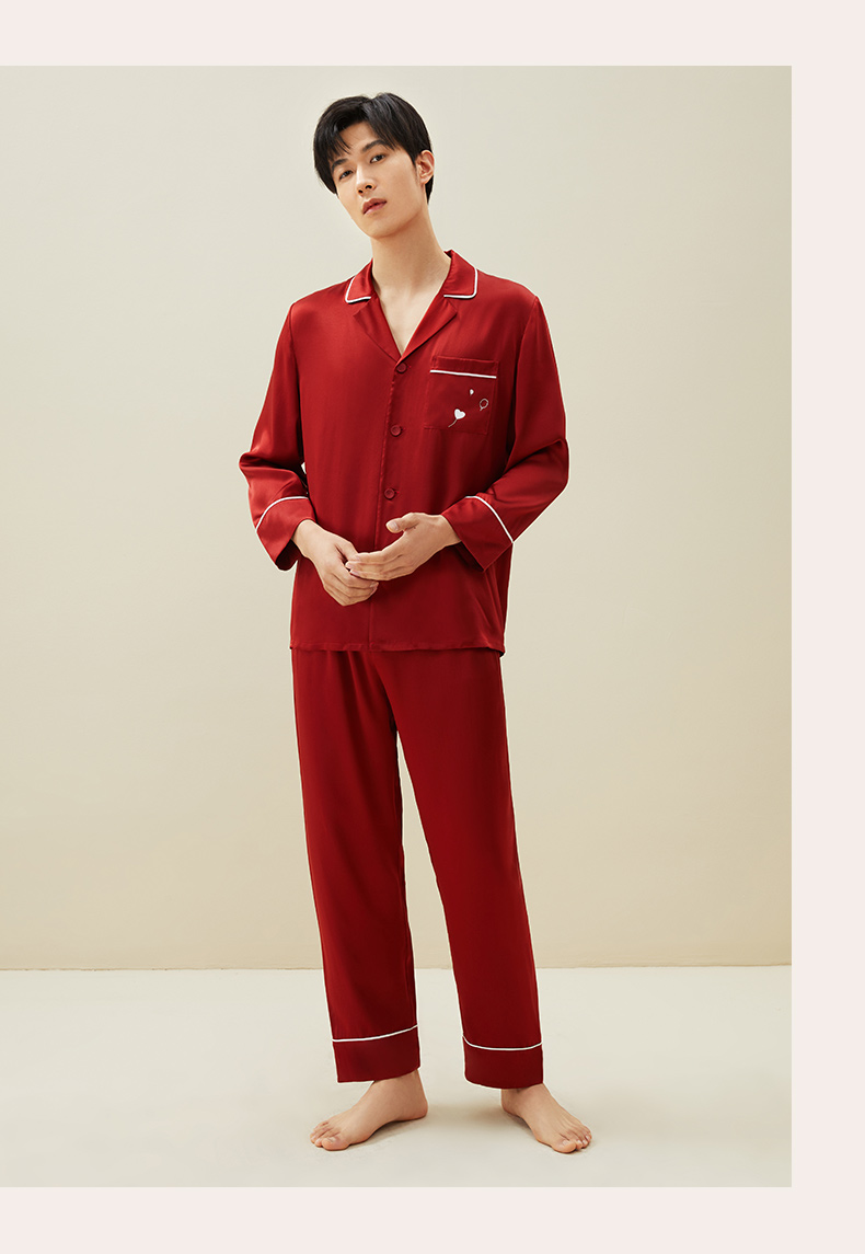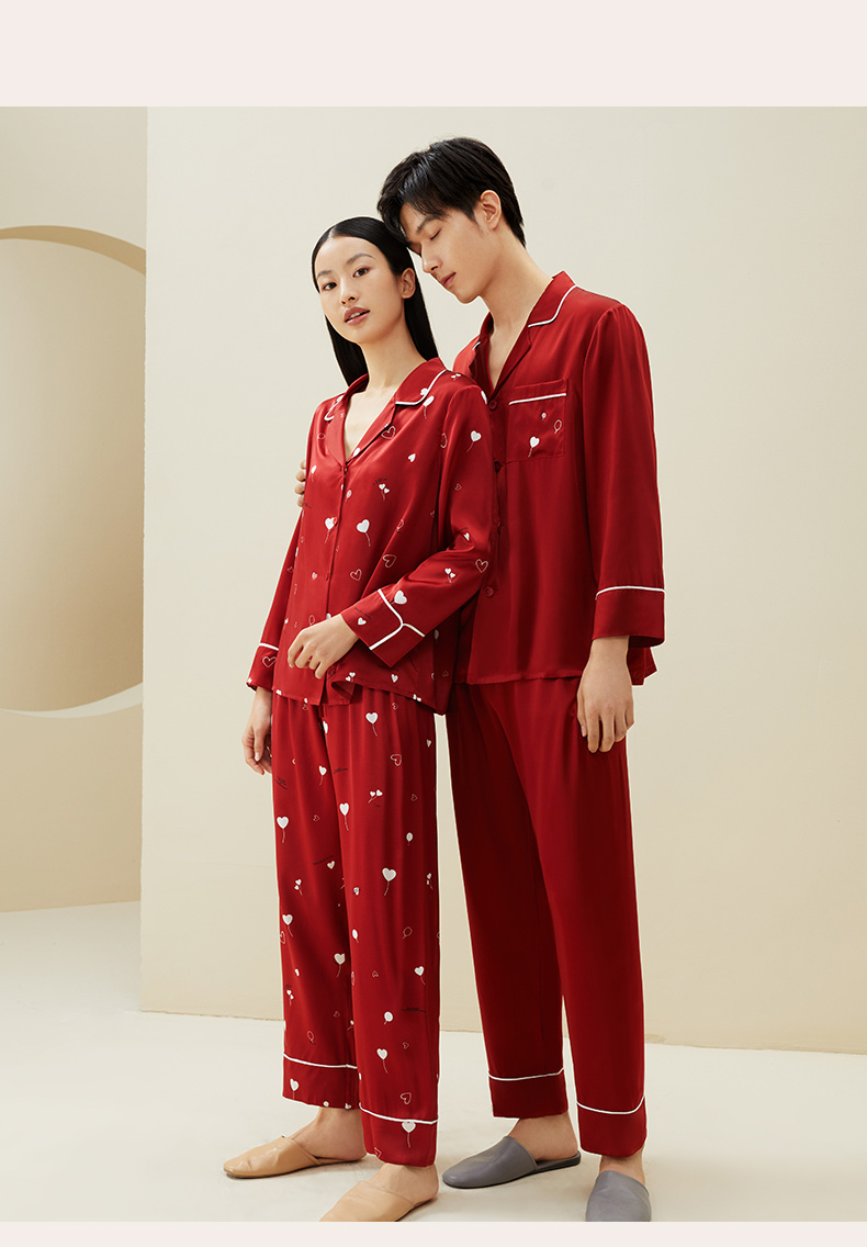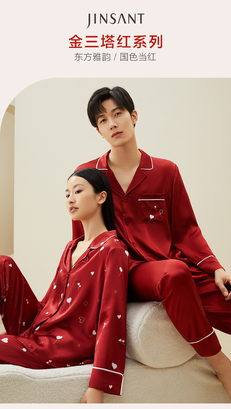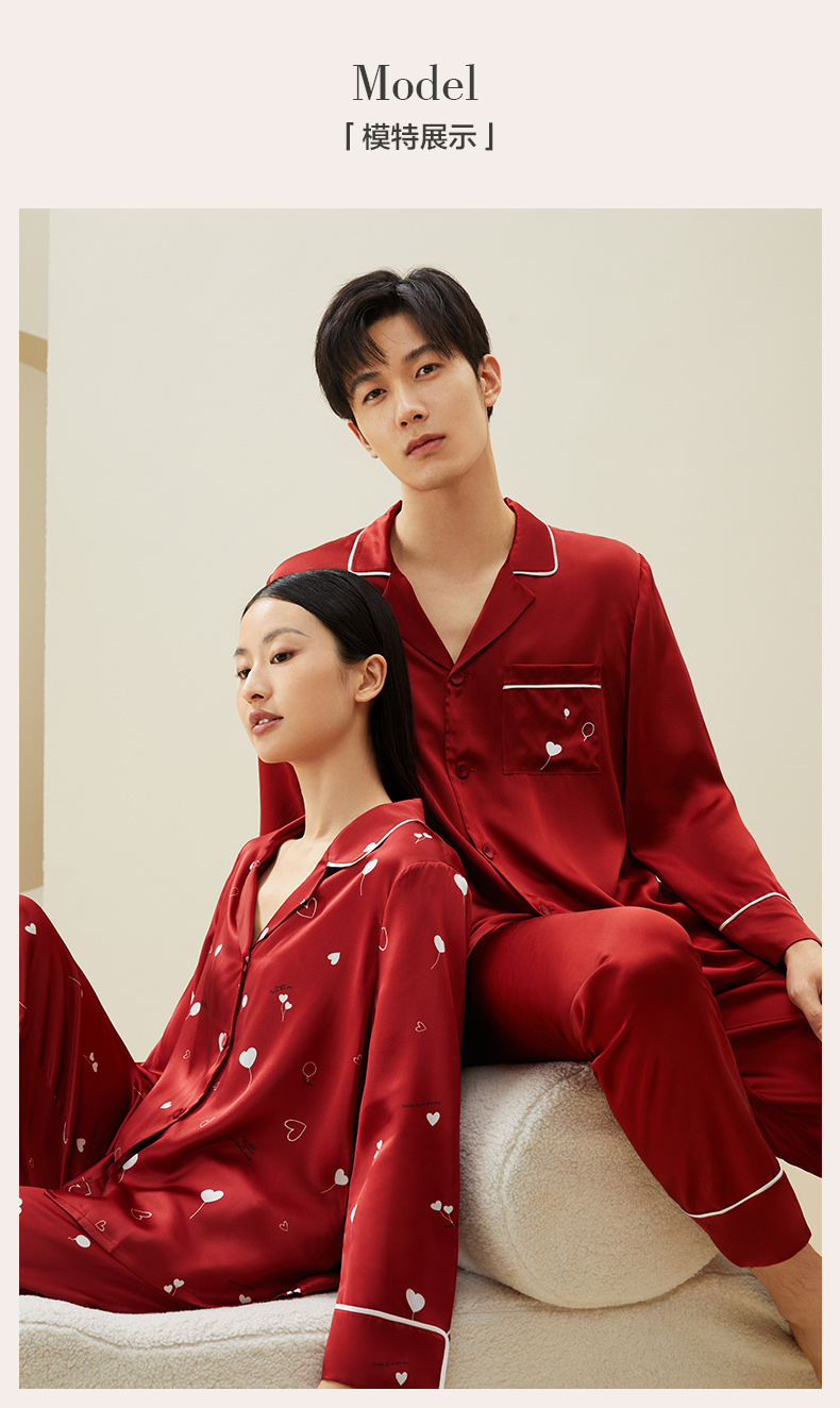 金三塔19姆米重磅桑蚕丝情侣婚庆真丝睡衣红色长袖男女真丝印花家居服套装 YSFDA201+YSMDA201