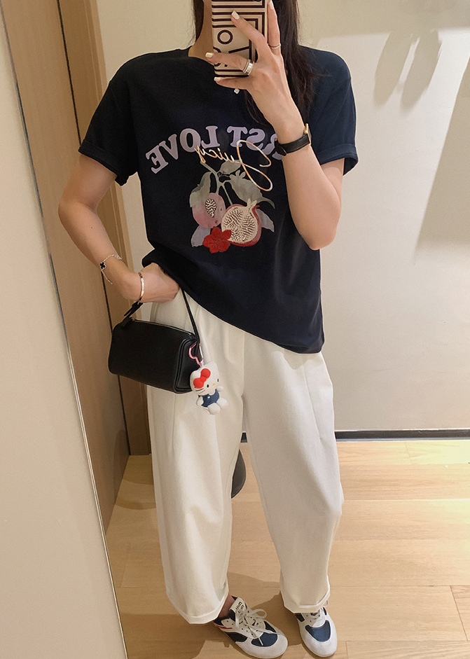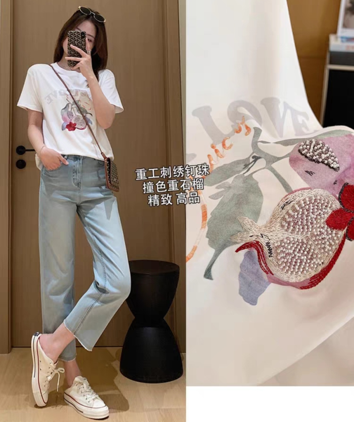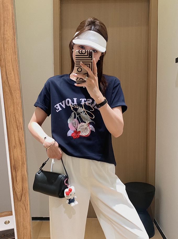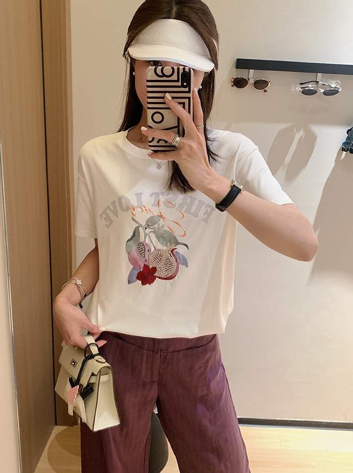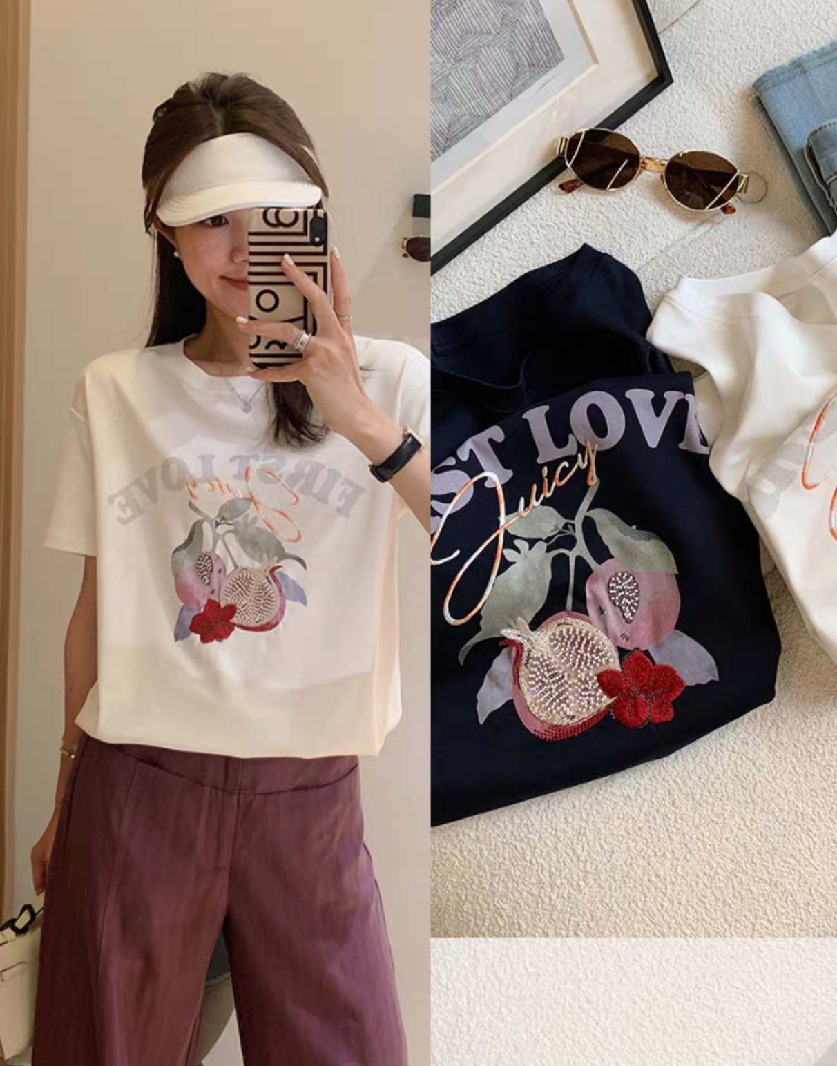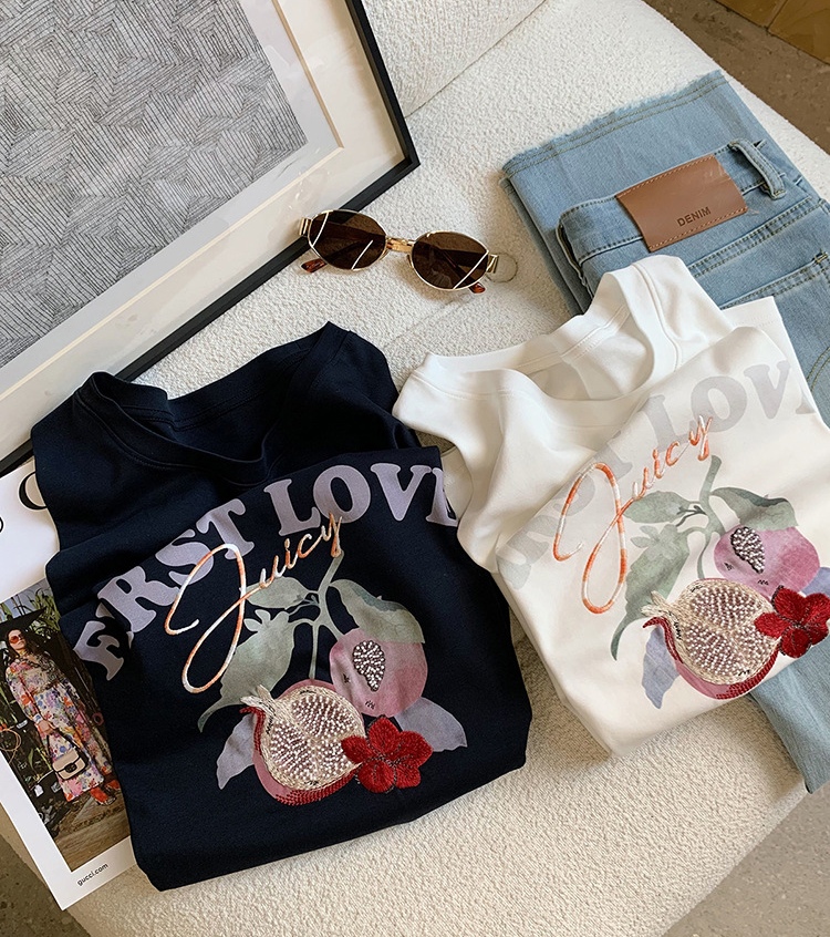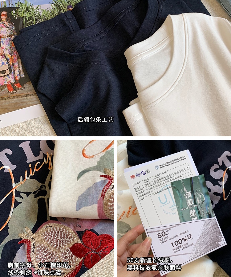50支新疆长绒棉,黑科技液氨亲肤面料,吸汗透气。手感细腻爽滑,合体微松版型,对身型有一ding包容性,不挑人,字母、小石榴印花,线条刺绣+钉珠点缀