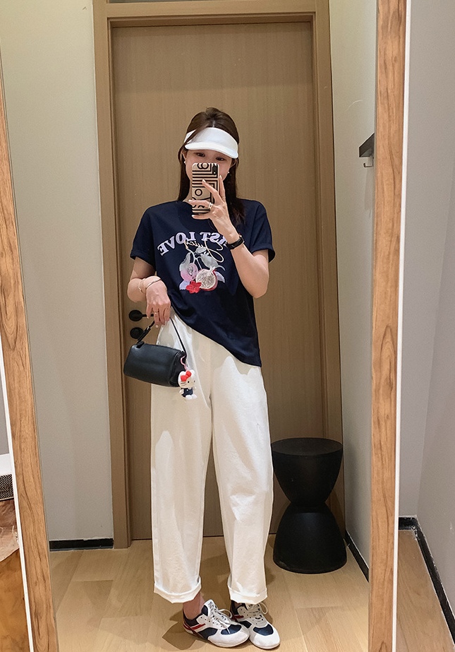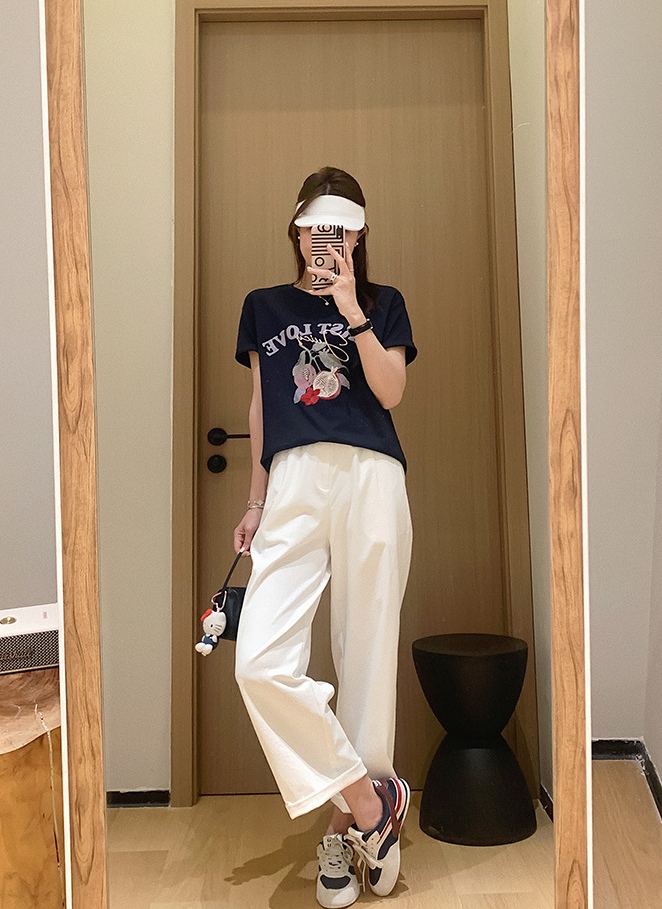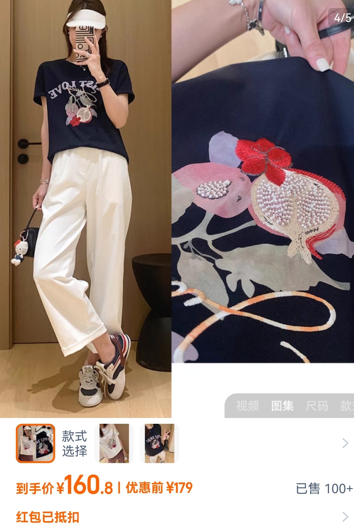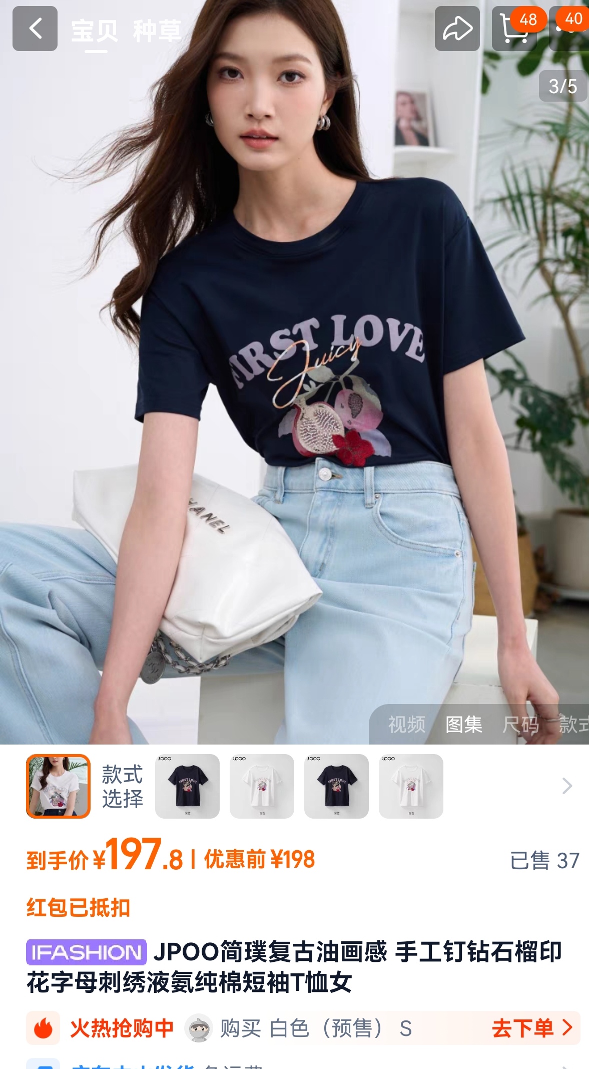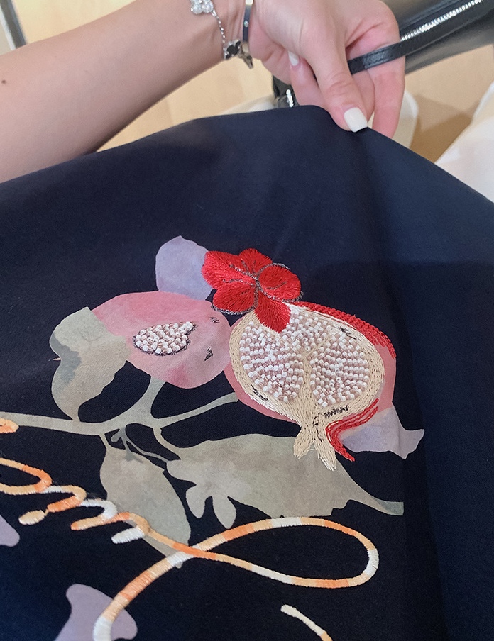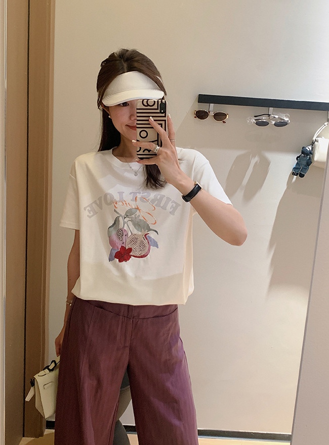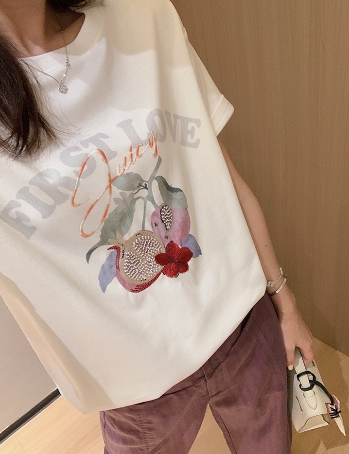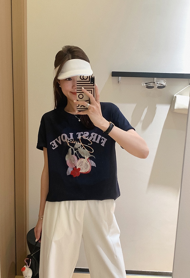 50支新疆长绒棉,黑科技液氨亲肤面料,吸汗透气。手感细腻爽滑,合体微松版型,对身型有一ding包容性,不挑人,字母、小石榴印花,线条刺绣+钉珠点缀
