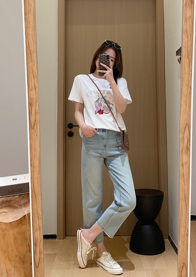 50支液氨新疆长绒棉刺绣印花圆领短袖,不变形不掉色。