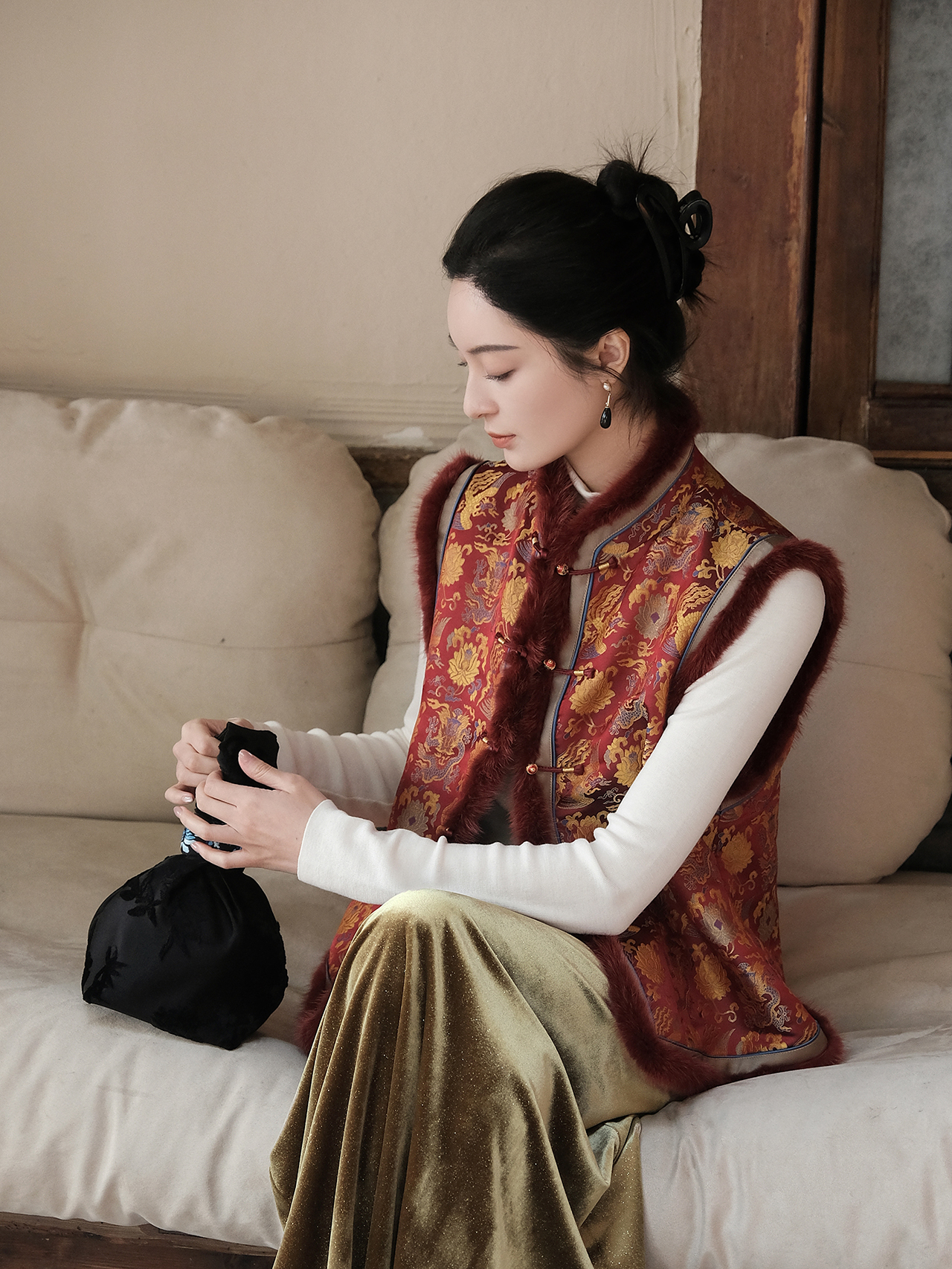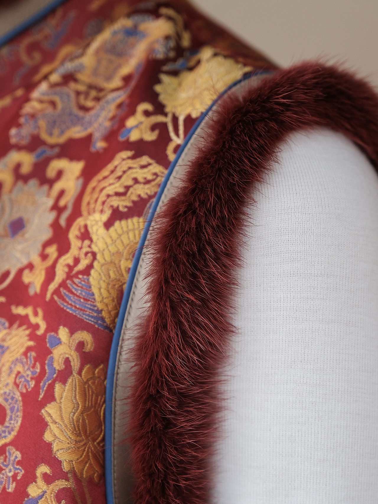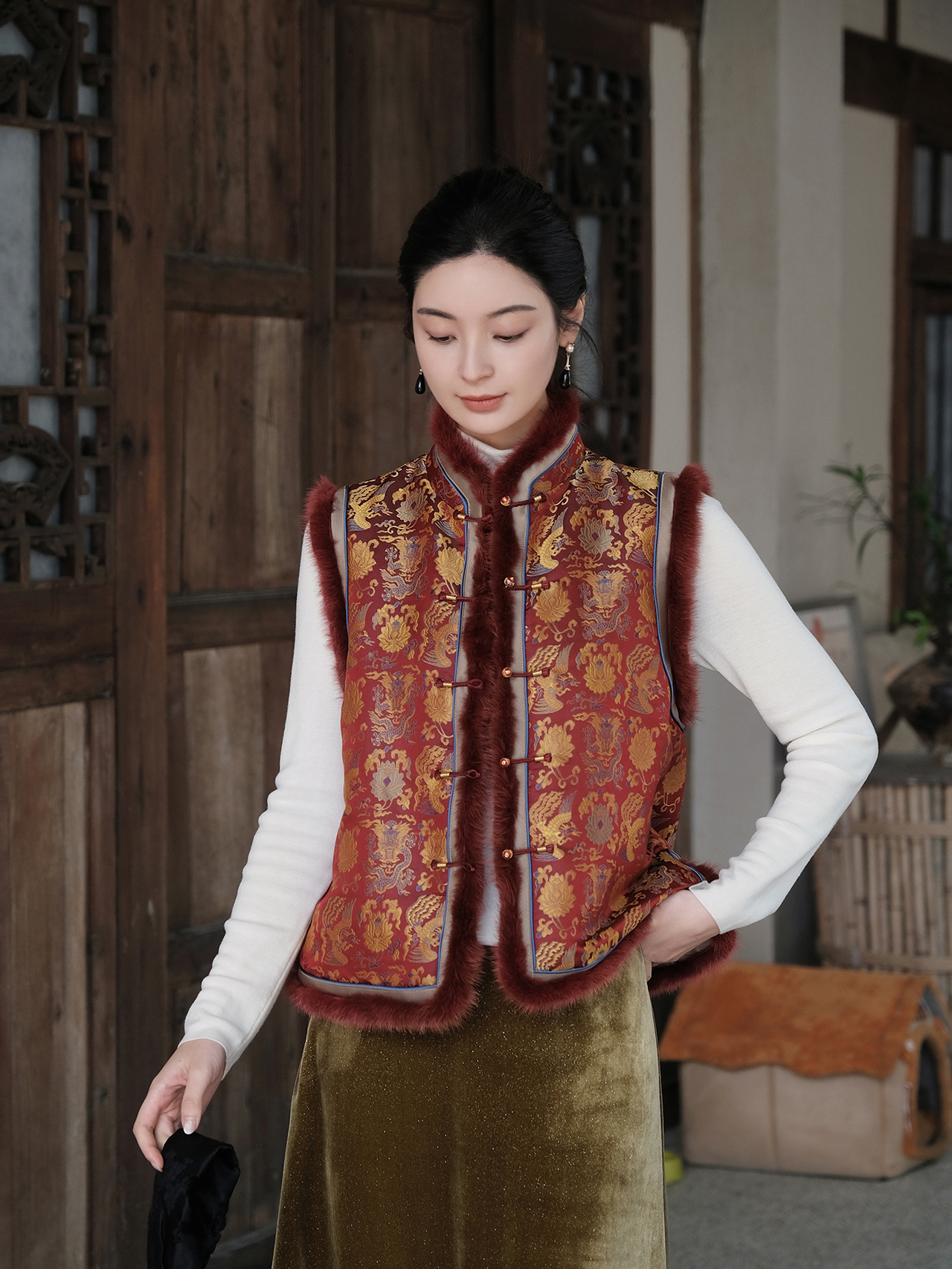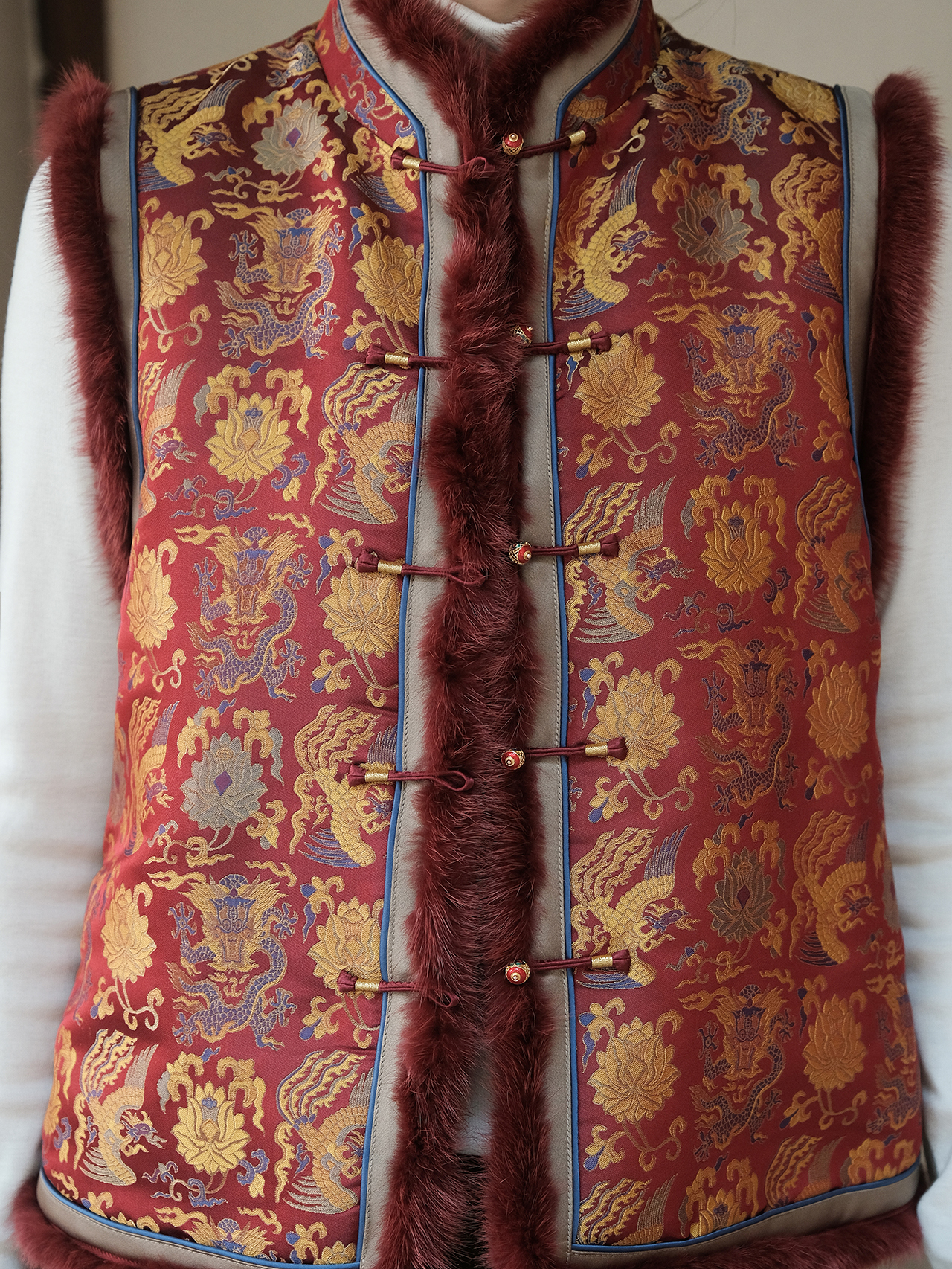 盛唐婧 | 新中式宋锦龙凤穿莲纹夹棉马甲