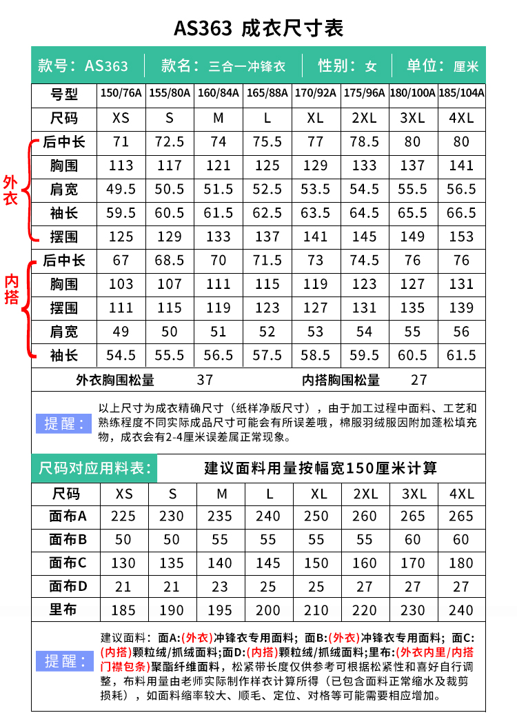 裁缝学苑AS363三防冲锋衣纸样女装防风防水外套三合一登山服样板