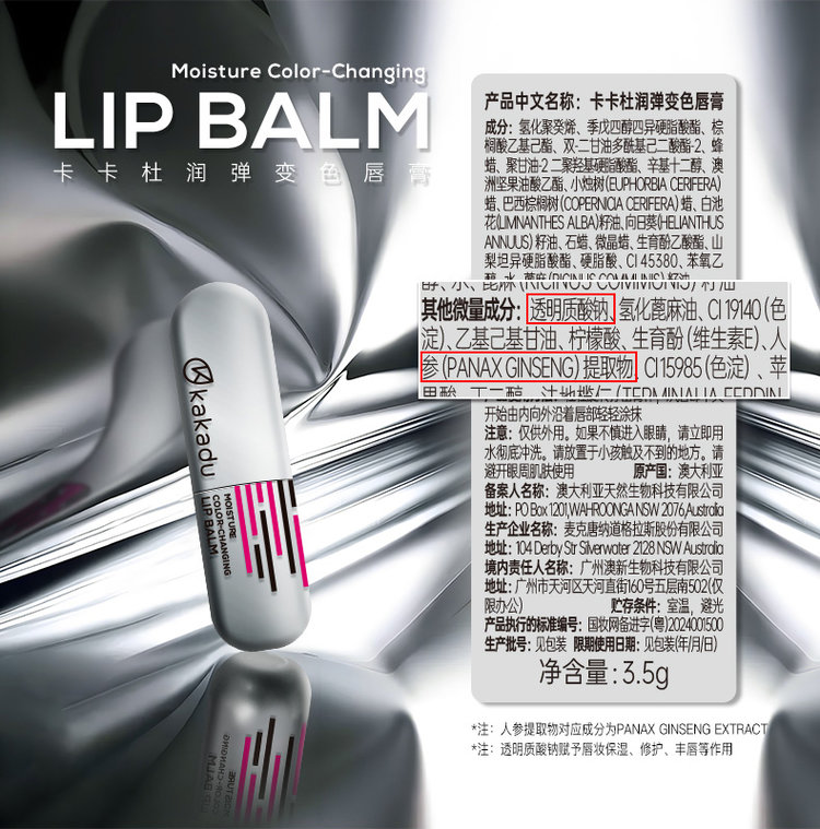 【品名】卡卡杜润弹变色唇膏 【规格】3.5g*2支装 【生产日期】2025.05.08 【保质期】3年 【储存方法】请置于阴凉干燥处,避免阳光直射 【原产国】澳大利亚 【发货地】广州 【发货快递】圆通/申通/韵达/中通随机 【不发货区域】新疆,西藏,港澳台地区不发 【发货时效】48小时,节假日顺延 【使用方法】轻轻旋转拧出膏体,从唇部中央开始由内向外沿着唇部轻轻涂抹 【注意】仅供外用。如果不慎进入眼睛请立即用水彻底冲洗。请放置于小孩触及不到的地方。避开眼周肌肤使用。 |