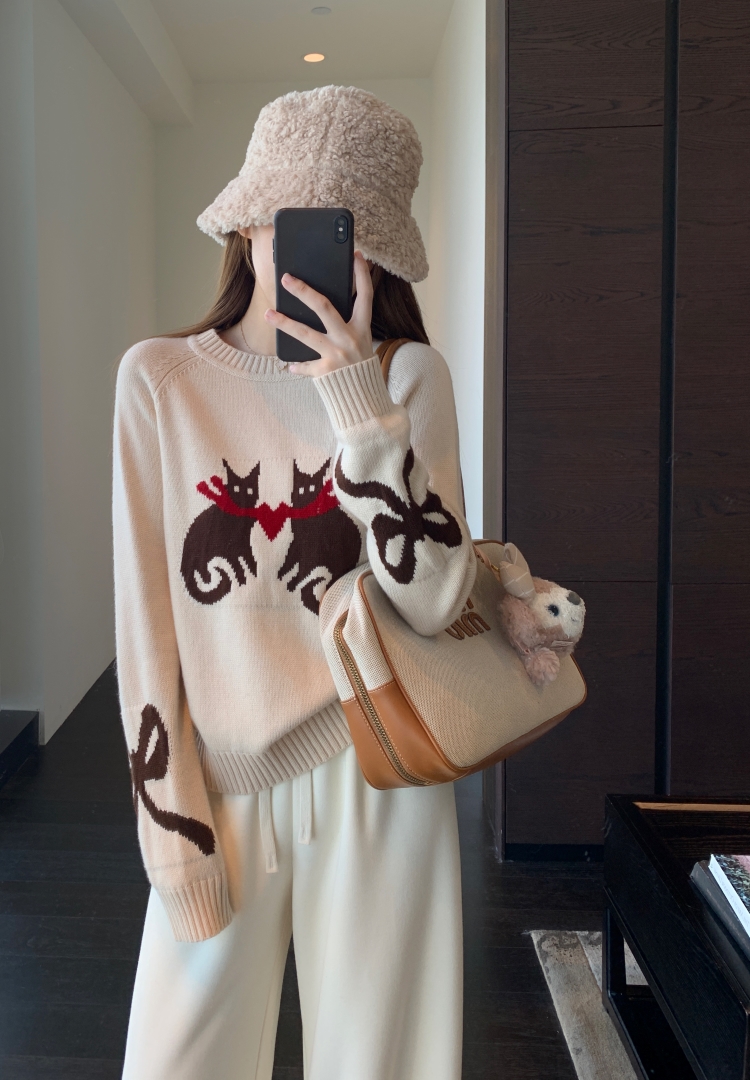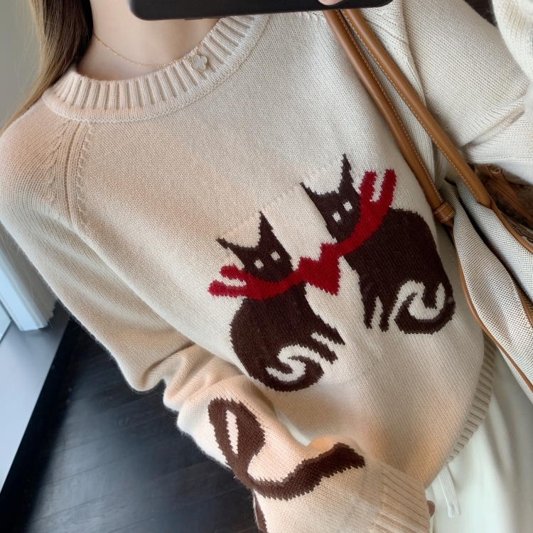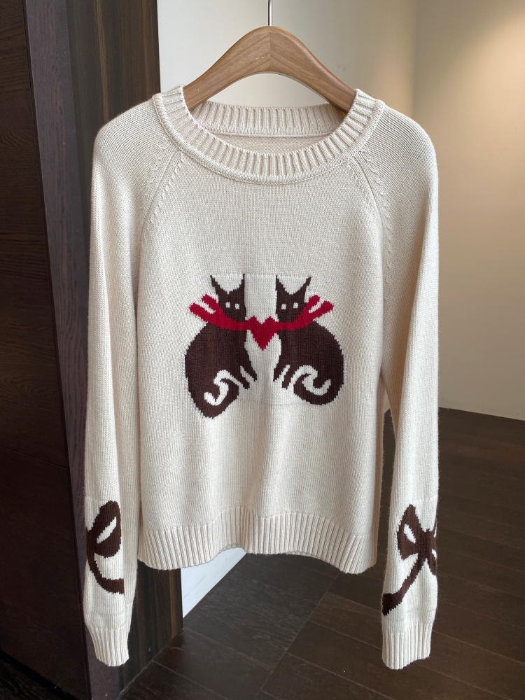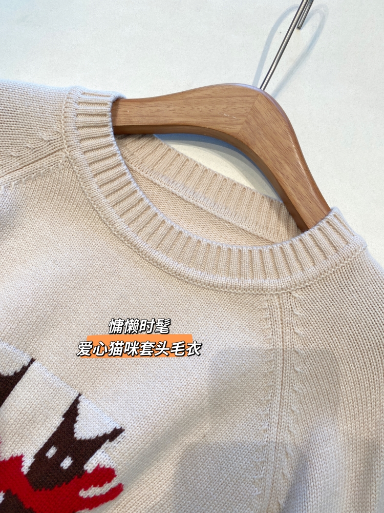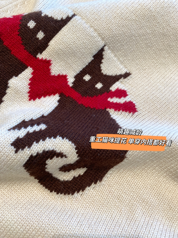 前胸做了艺术感撞色猫咪提花,红围巾与爱心元素点睛