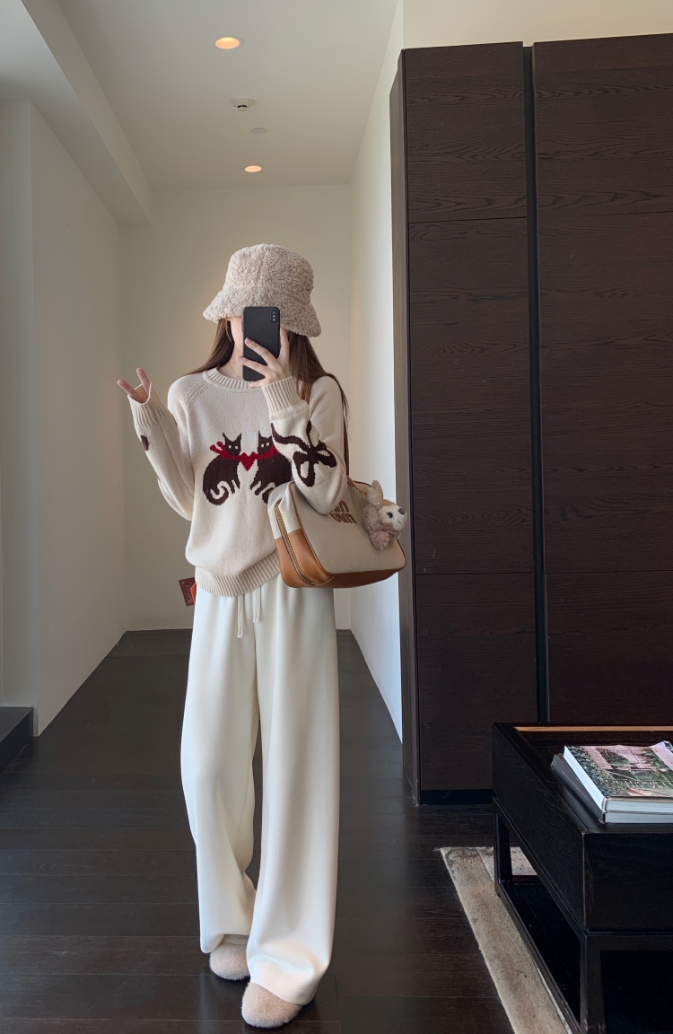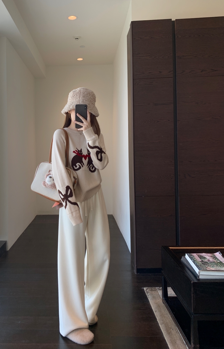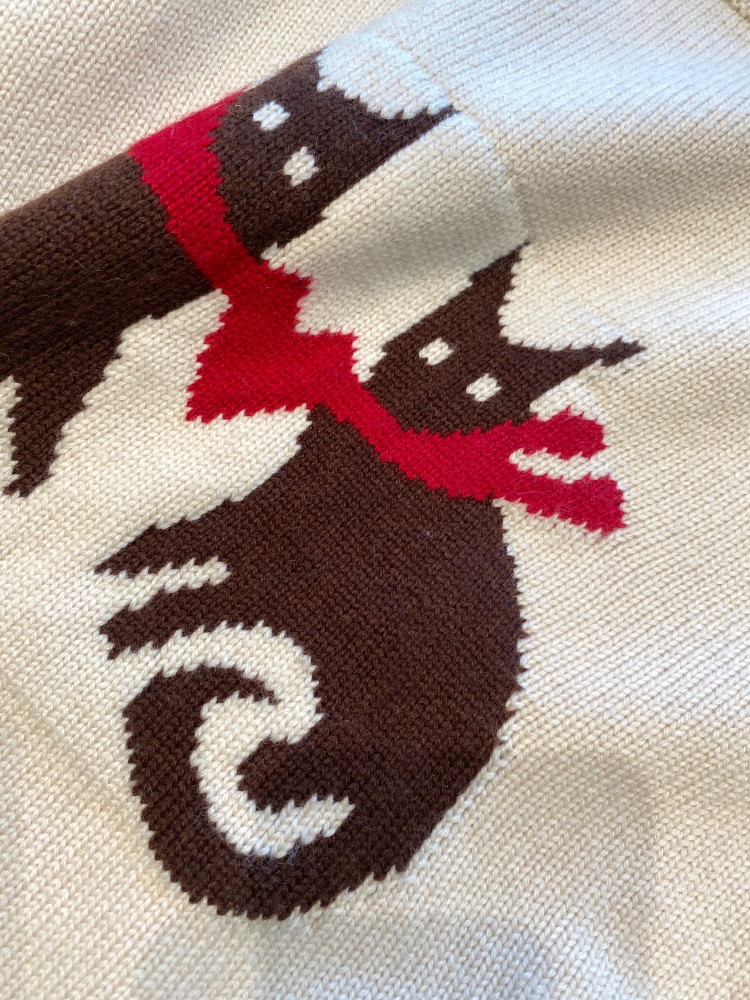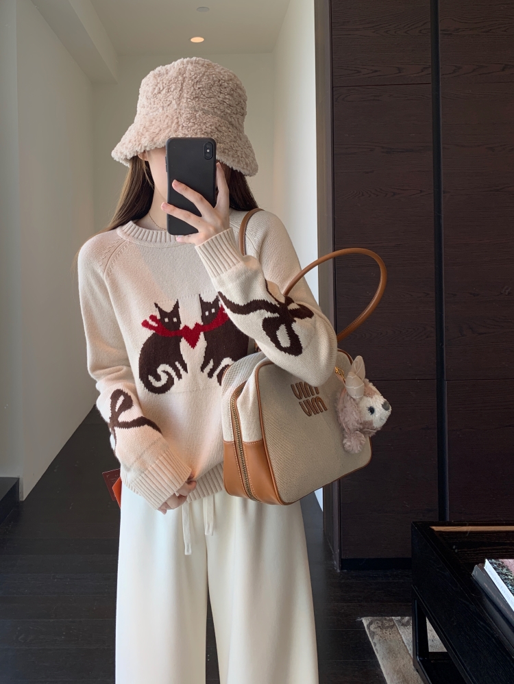 前胸做了艺术感撞色猫咪提花,红围巾与爱心元素点睛