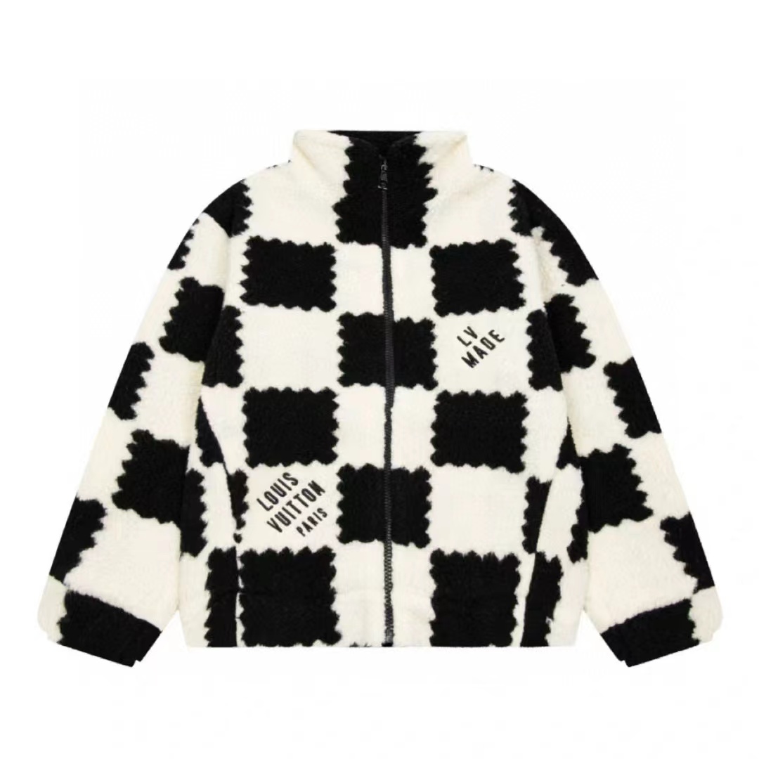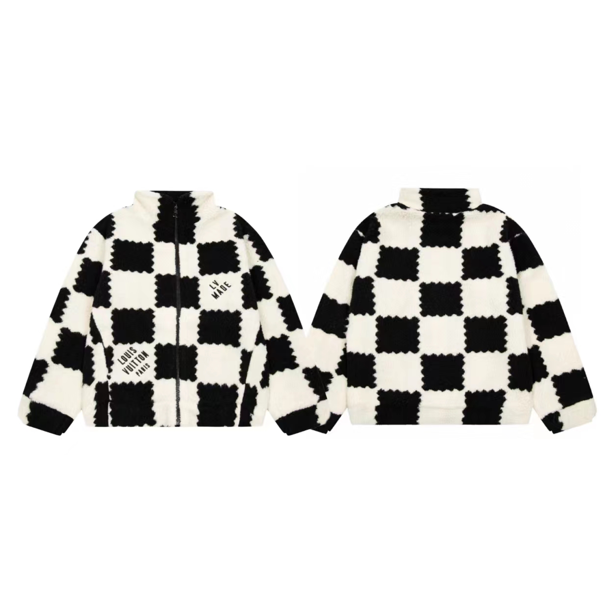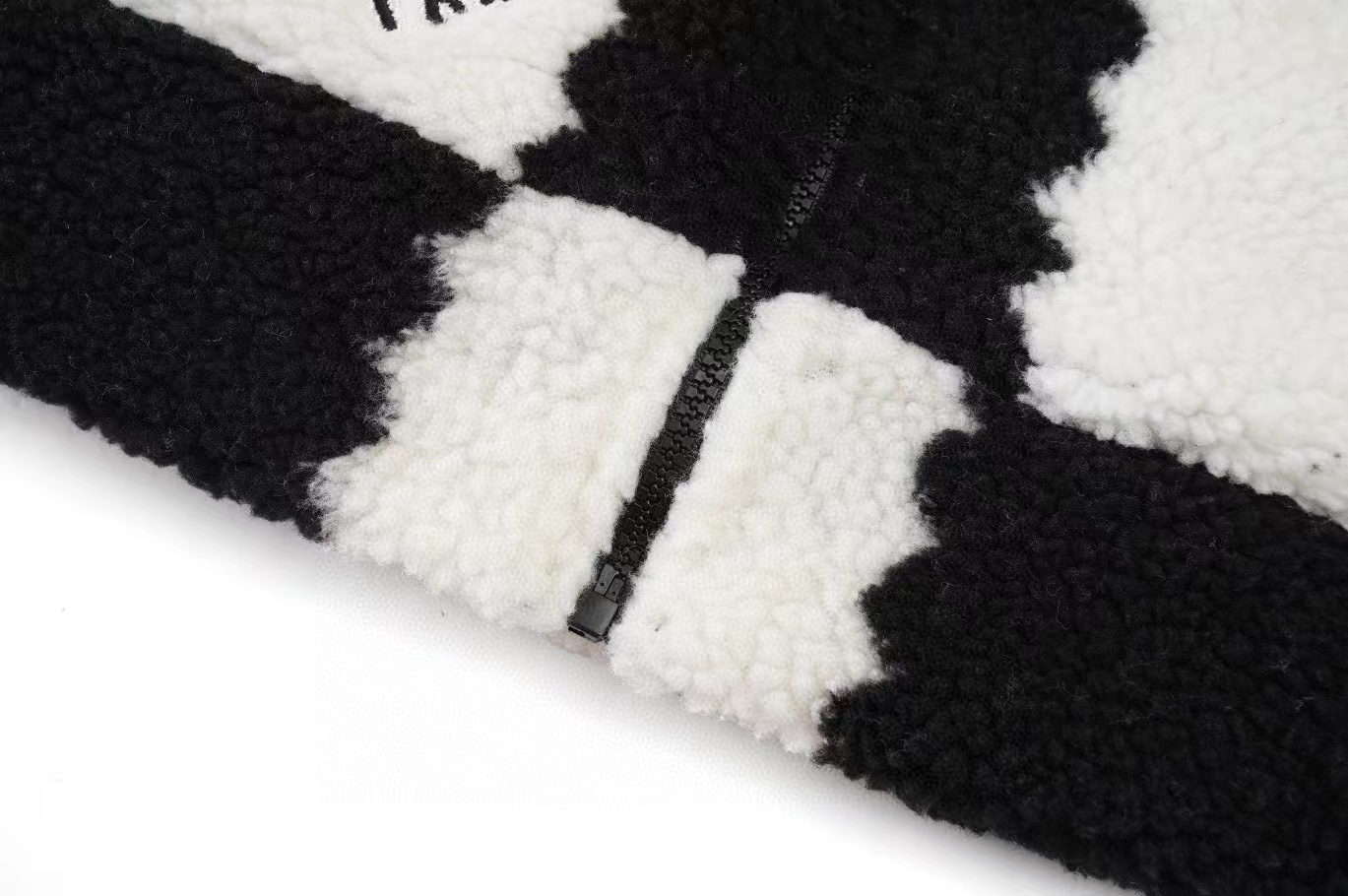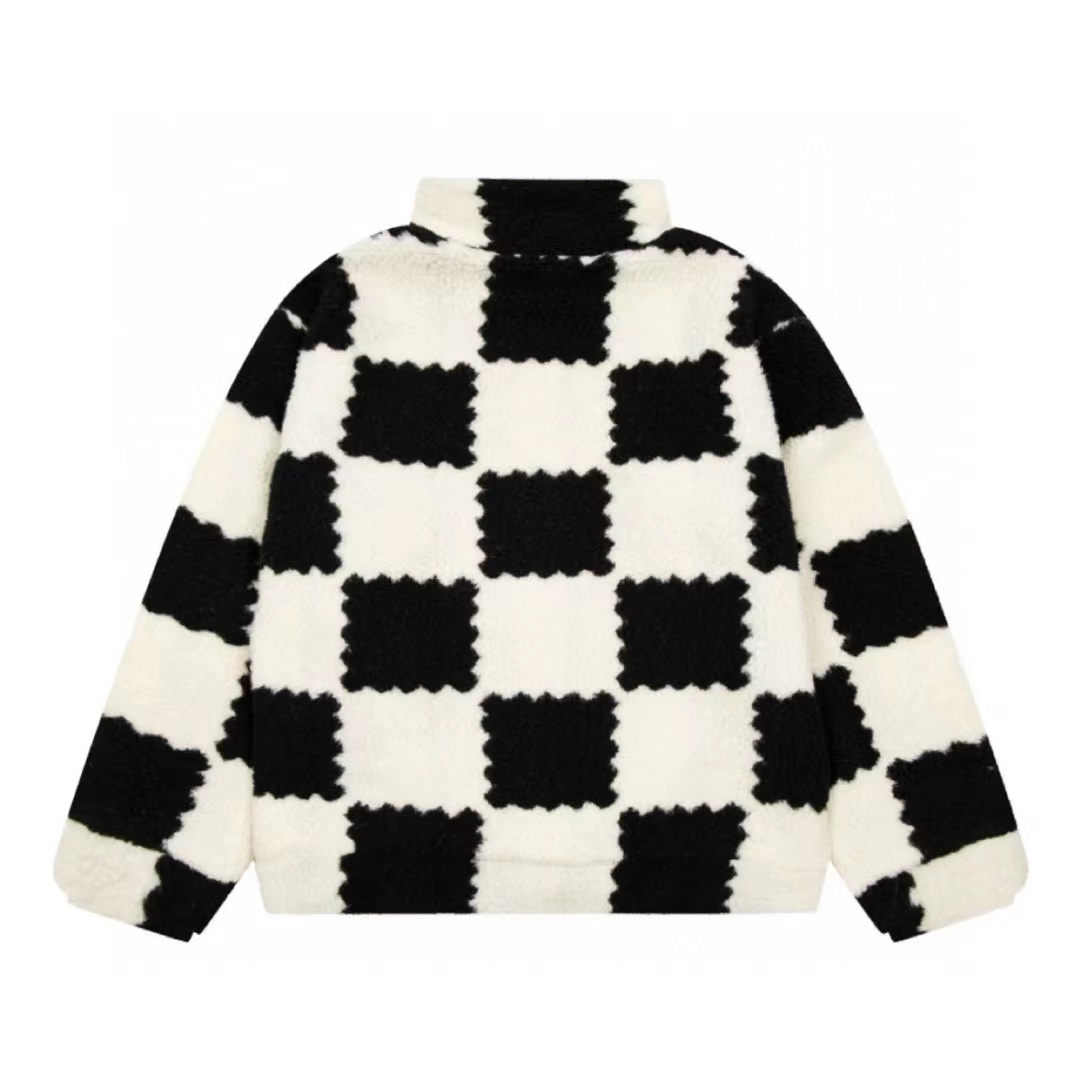 联名款棋盘格子刺绣 logo 字母情侣立领羊羔毛外套 定制科技绵羊毛混纺摇粒绒面料 由 55% 聚酯纤维和 45% 羊毛混纺而成 搭配针织内衬和内袋 整件手感舒适 上身透气且具备超强保暖性 棋盘格纹图案定制 对色染毛格子提花编织 织毛 拉毛 梳毛 剪毛等 并且精工对位剪裁 整衣剪毛使表面毛长一致 成品蓬松具有立体感 宽松廓形剪裁 显瘦不挑人