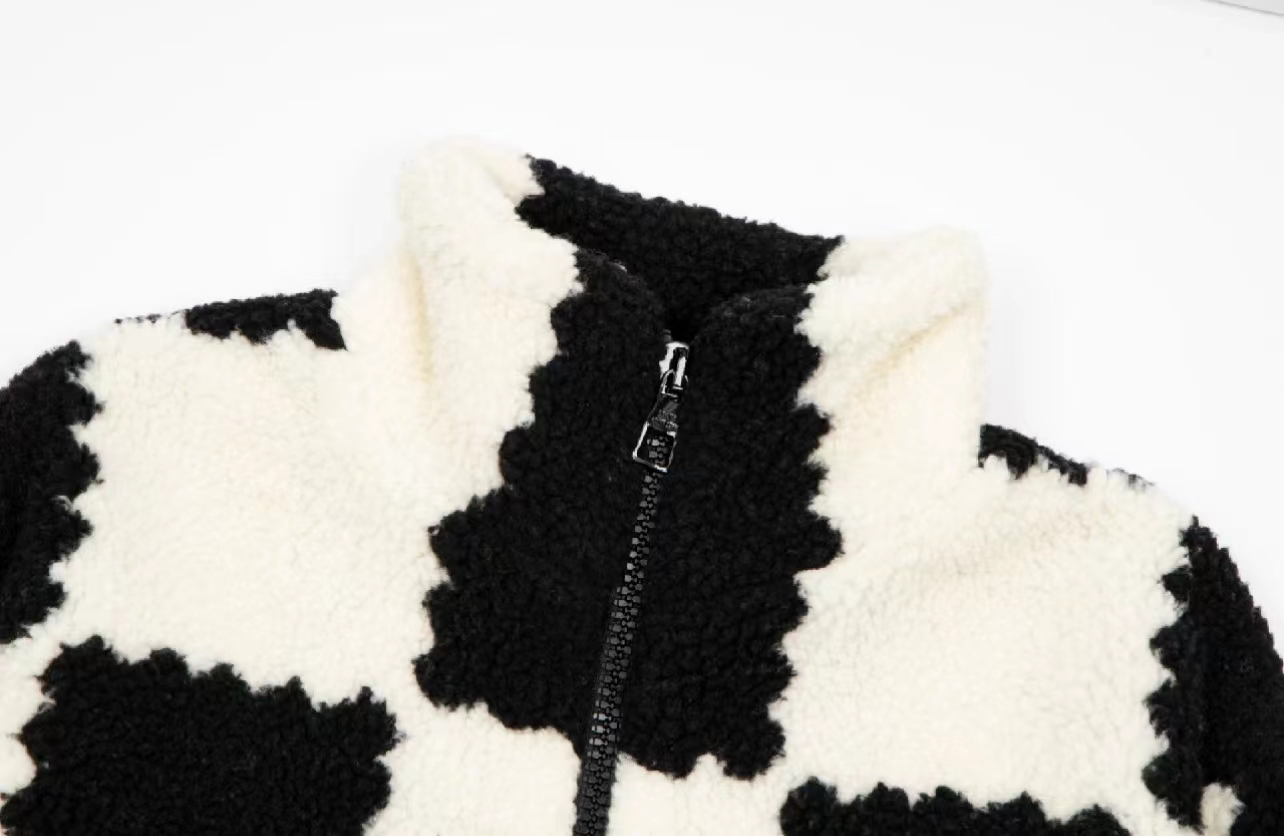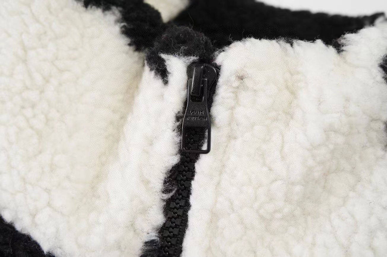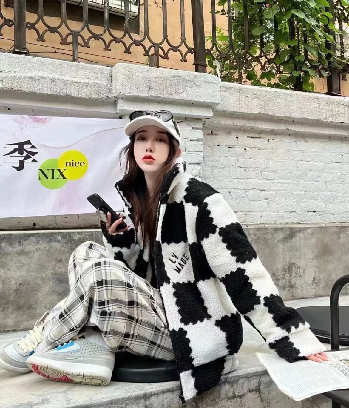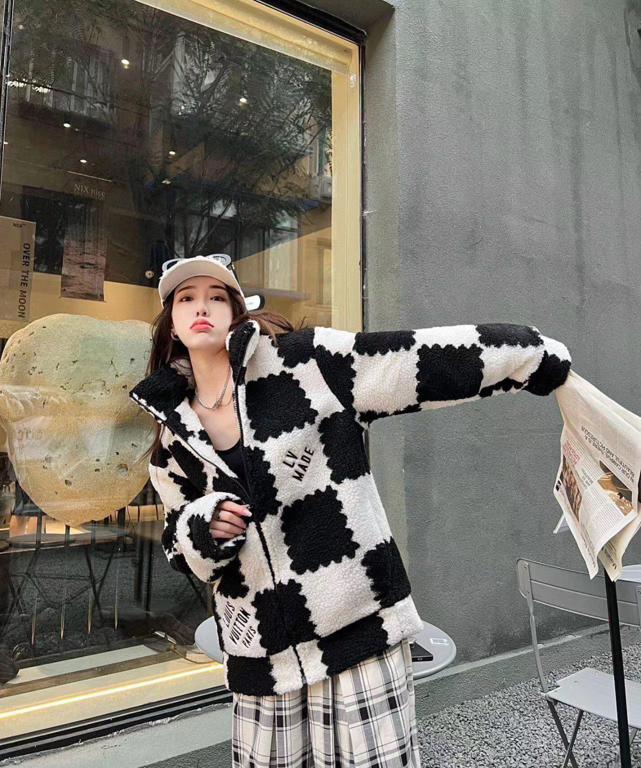 联名款棋盘格子刺绣 logo 字母情侣立领羊羔毛外套 定制科技绵羊毛混纺摇粒绒面料 由 55% 聚酯纤维和 45% 羊毛混纺而成 搭配针织内衬和内袋 整件手感舒适 上身透气且具备超强保暖性 棋盘格纹图案定制 对色染毛格子提花编织 织毛 拉毛 梳毛 剪毛等 并且精工对位剪裁 整衣剪毛使表面毛长一致 成品蓬松具有立体感 宽松廓形剪裁 显瘦不挑人