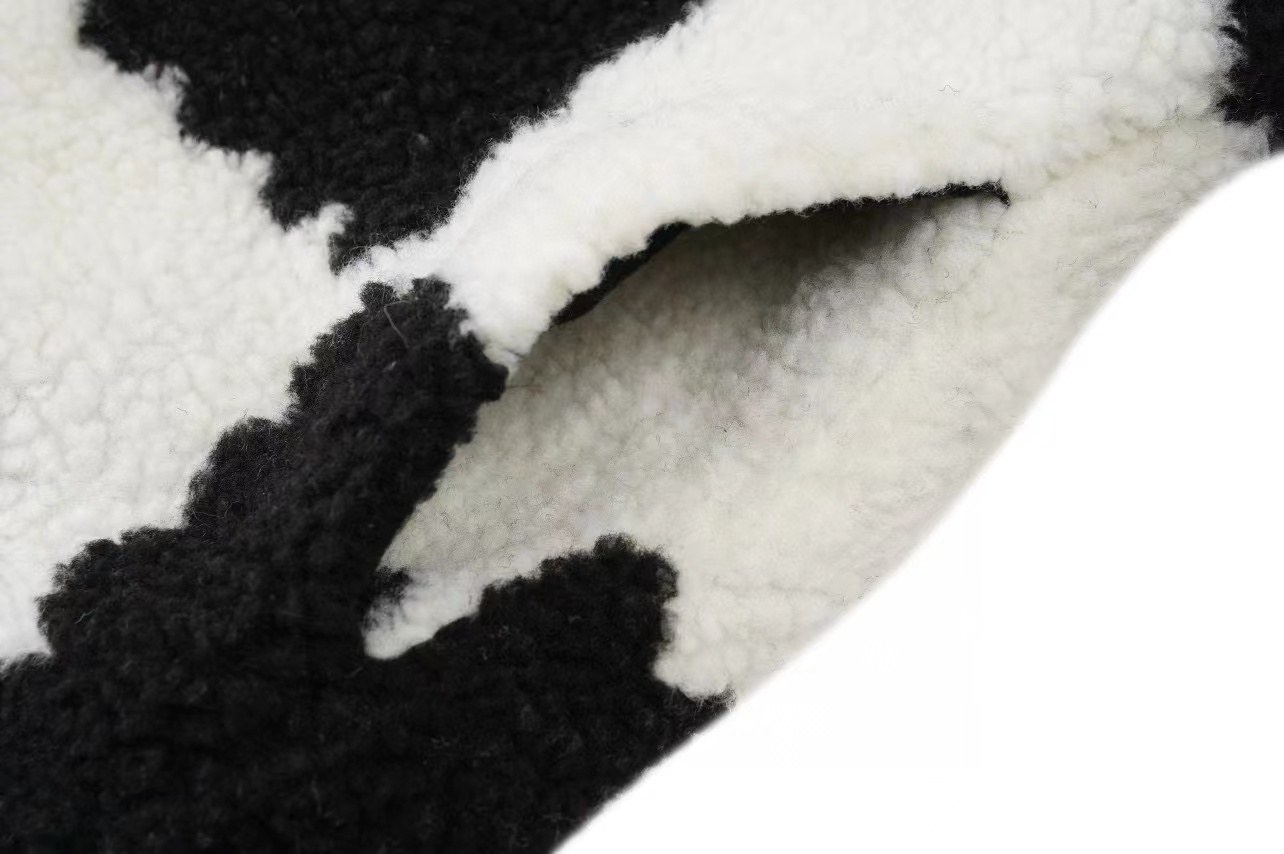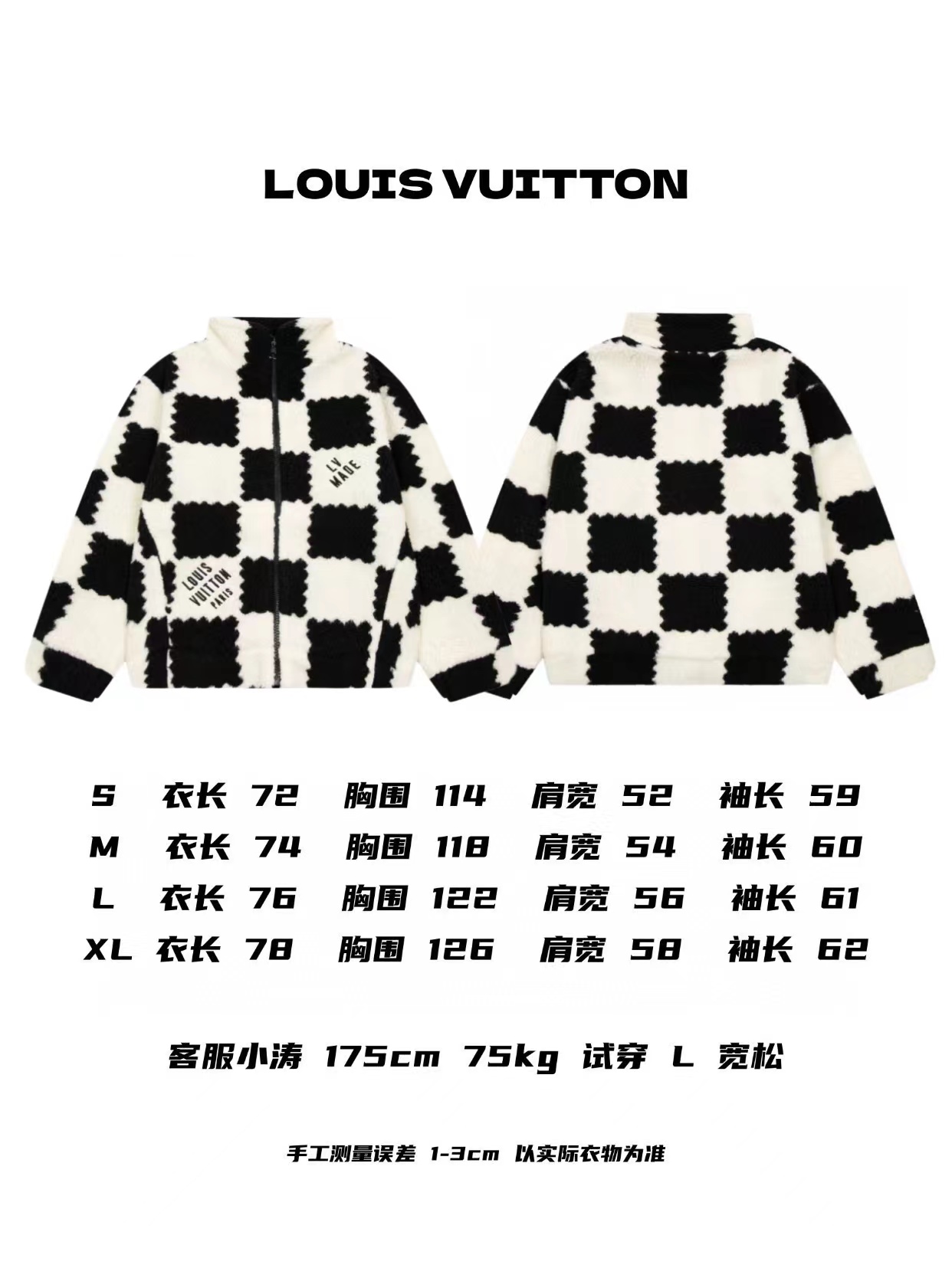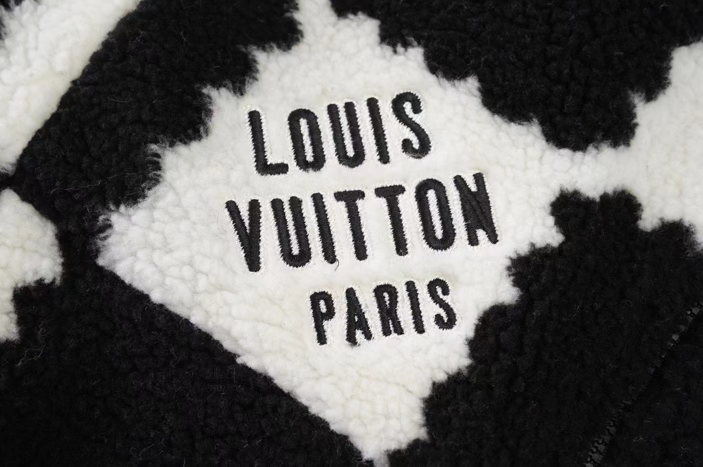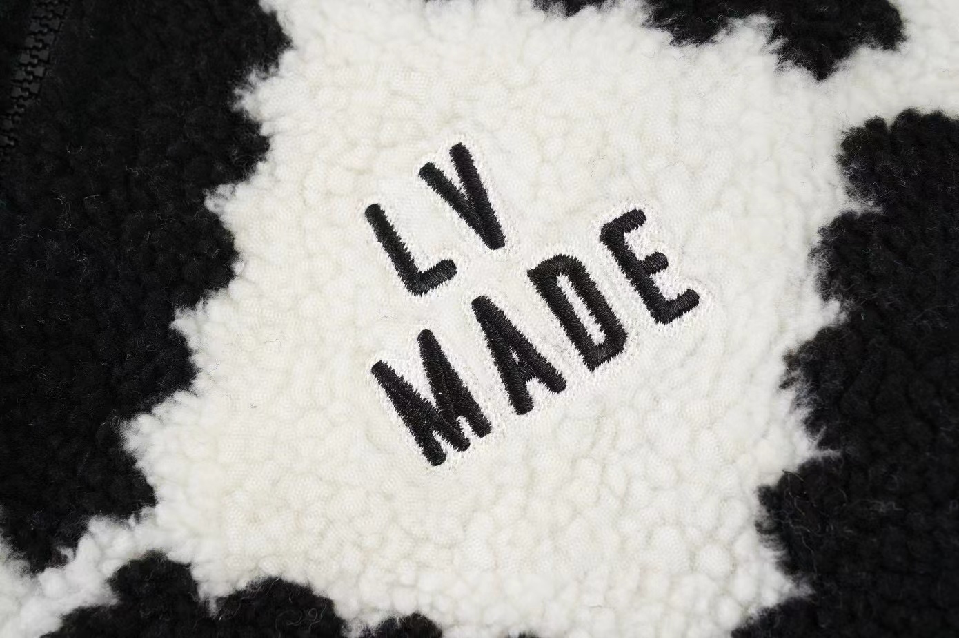 联名款棋盘格子刺绣 logo 字母情侣立领羊羔毛外套 定制科技绵羊毛混纺摇粒绒面料 由 55% 聚酯纤维和 45% 羊毛混纺而成 搭配针织内衬和内袋 整件手感舒适 上身透气且具备超强保暖性 棋盘格纹图案定制 对色染毛格子提花编织 织毛 拉毛 梳毛 剪毛等 并且精工对位剪裁 整衣剪毛使表面毛长一致 成品蓬松具有立体感 宽松廓形剪裁 显瘦不挑人