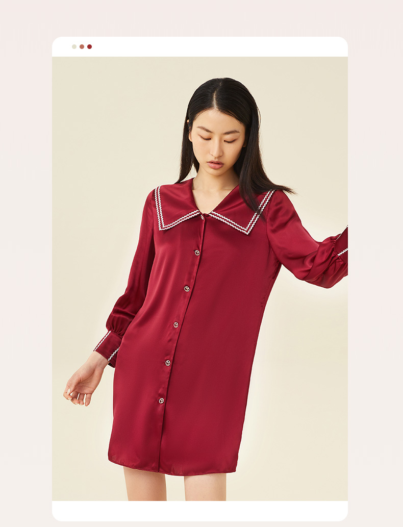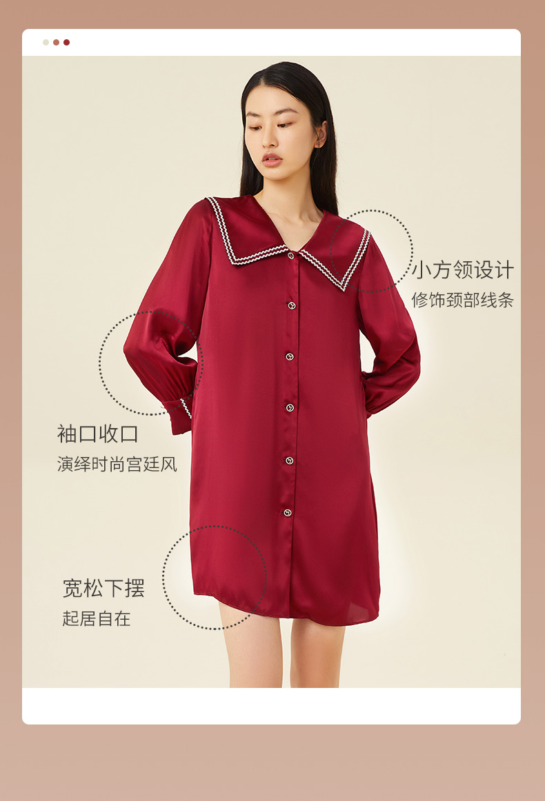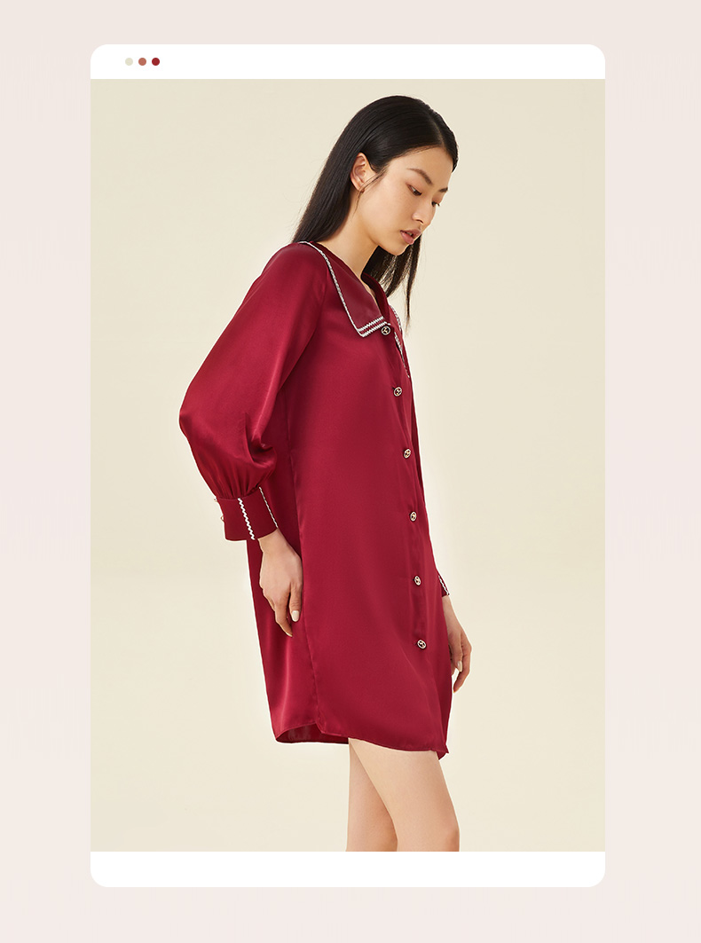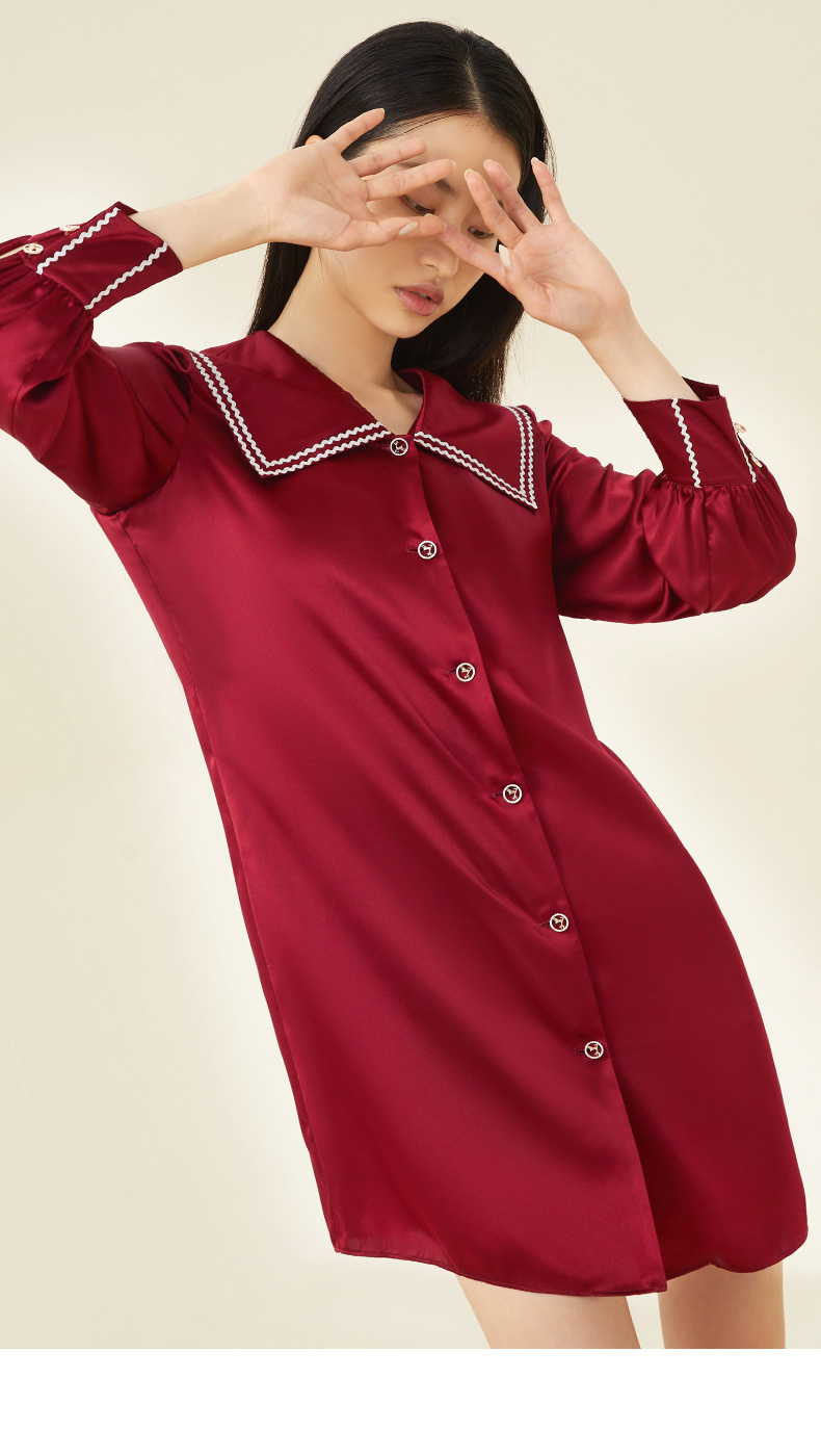 金三塔100%桑蚕丝 丝滑凉感 小香风衬衫式女士真丝翻领睡裙家居服 YSFCC302