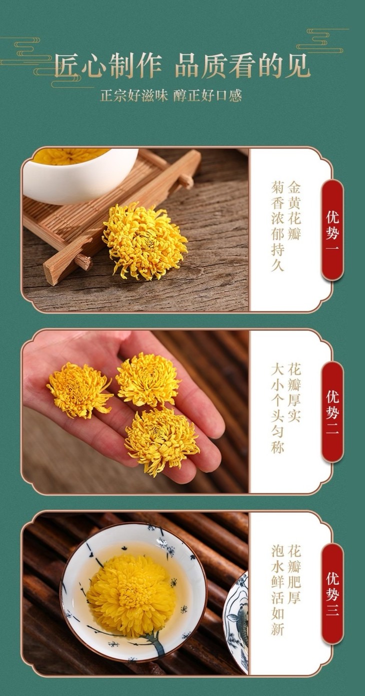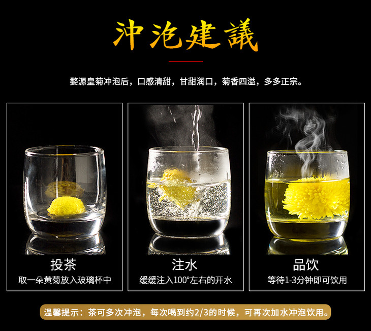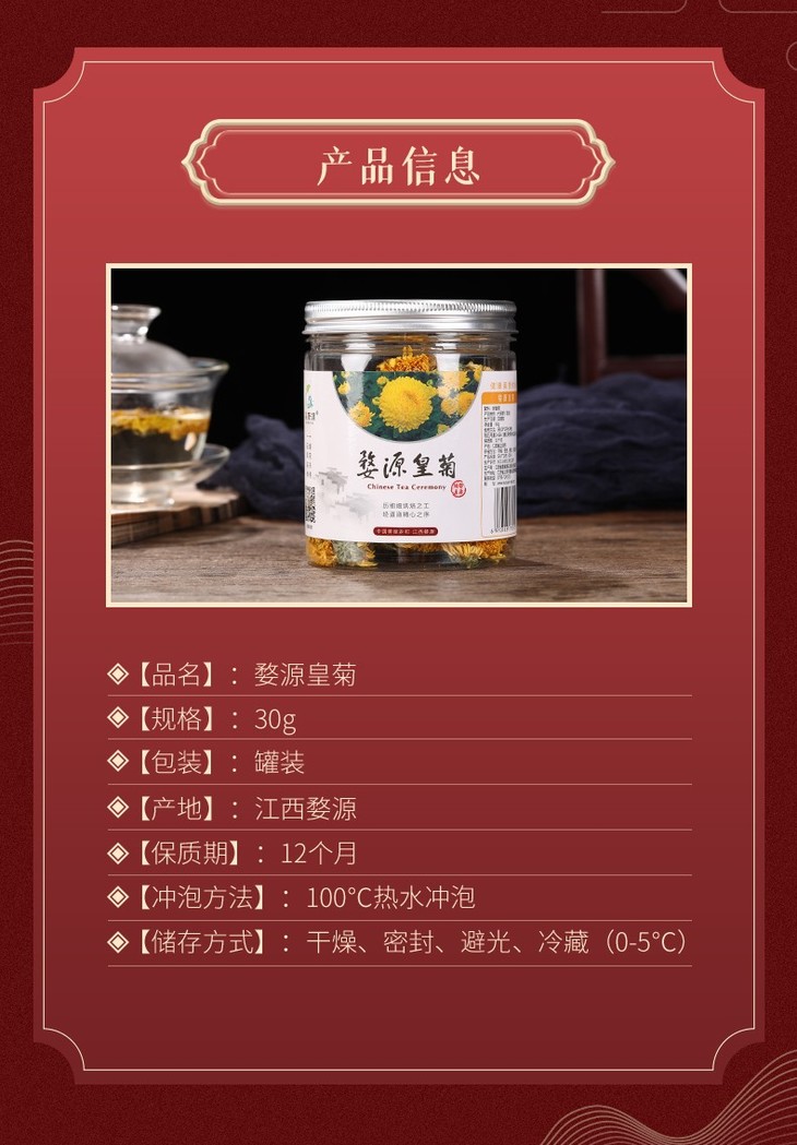 我也给大家挑了一级和二级两种规格,一级皇菊是铁盒装,25朵独立包装,更大更美丽。二级是罐装,共有30g,自己平时喝喝完全可以,也更划算!皇菊的冲泡过程也蛮享受的,加入沸水,静置片刻,便能看到花朵在杯中完整绽放,真的蛮美!品上一口,口感微甜润滑,带着淡淡的菊花清香,让人心旷神怡!如果担心菊花有点寒凉,可以加枸杞、桂圆、红枣等一起冲泡,更温补一些;如果上火严重,也可以和绿茶一起,双管齐下!