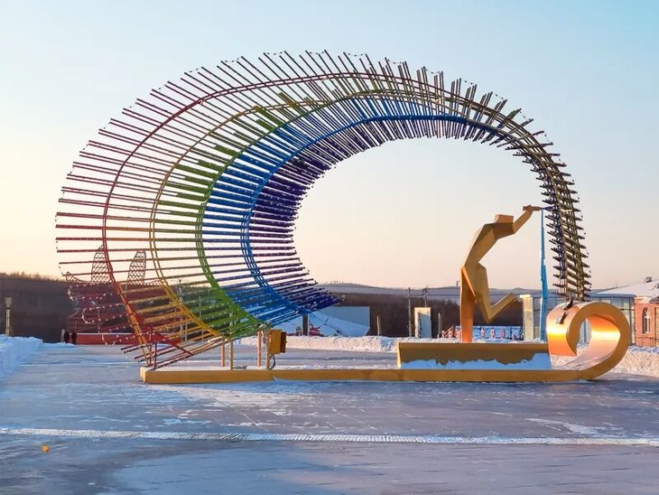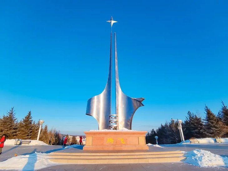 位于153个台阶至上的北极星雕塑是漠河县的标志性建筑,名为腾飞。左面是一只展翅欲飞的天鹅,右面是一只引吭高歌的金鸡,意为漠河是“金鸡之冠、天鹅之首”,最顶端的星位北极星,意为漠河是祖国北陲的一颗璀璨明星。