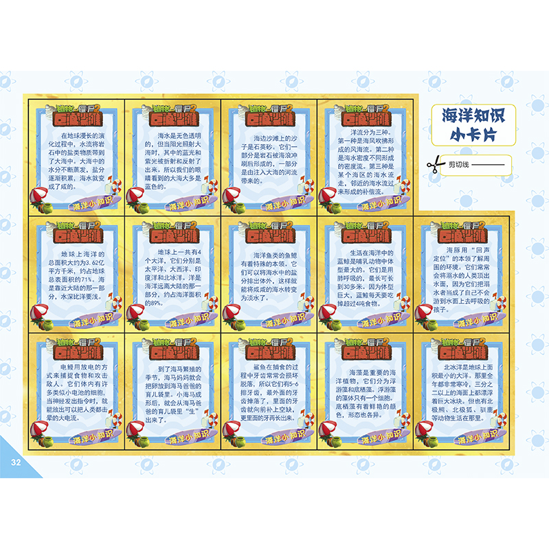 内容推荐:《植物大战僵尸2奇妙时空之旅酷手工·巨浪沙滩冲浪赛》利用风靡全球的电脑游戏“植物大战僵尸2”中的素材设计制作。小读者可用附赠的剪刀和双面胶制作2个立体的植物形象,2个立体的僵尸形象,1个海边度假场景,1个海上冲浪场景,1张冲浪立体卡片和14张正面为计算游戏反面为海洋知识的卡牌,让小读者不出家门,即可了解海洋知识,体验新鲜刺激的冲浪游戏。