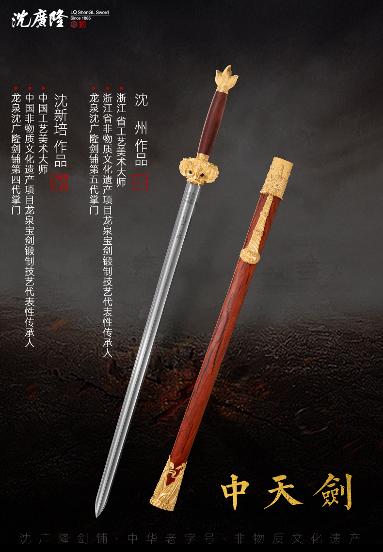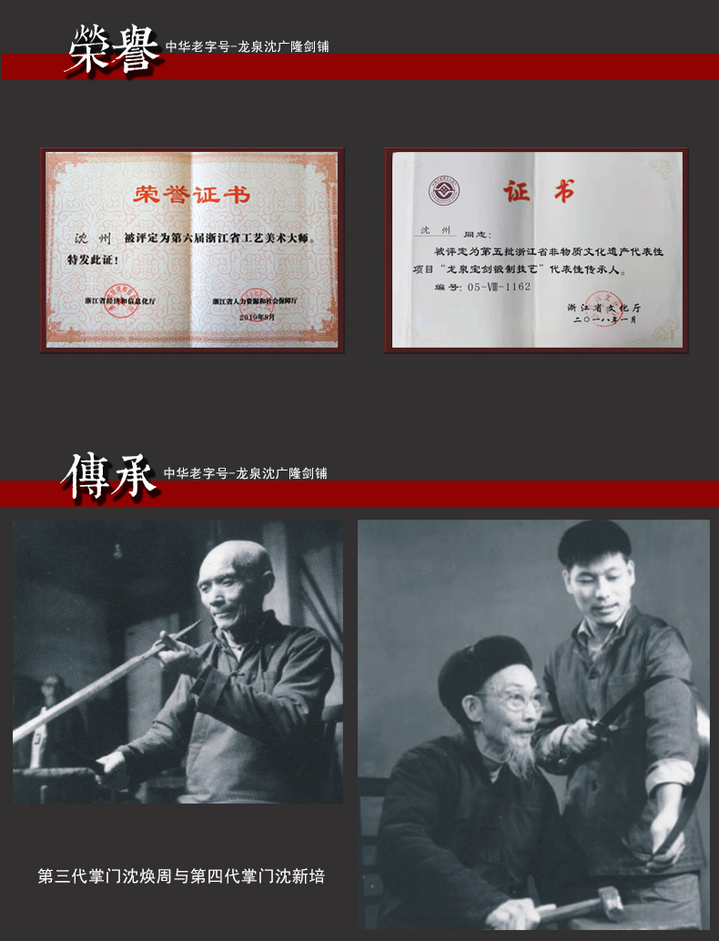 - 龙泉沈广隆剑舖创始于1885年(清光绪)位于浙江省龙泉市,是当地唯一一家“子承父业”一脉相承的中华老字号宝剑生产企业,是国家级非物质文化遗产龙泉宝剑项目保护单位,并以“天下第一剑”闻名于海内外....