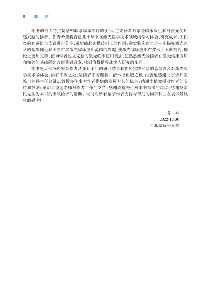 龚 卓,副教授,先后于北京协和医院激光医学中心和北京协和医院口腔科从事激光医学的基础研究和临床应用工作。在激光医学中心工作期间,长期与中国科学院物理研究所、光学精密机械研究所、电子学研究所、研究生院等单位合作开展激光临床应用的基础研究,同时协助院内其他科室,如普通外科、泌尿外科、脑外科、妇科、耳鼻喉科、口腔科、皮肤科等,开展激光临床应用,发表相关学术论文数十篇。在激光的临床应用和相关基础研究过程中,积累了丰富的激光临床应用经验。对激光的组织特性、临床应用特点、照射技术等有深入的研究。在激光临床应用技术领域,从基本概念、基础理论到实际应用和照射操作技术方面归纳了较为完整的知识体系,为激光医学技术的系统化和规范化做出了突出贡献。