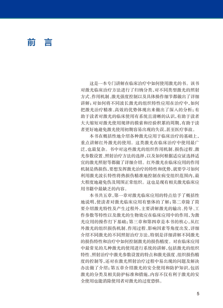 本书主要介绍在临床治疗中使用最广泛的红外激光。不仅包括连续和脉冲输出型,还包括常用波长的各类激光。结合激光波长的物理和生物特性、激光参数的组织特性,对激光的损伤机制、过程、结果进行深刻详细的分析、讲解。将不同波长激光的损伤特性,照射方法分门别类地进行分析、讲解。结合激光的波长、输出方式,传输方式、参数特性以及激光适应症,讲解如何根据病变选择激光、如何提高激光治疗精度,避免对正常组织的损伤,使激光治疗的优势得以充分发挥,让读者在实践操作中真正体会到使用激光的妙处。另外,本书还选择了最普及最具代表性的几种激光,分别就波长的生物特性、损伤机制、照射参数的应用、损伤精度的控制,具体照射方法等进行详细讲解。对在临床应用中常出现的问题进行了分析解答。