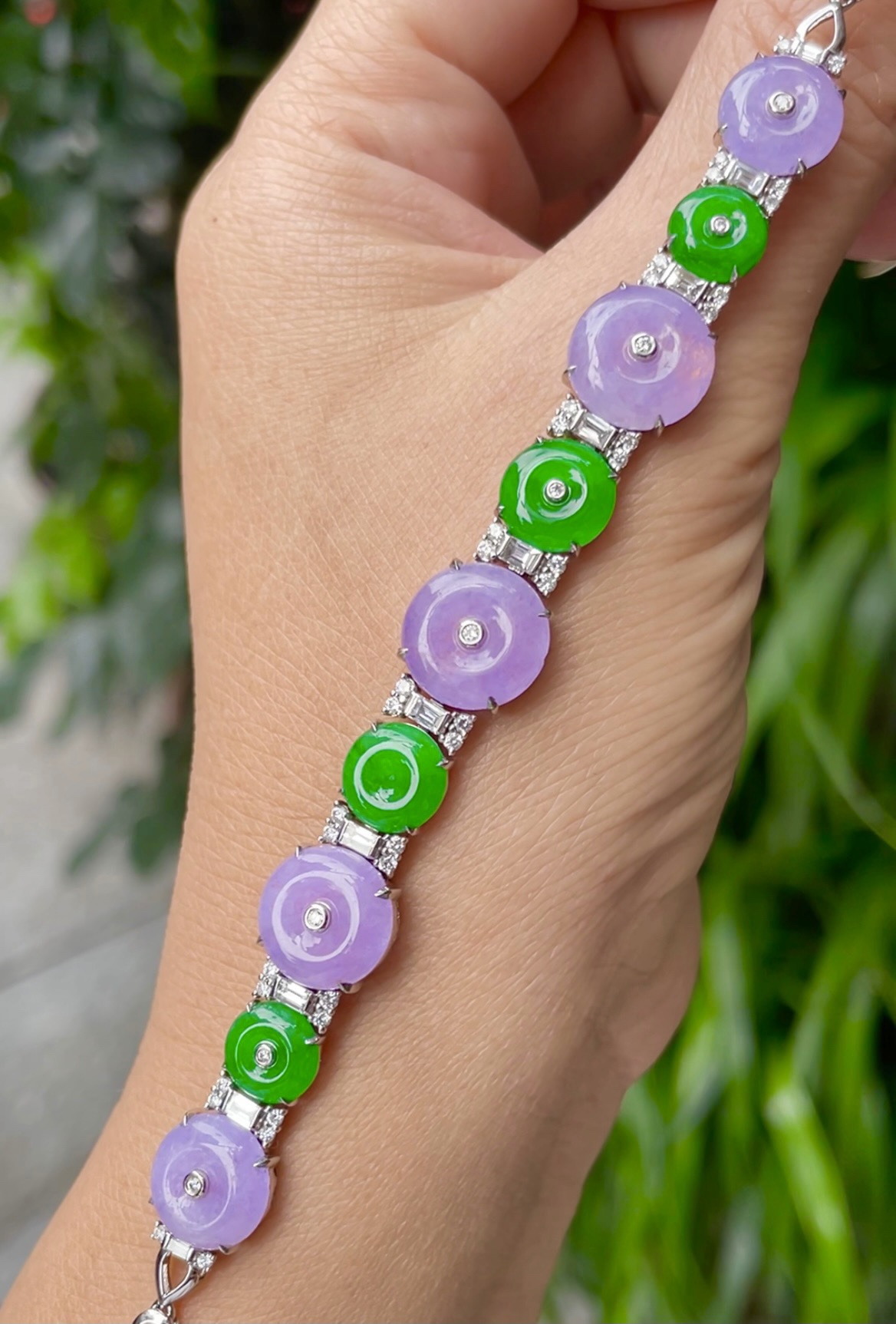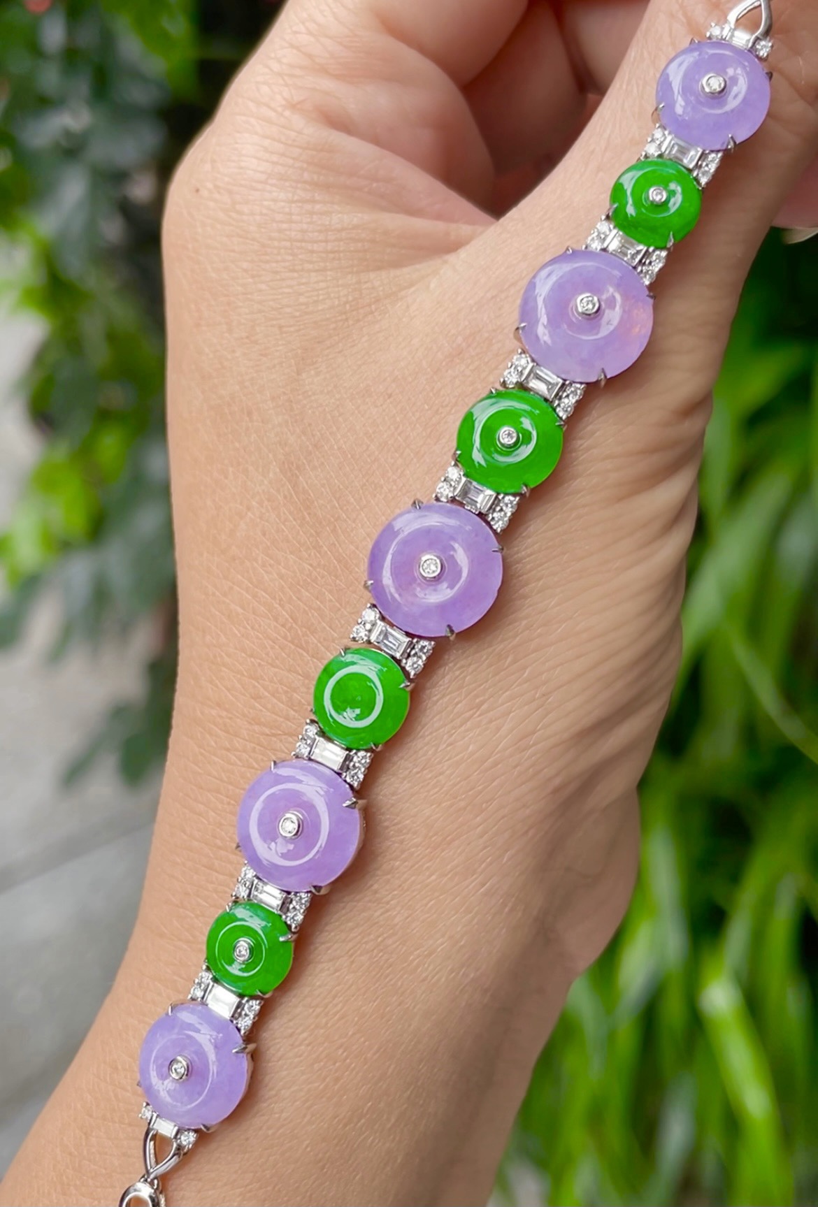 547270 翡翠高冰正阳绿+浓紫罗兰手链 大件饱满,通透水润,玉质细腻,翠色鲜艳,18k金奢华钻石镶嵌 裸石尺寸:10.7-2.4mm约,8.2-2.1mm约 超值价:47480