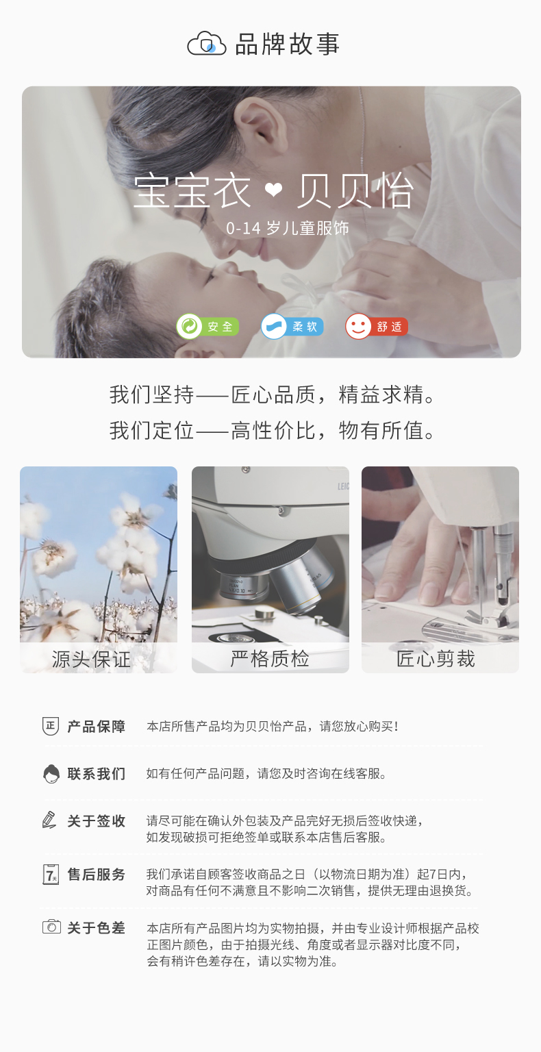 - 贝贝怡专注0-6岁婴幼儿服饰,坚持安全、柔软、舒适的产品理念,为千万中国家庭提供超高品质、安全可靠的婴幼儿服饰产品,妈妈放心,宝宝开心!