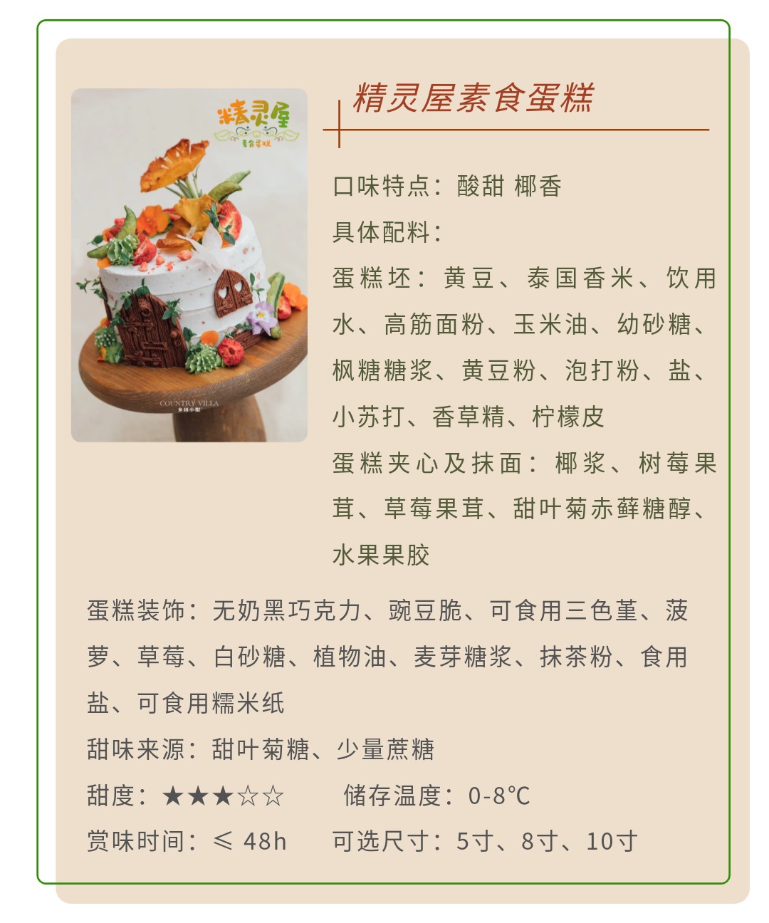 - 一家乡村风蛋糕甜品店。旨在创作高端健康天然的美食。选用甜叶菊赤藓糖,及欧洲进口乳脂制品。当日现做,新鲜柔软。非常健康,适合孩子及老人。