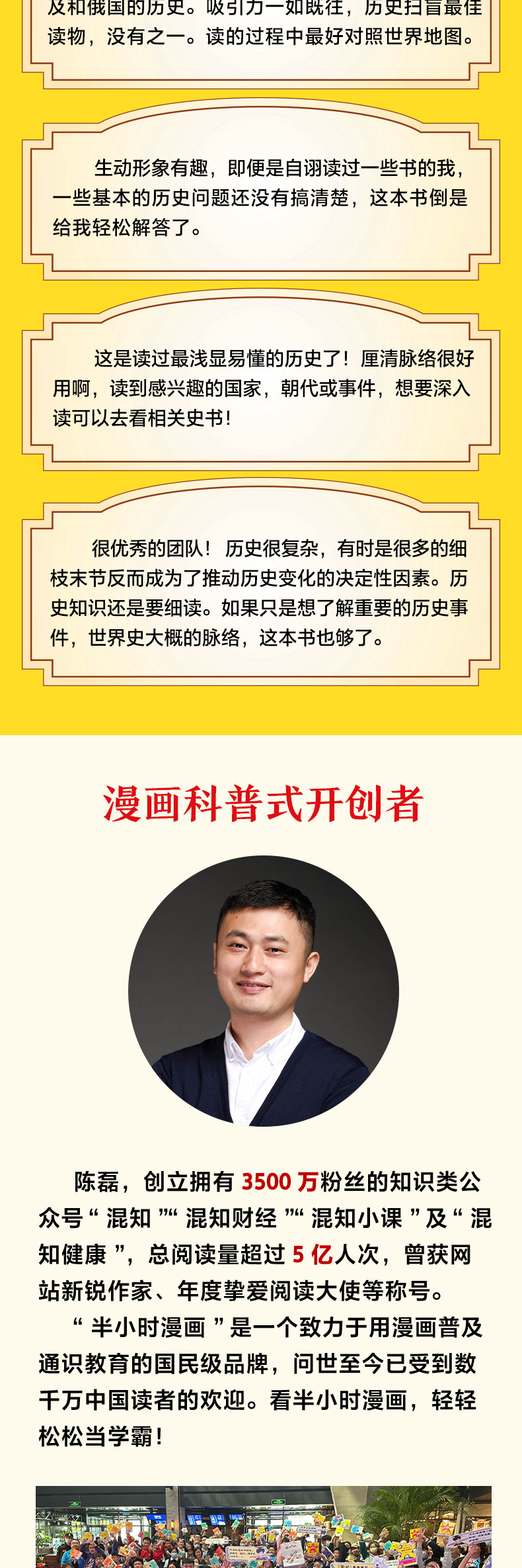 陈磊(混子哥),漫画式科普的开创者,创立拥有3500万粉丝的知识类公众号;混知;混知财经;混知小课及;混知健康,总阅读量超过5亿人次,曾获网站新锐作家、年度挚爱阅读大使等称号。 ?半小时漫画团队;混知,致力用漫画这种视觉化的轻松形式,把一本正经的知识变成有趣又有料的漫画科普书,无论是语文、数学、英语、物理、化学,还是历史、经济、生物、地理,所有搞不明白的知识点,半小时漫画通通帮你在哈哈大笑中轻轻松松搞明白。