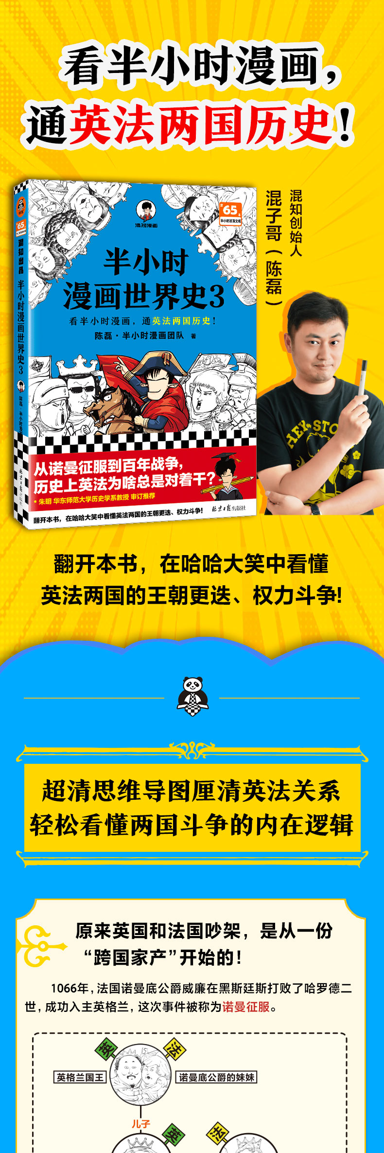 陈磊 (混子哥 )领衔的半小时漫画团队通过诙谐的语言和手绘漫画的形式,轻轻松松把英国史和法国史串起来讲。不枯燥、不费劲,一本书帮你彻底厘清复杂的英法历史!英法两国为啥总是对着干? 不仅仅因为两国的领地纠纷,还因为英法两国是亲戚!血腥玛丽暴行的起因看似是父亲的婚变,其实是宗教冲突。拿破仑充满刺激的人生简单概括为两次登顶、两次落魄,其实可以看成一个金拱门。