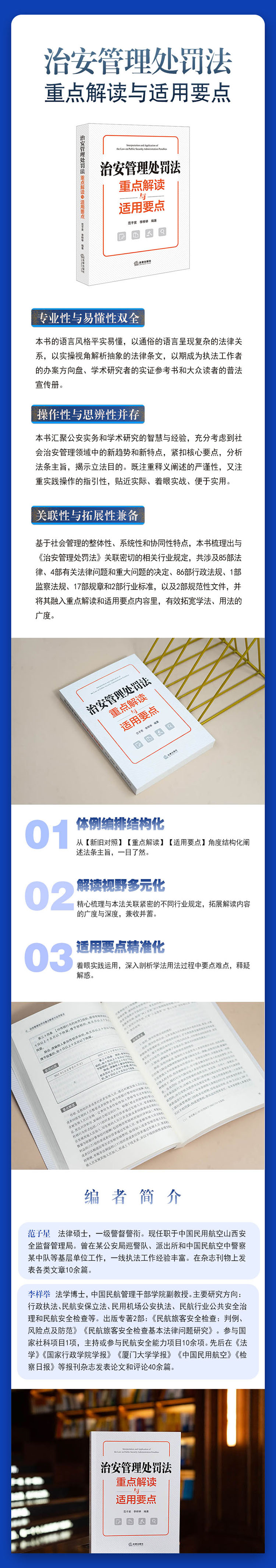 关联性与拓展性兼备。基于社会管理的整体性、系统性和协同性特点,本书梳理出与《治安管理处罚法》关联密切的相关规定,共涉及85部法律、4部有关法律问题和重大问题的决定、86部行政法规、1部监察法规、17部规章、2部行业标准及2部规范性文件,并将其融入重点解读和适用要点内容里,有效拓宽学法、用法的广度。