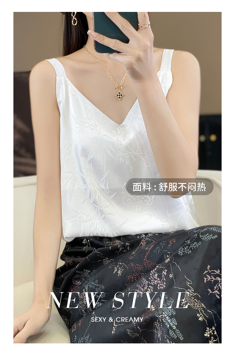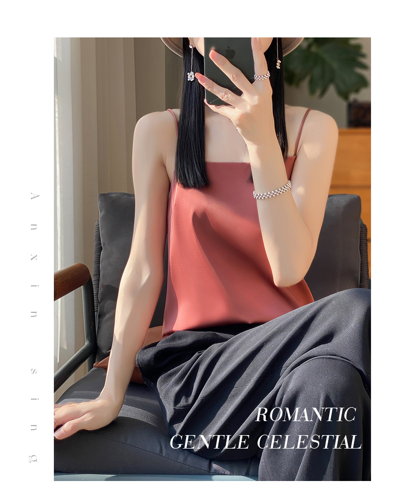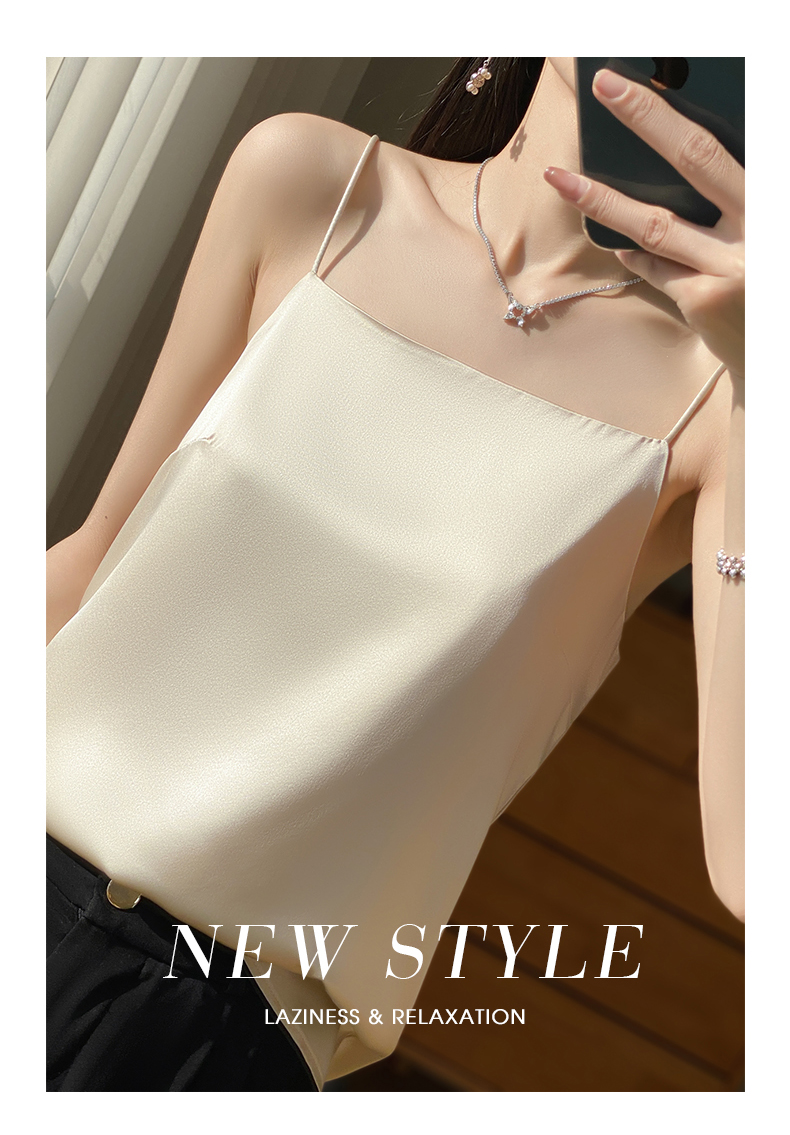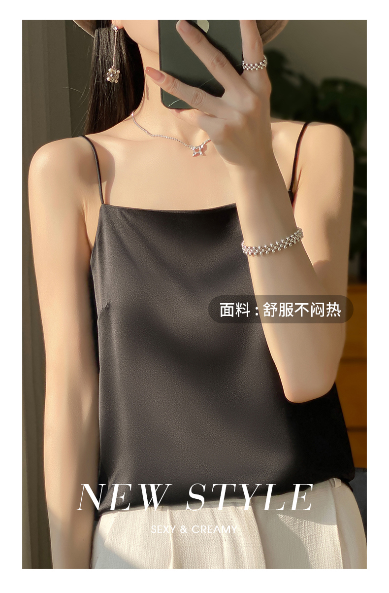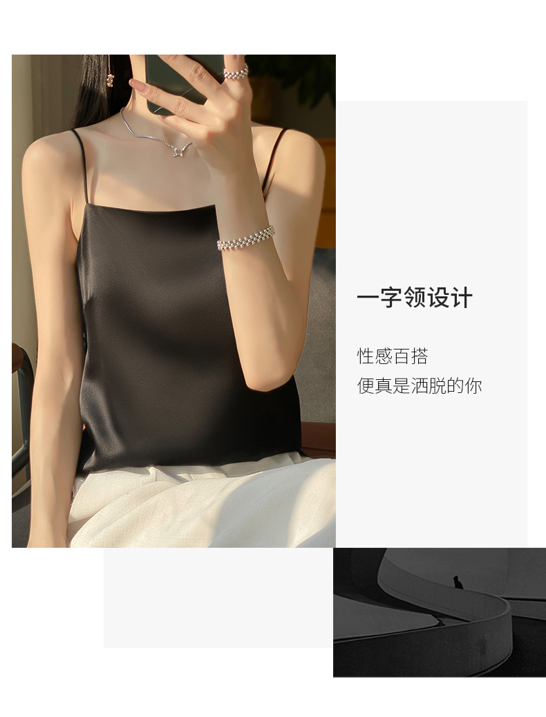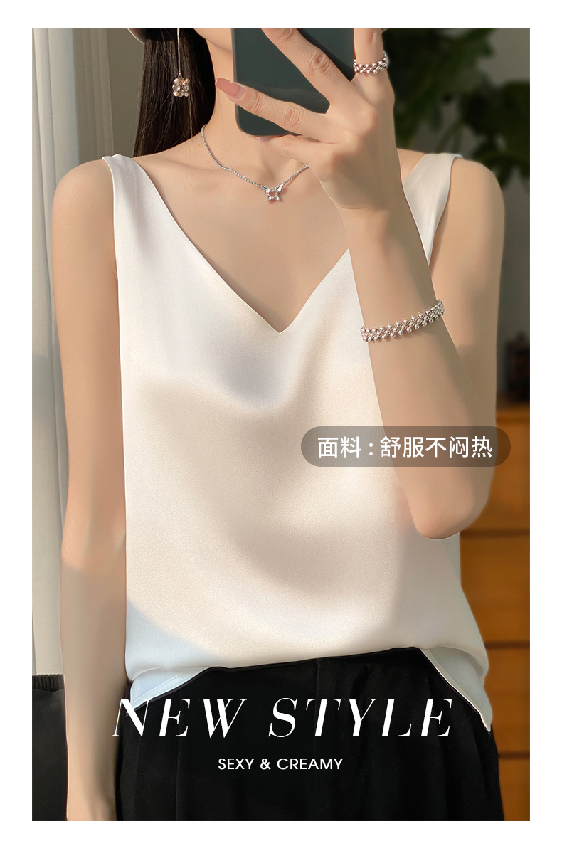 奥伊米夏季女奢华光泽丝滑仿真丝百搭V领一字领背心吊带