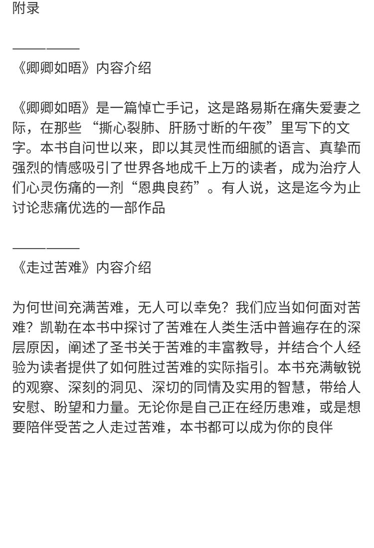 当《卿卿如晤》的狱中书信抚平我们的情感荒漠,当《痛苦的奥秘》以哲思剖开苦难的十字架纹理,最终《走过苦难》会引你走向黎明——这套书是写给当代信徒的属灵地图。