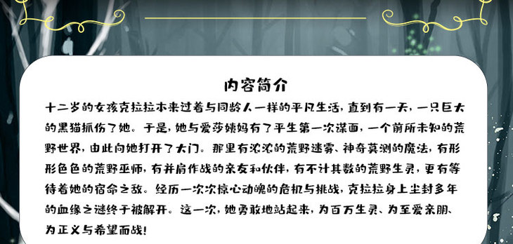 黑猫、迷雾、荒野世界……在这场充满紧张、刺激和跌宕起伏的荒野之旅中,善良又有点儿懦弱、深爱妈妈又有点儿小叛逆的女孩儿克拉拉在飞跃式成长。她没有神奇的魔法棒,却拥有打败一切黑暗与恐惧的最强魔法——真诚、善良、勇敢和爱。这个魔法就像阳光照亮荒野一般,照亮了她充满艰辛的前行之路。