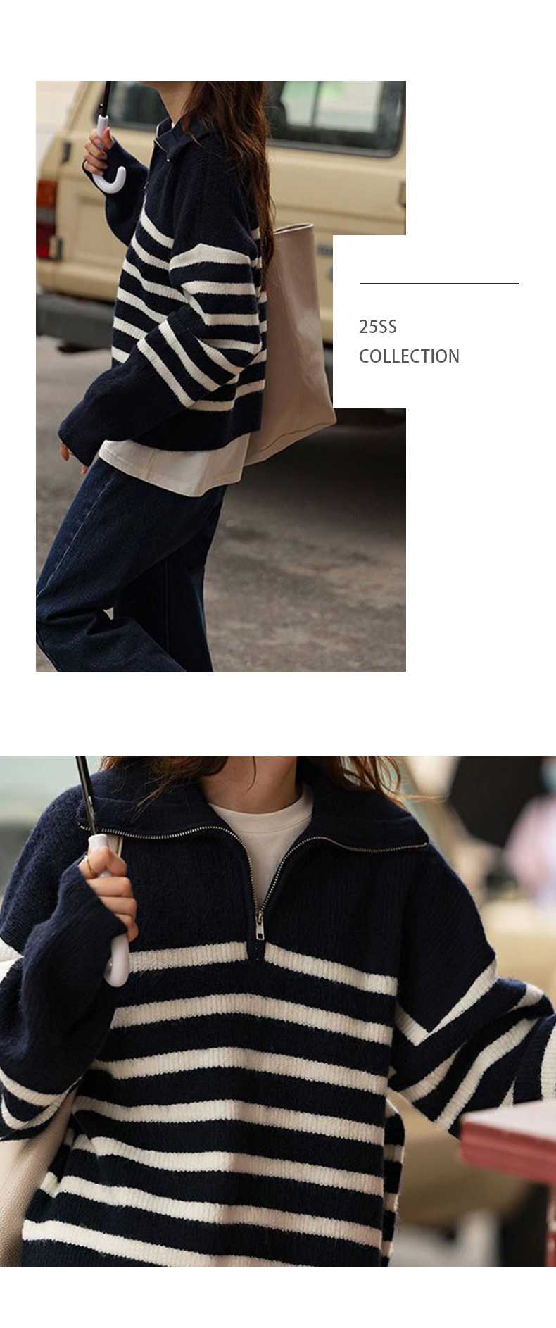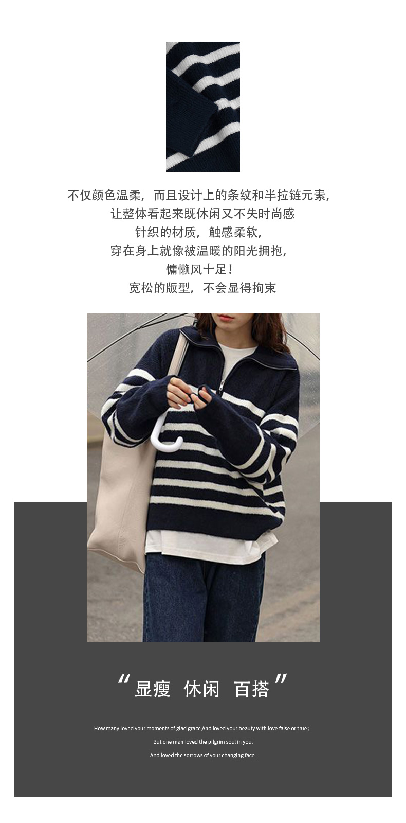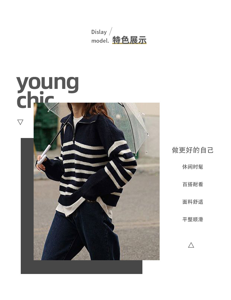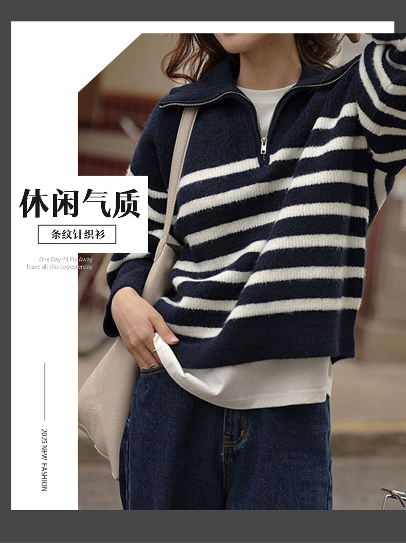 馥迦复古翻领条纹半拉链针织衫