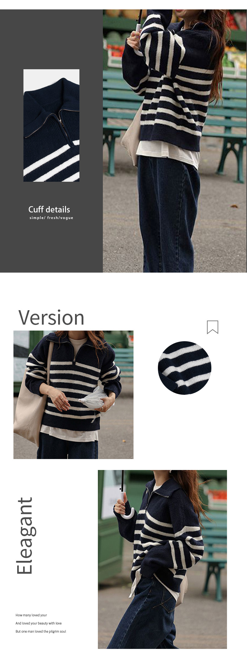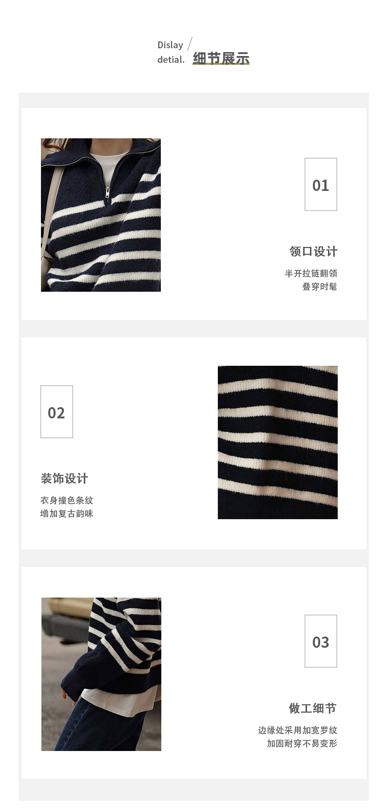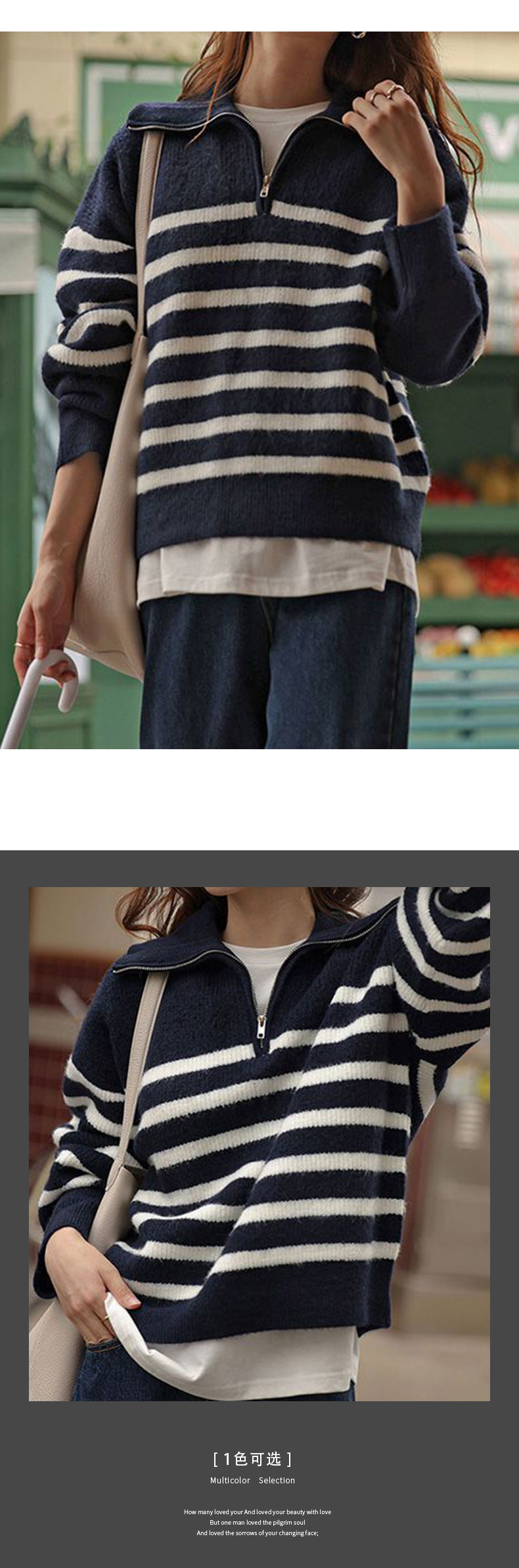 馥迦复古翻领条纹半拉链针织衫