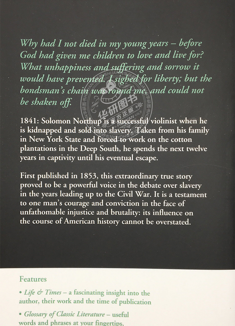 Twelve Years a Slave《为奴十二年》是奥斯卡获奖同名电影的原著。该书为所罗门·诺瑟普以自身亲身经历为蓝本创造的小说,讲述了一个原本生活在纽约的自由黑人,受过教育并且已婚,跟随两个承诺给他在华盛顿找工作的人去往当地,却发现自己已经被诱拐,从此开始12年的奴隶生涯的故事。斯托夫人所著的《汤姆叔叔的小屋》中的许多情节取材于这个故事。《为奴十二年》自出版后影响了此后的废奴运动,影响了美国近代历史,已被列入美国历史教材和大学必读书目。