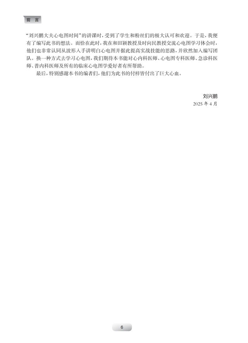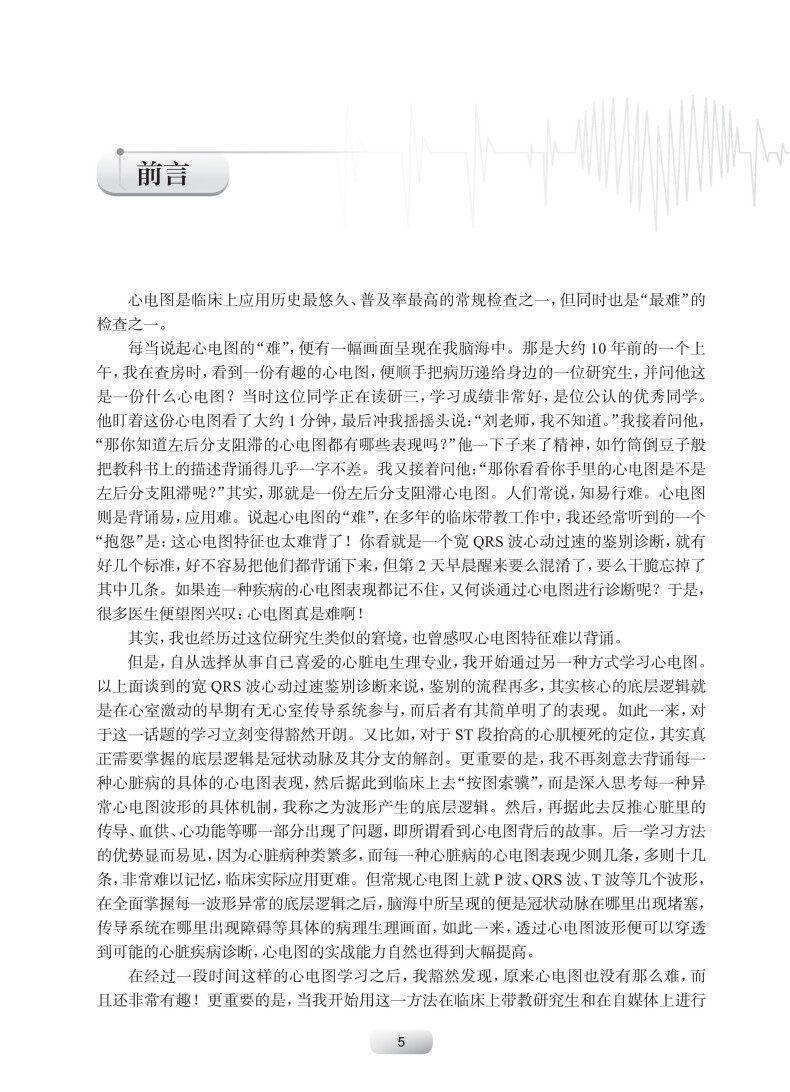 本书的主要特色包括三方面:其一,论述逻辑为"由图到病",与临床诊疗程序接轨,增加实用性;其二,论述心电图表现时着重讲述其"背后的故事",即病理生理、影像、向量…等相关知识,从而使得读者能够真正在理解的基础上记忆相关心电图表现;其三,本书有同名的线上课程相配套。"刘兴鹏大夫心电图"时间是国内的专门系统讲述心电图的线上课程,迄今已经播出2年,逾200节课程,今年10月份将继续推出刘兴鹏大夫心电图时间3.0版。迄今,刘兴鹏大夫心电图时间1.0版和2.0版的累计收看次已经达到数十万次,是国内很具人气的心脏病在线课程之一,该课程粉丝对于出版课程纸版书的呼声极大。
