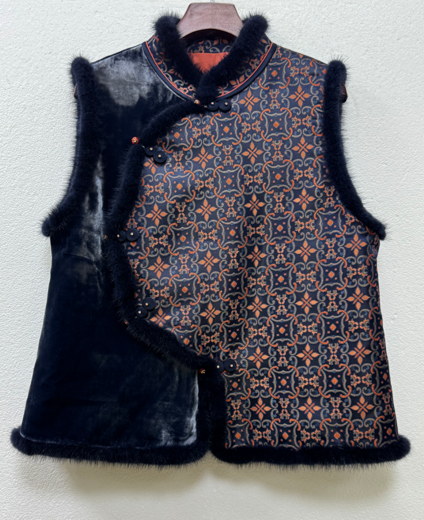 下架|盛唐婧 | 轻奢时尚新中式宋锦拼丝绒花瓣襟夹棉马甲