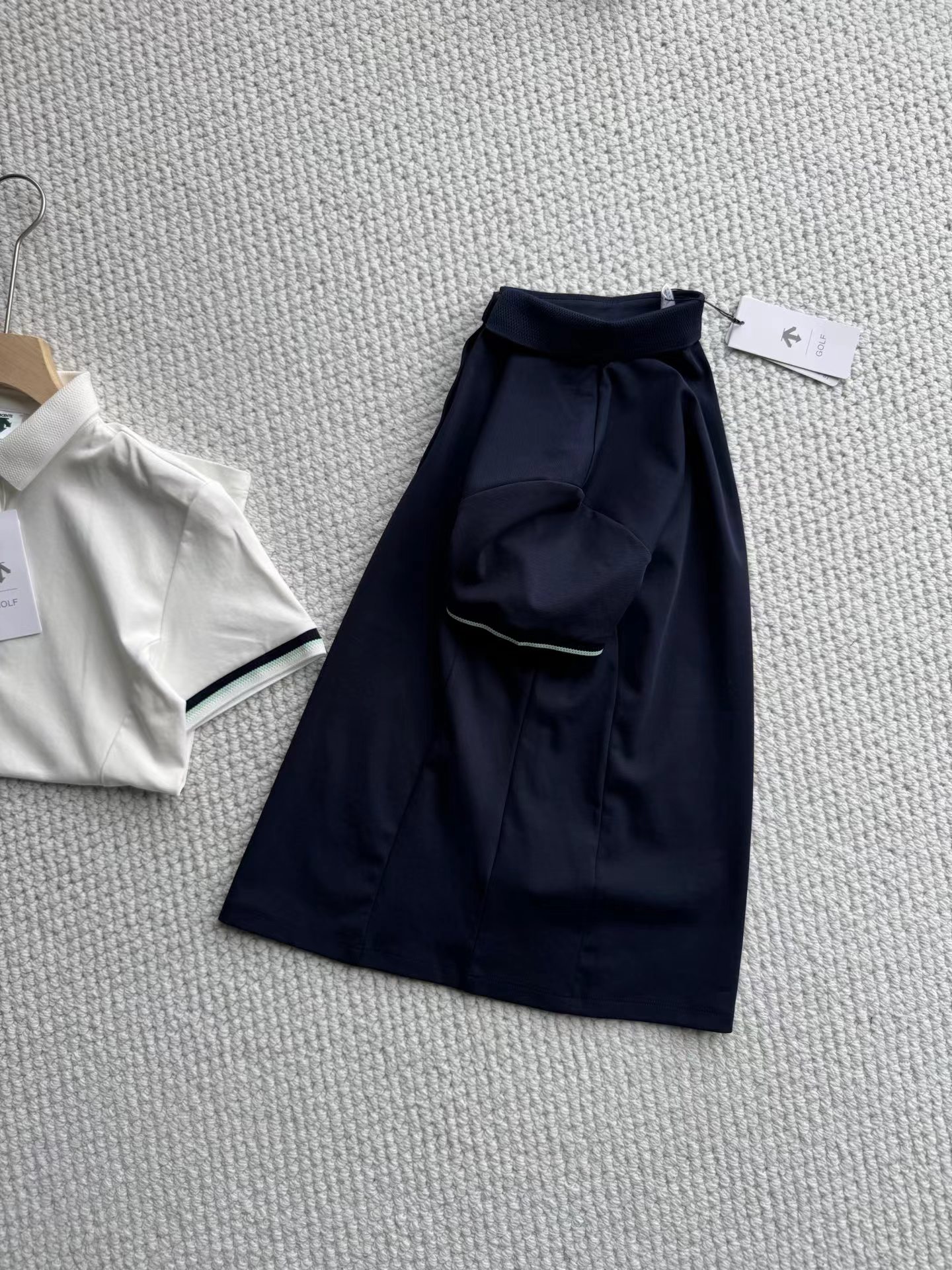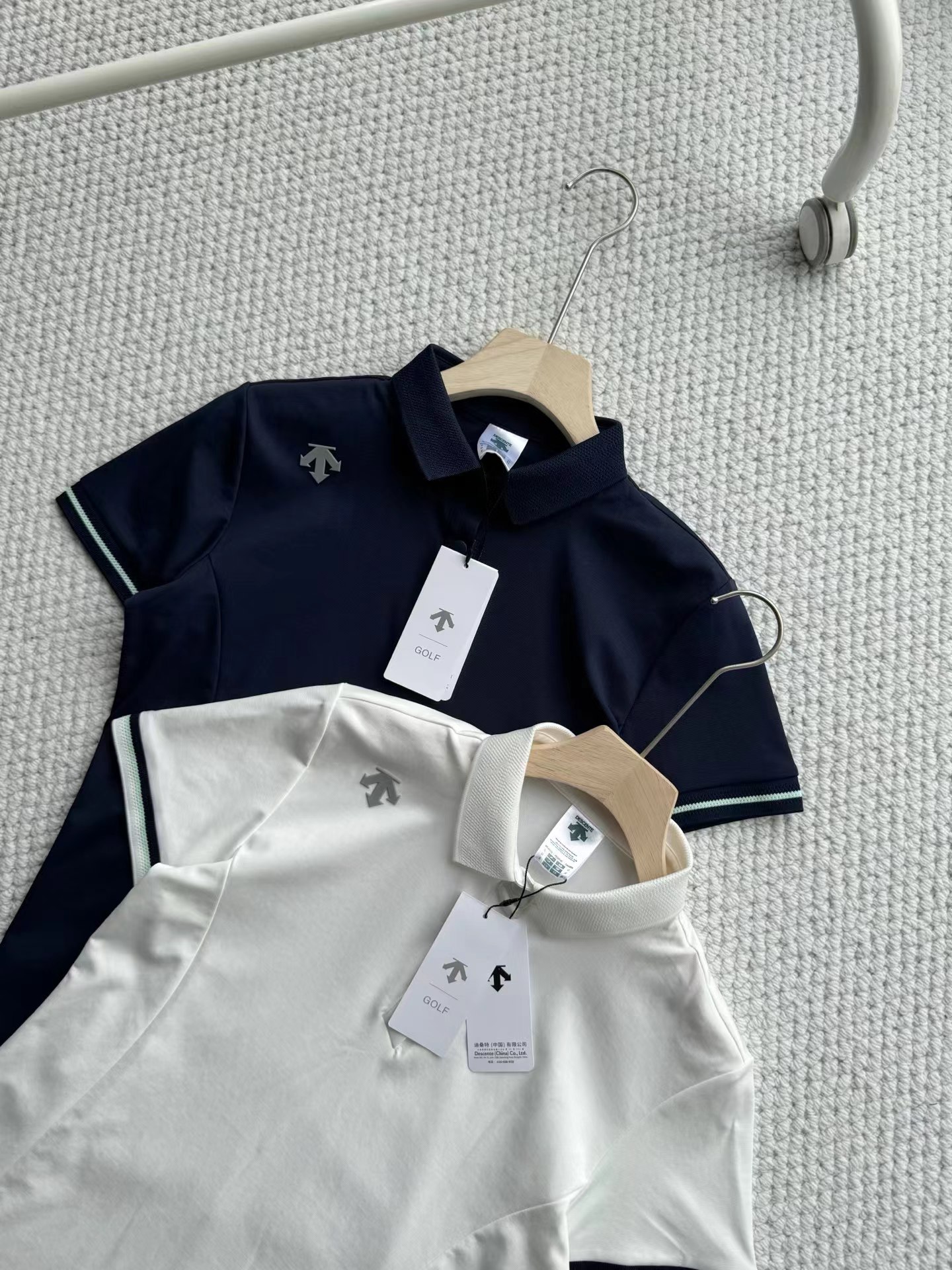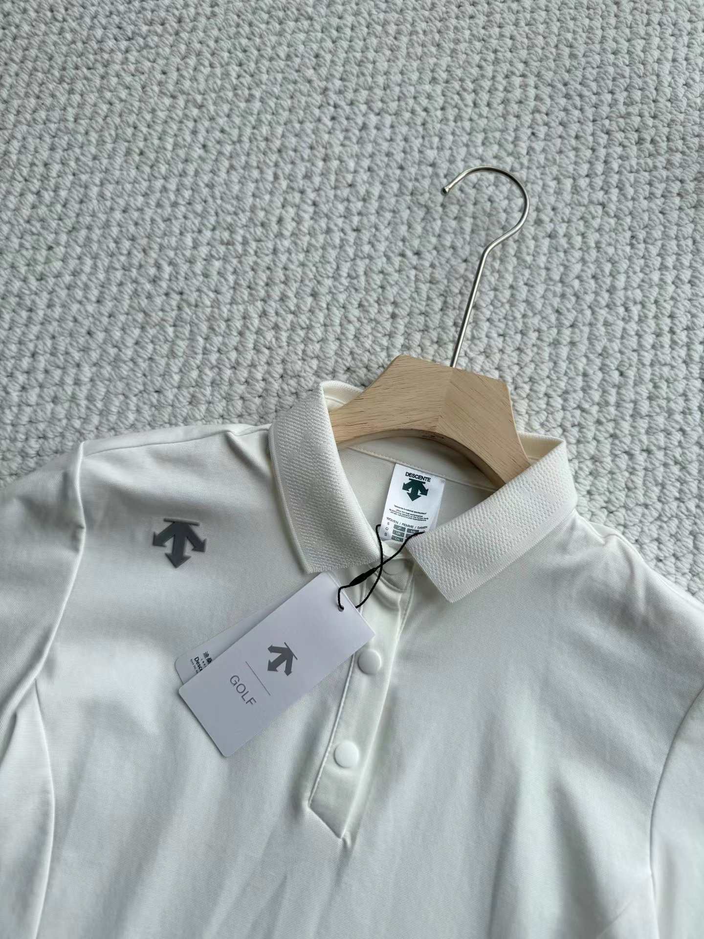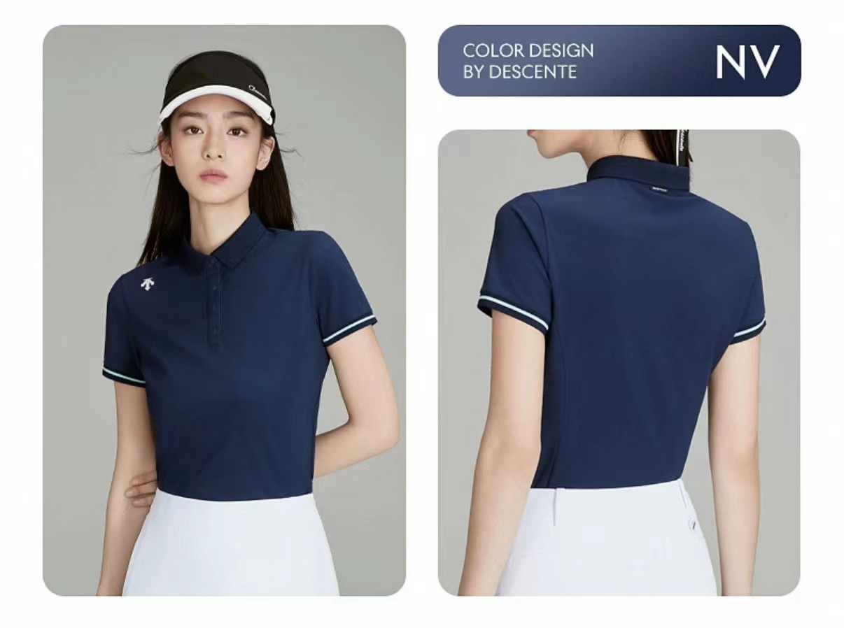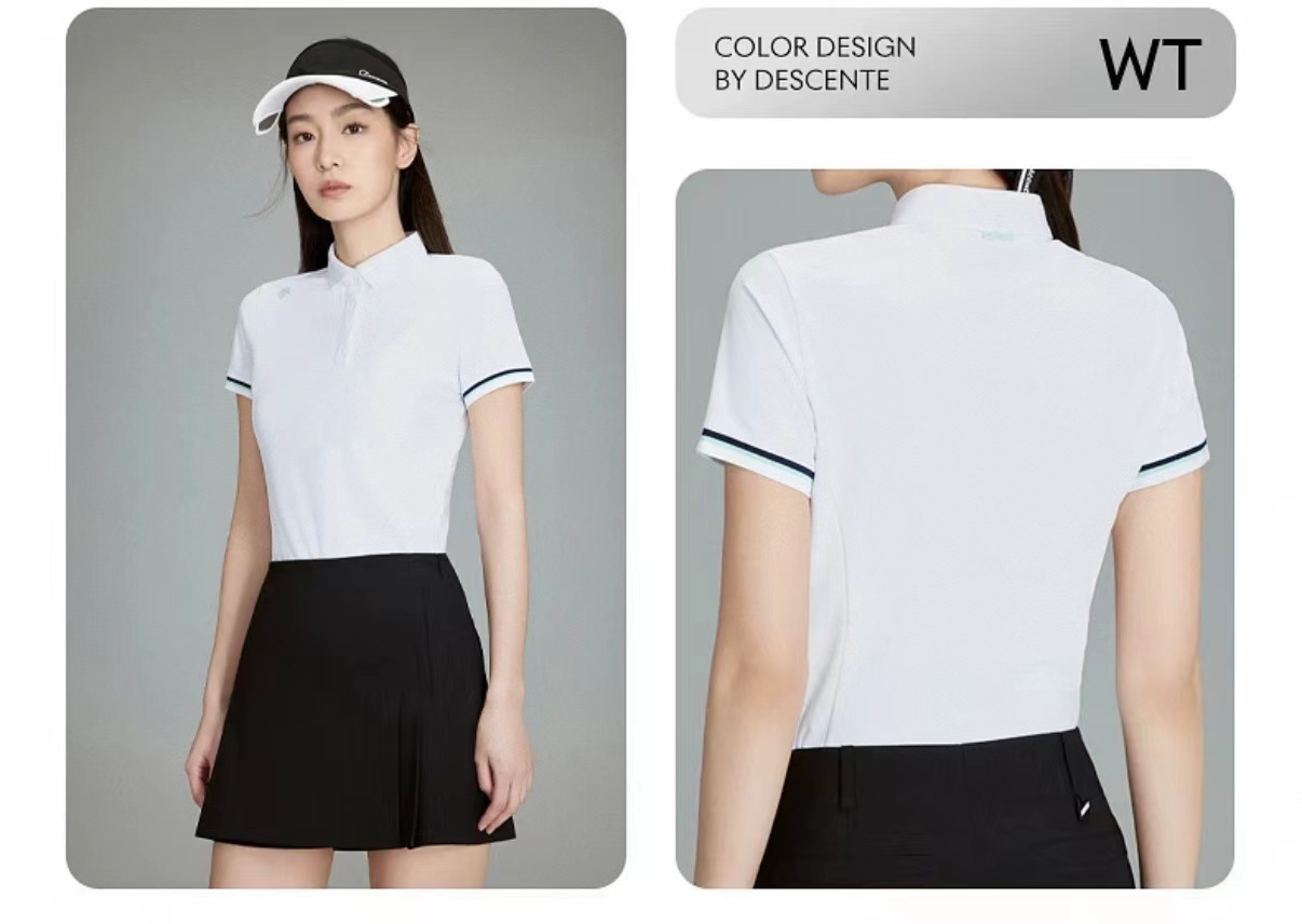 高尔夫FIELD女士防晒修身短袖POLO衫 简约质感,轻松驾驭春夏球场,使用精典Carvico针纺梭面料制成的短袖POLO衫。面料轻质挺阔,平整顺滑,抗皱的同时具有UPF50+抗紫外线功能性。袖口的撞色提织装饰,小巧秀气,细节设计感凸显。领口和袖口的提花工艺,确保花纹立体感的同时保持抗皱、耐磨性。立体剪裁设计,贴合女性身材曲线,兼顾运动灵活性与优雅线条,避免传统POLO衫的臃肿感,偏运动剪裁,若追求宽松效果可考虑大一码。