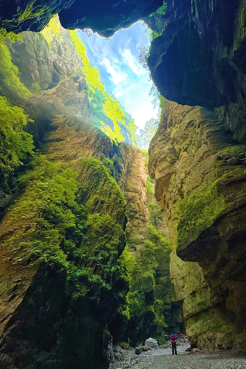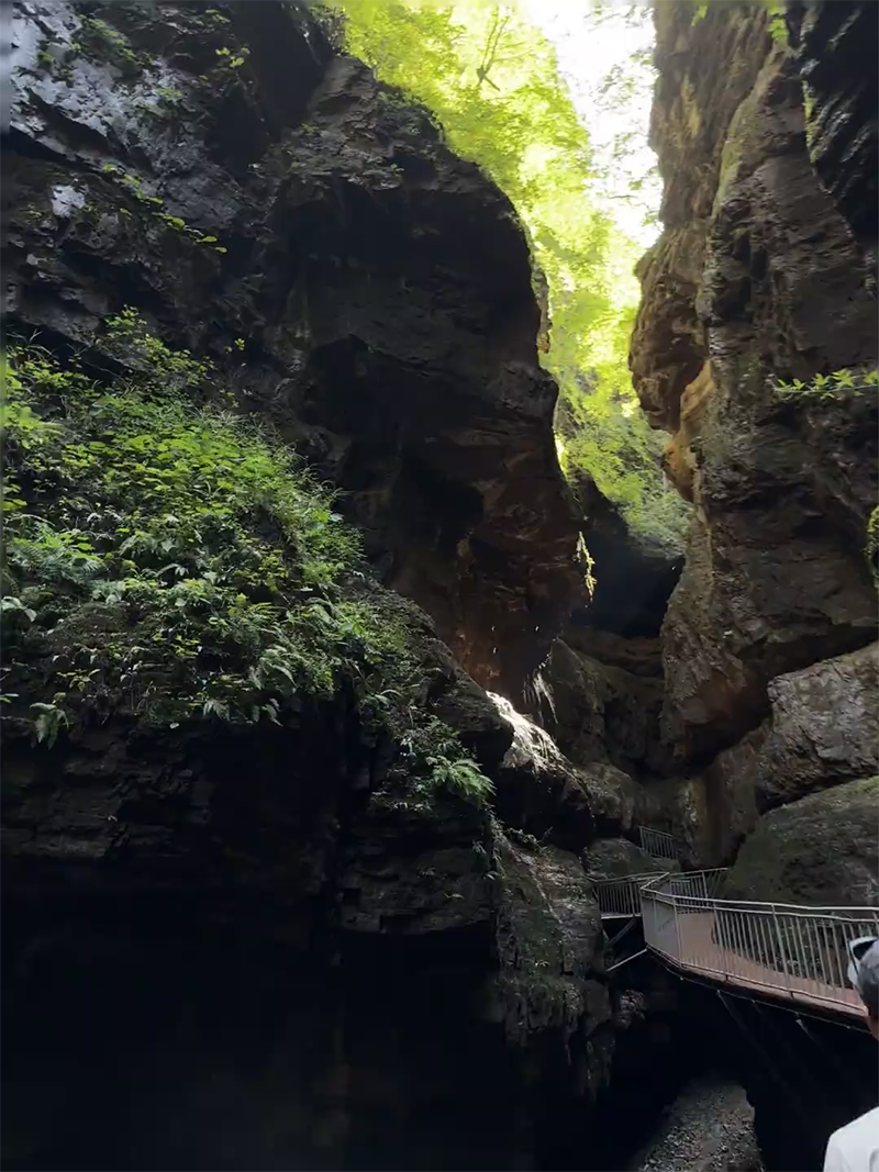 南石洋大峡谷的“一线天”是峡谷中最著名的景点之一。这里两侧岩壁高耸,中间形成一条狭窄的通道,最窄处仅容一人通过。抬头望去,天空被岩壁夹成一条细线,仿佛“一线天光”,因此得名。