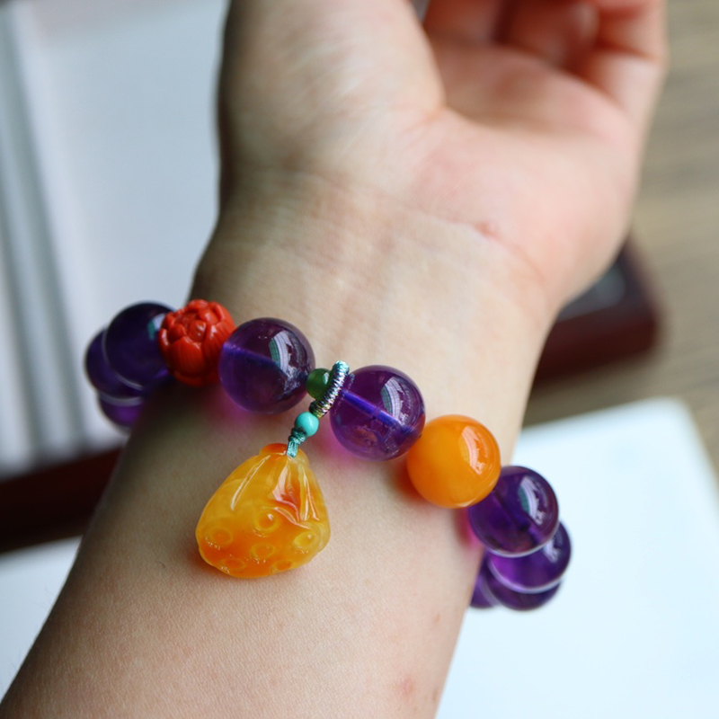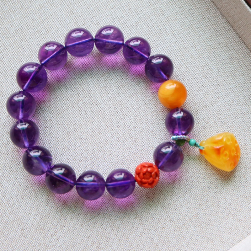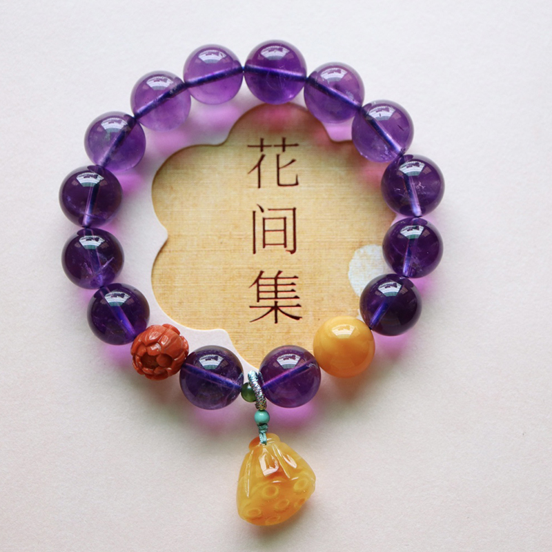 紫水晶手链,尺寸约12.5mm,大颗粒,浓郁的紫罗兰,晶体透亮,色彩艳丽,紫气东来,搭配天然无优化蜜蜡莲蓬吊坠,南红牡丹花珠,花蜡珠