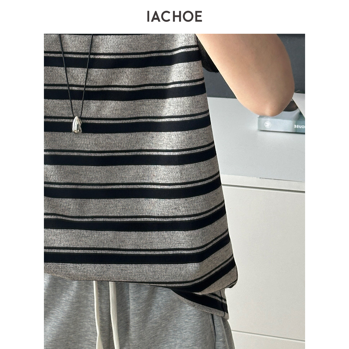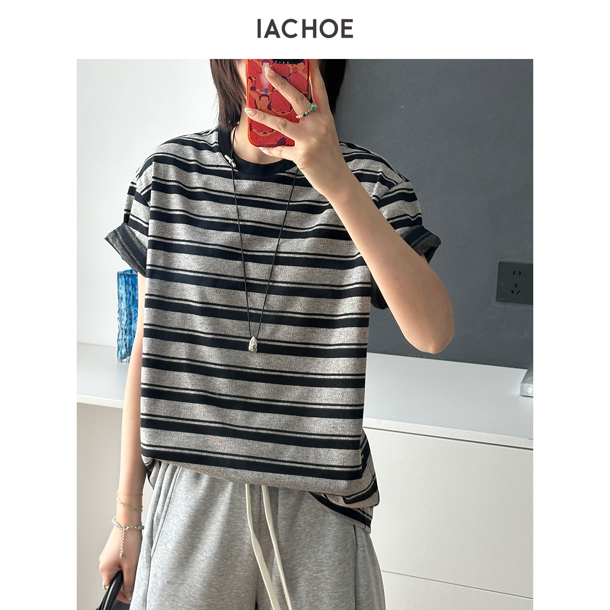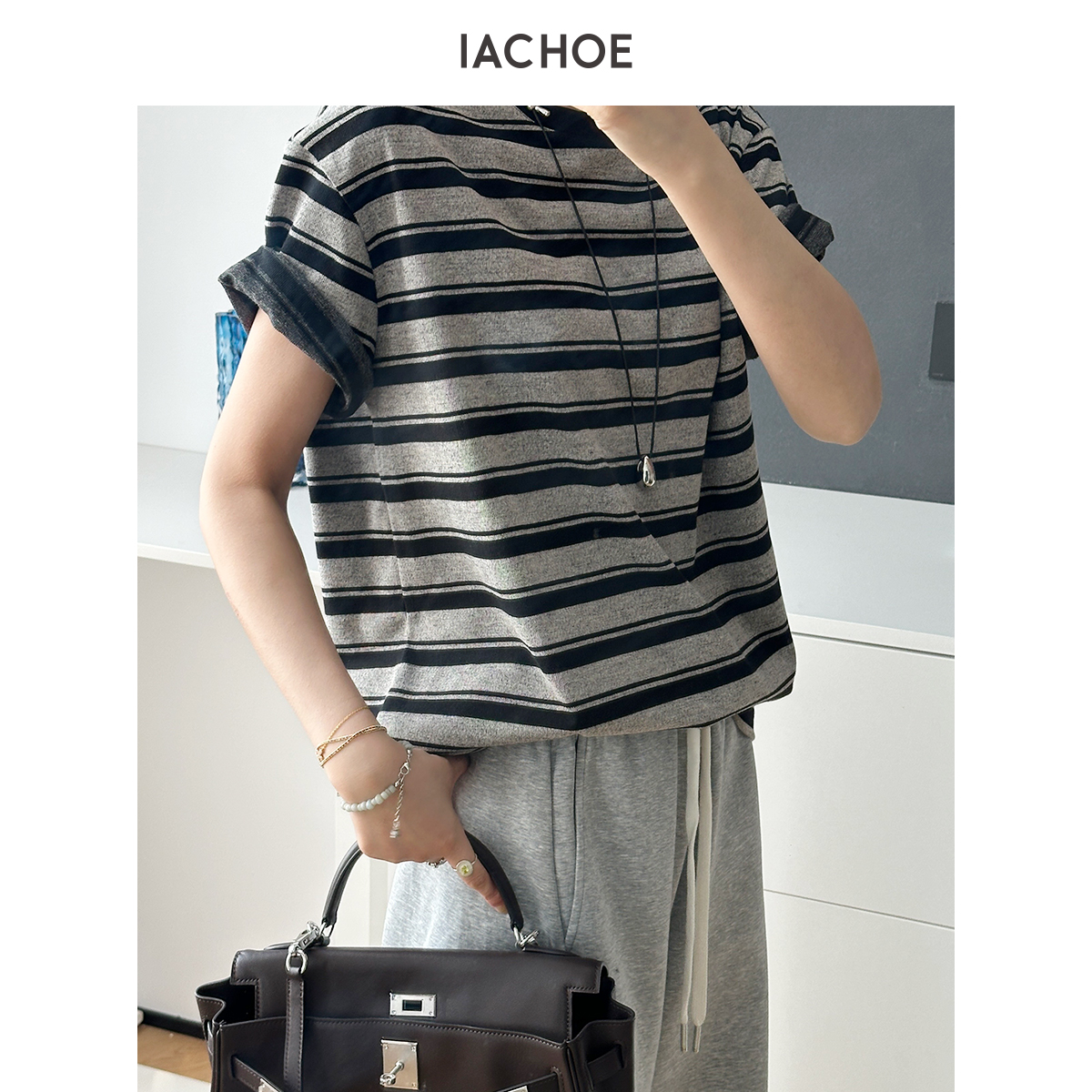 棉仓3621501005-IACHOE翻袖条纹短袖