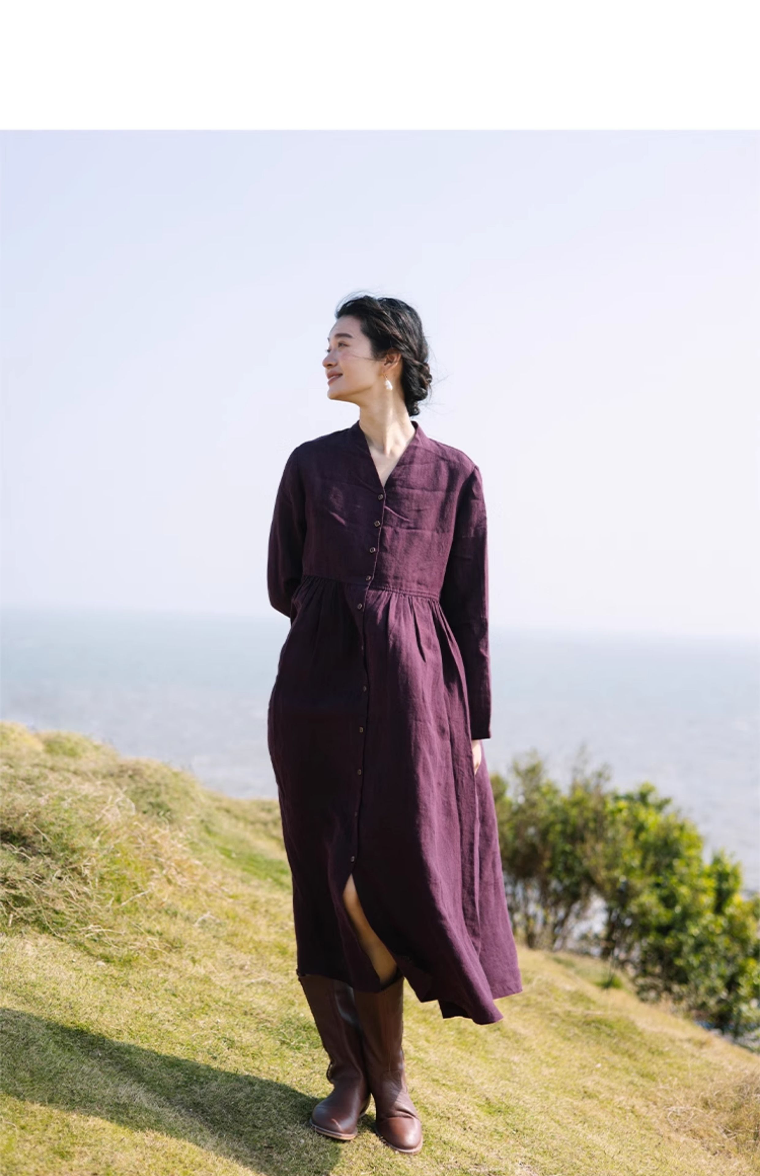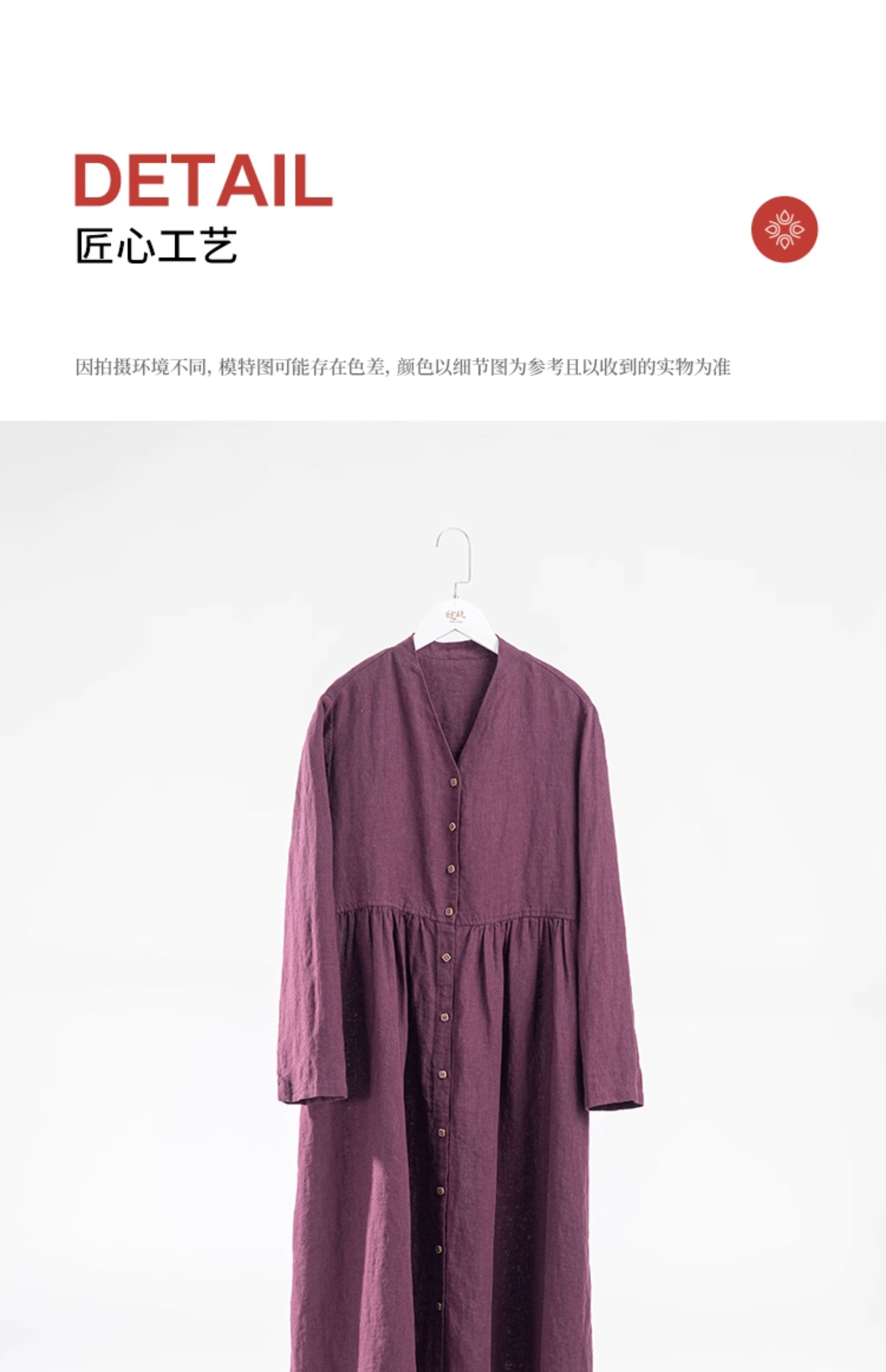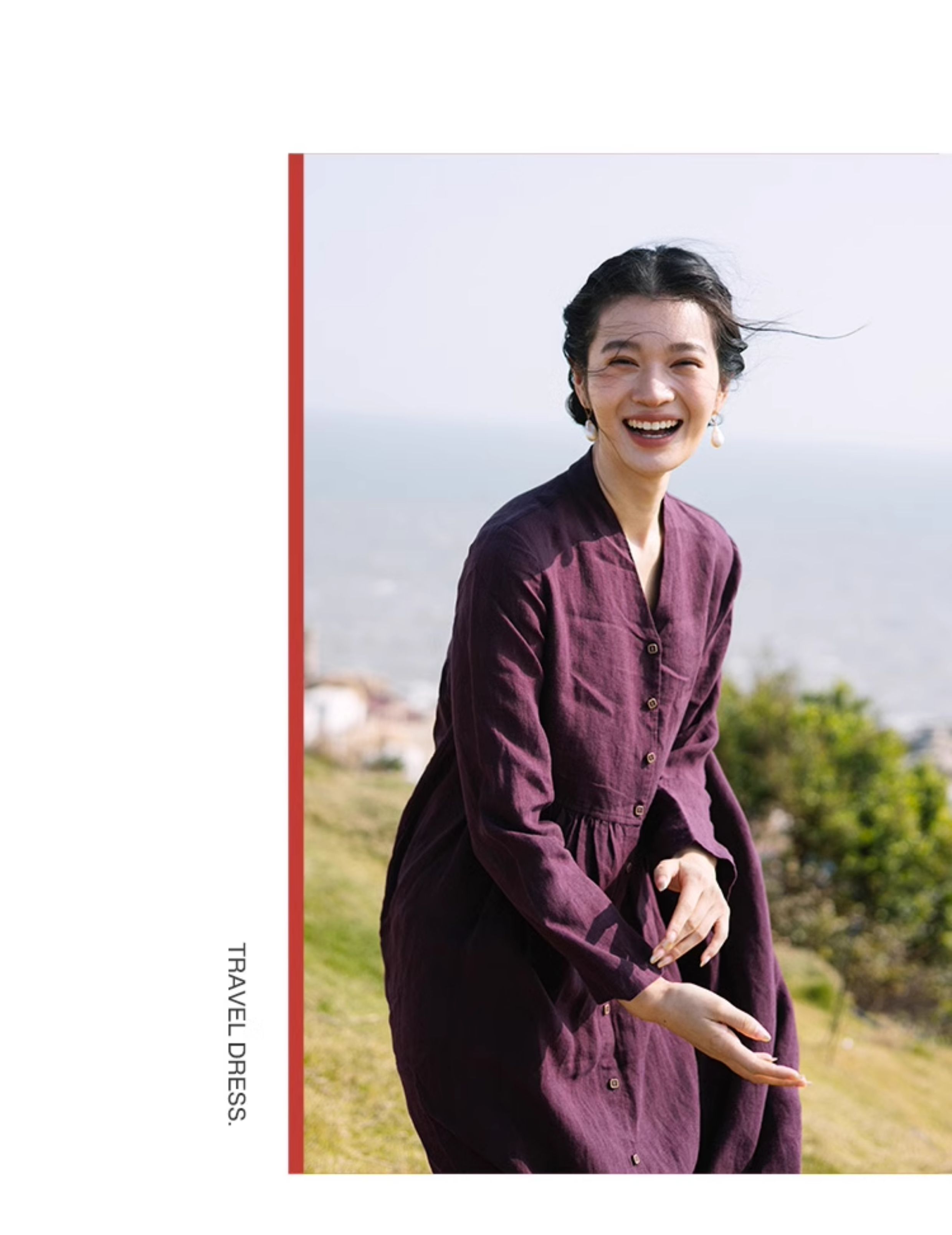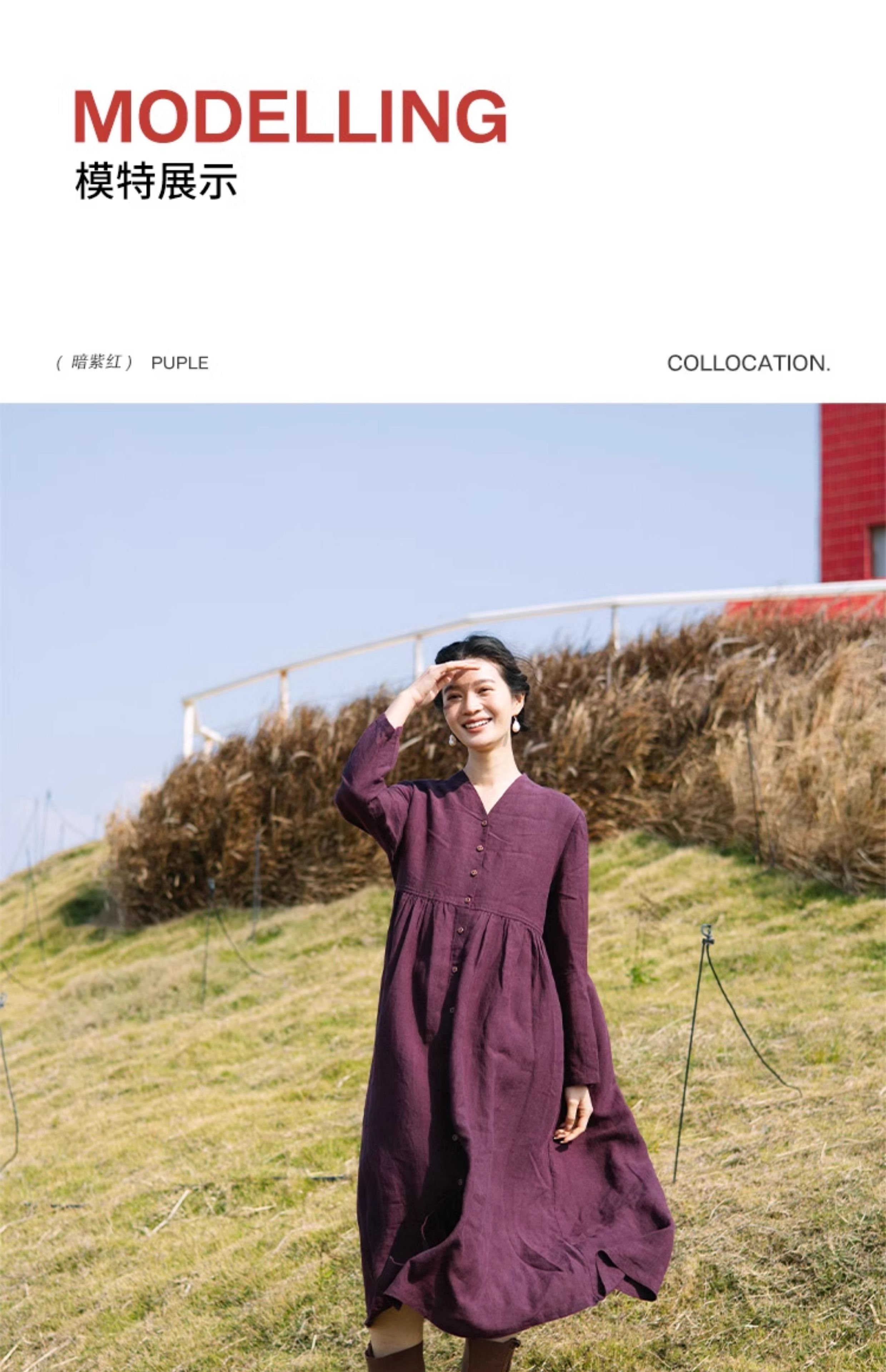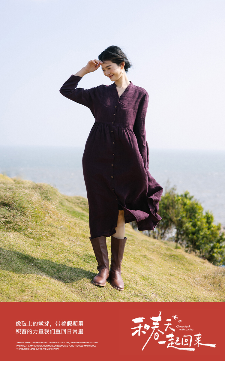 绽放旅行女装059朵/干洗亚麻v领绛紫开门襟两穿长袖显瘦连衣裙