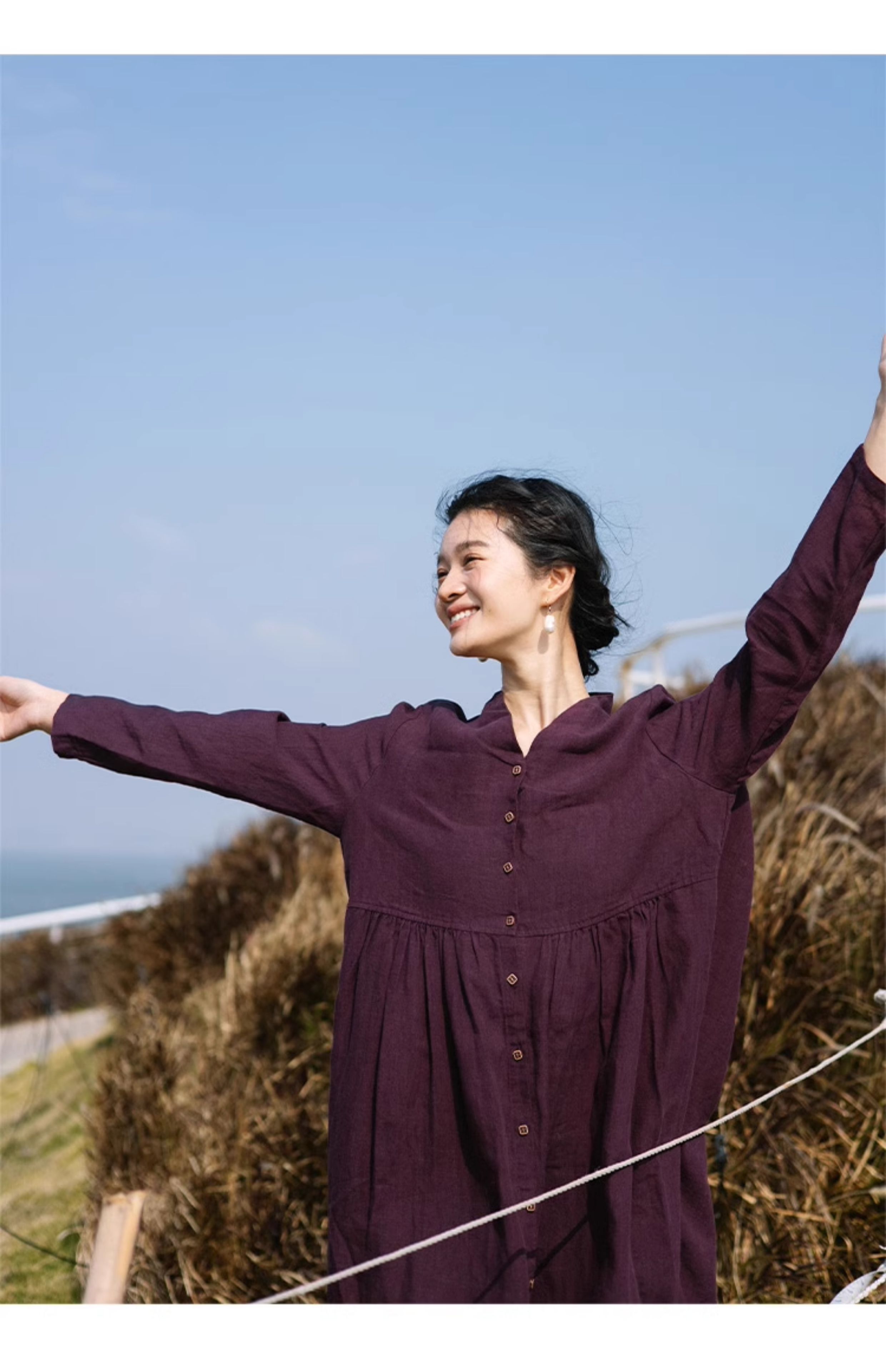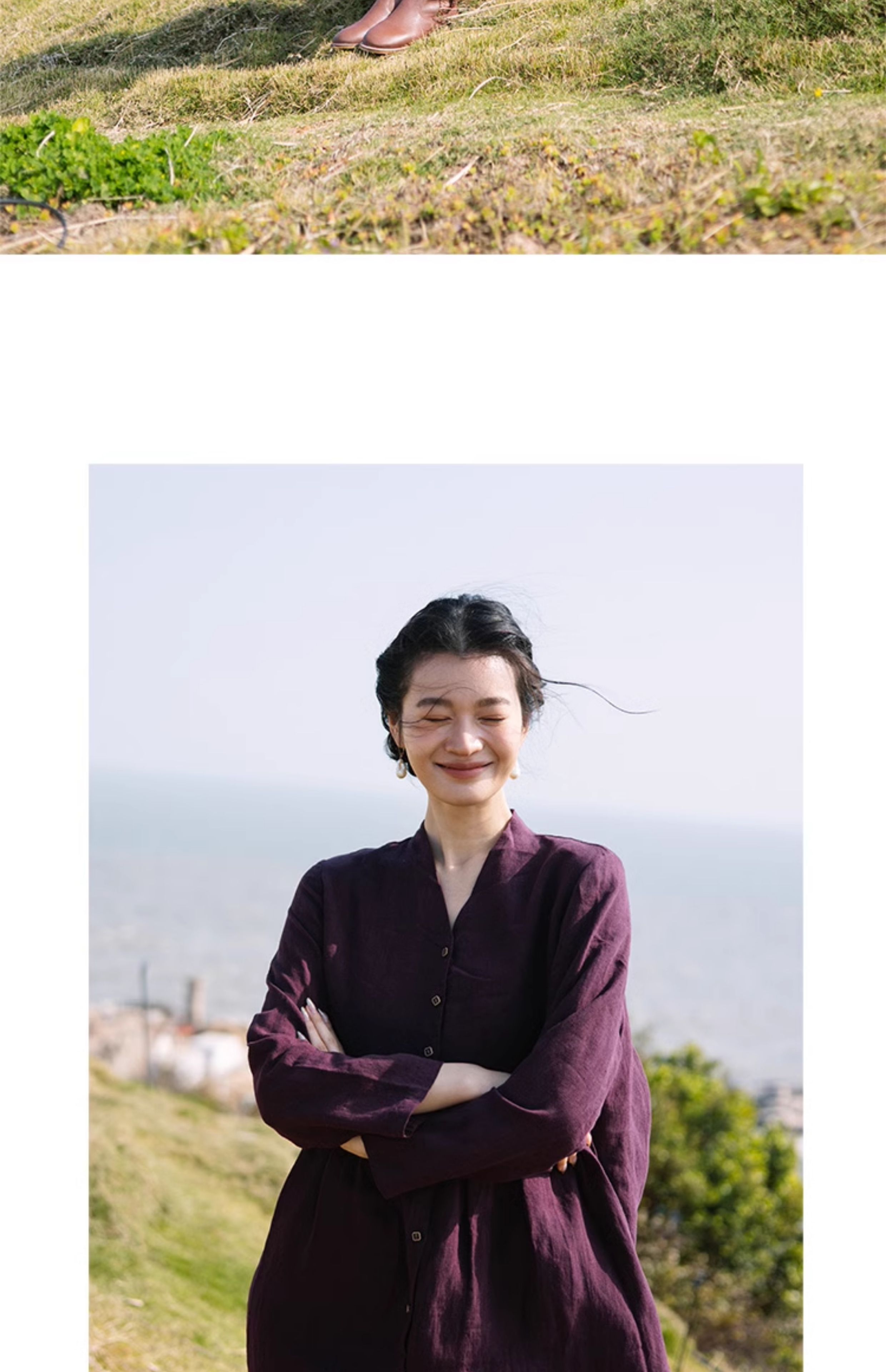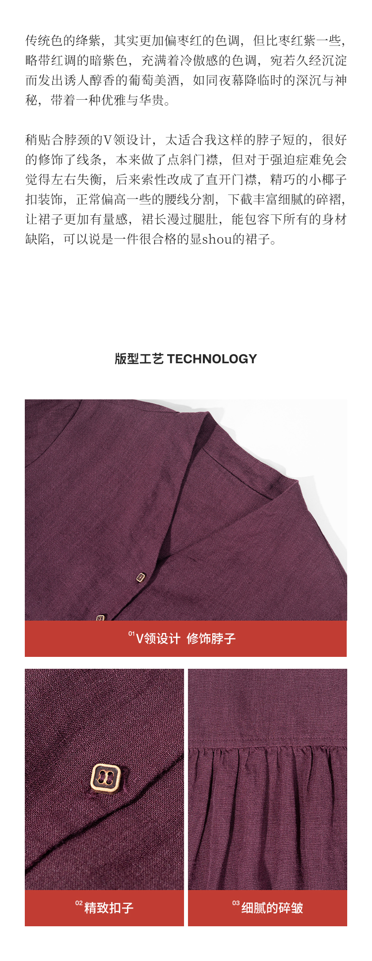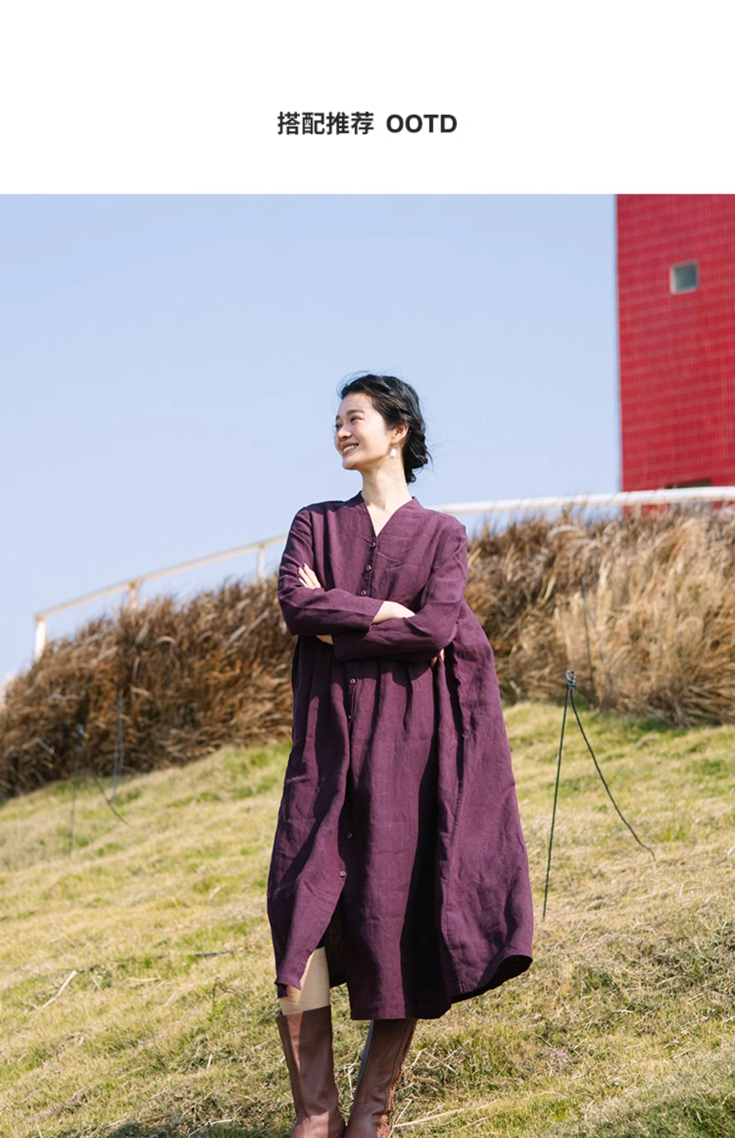 绽放旅行女装059朵/干洗亚麻v领绛紫开门襟两穿长袖显瘦连衣裙