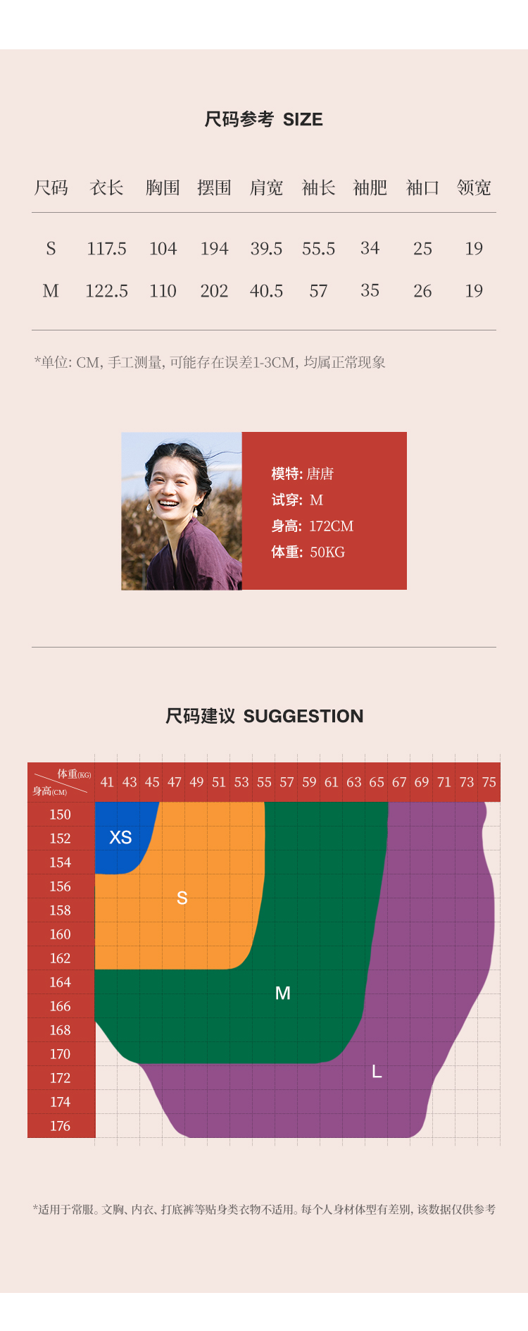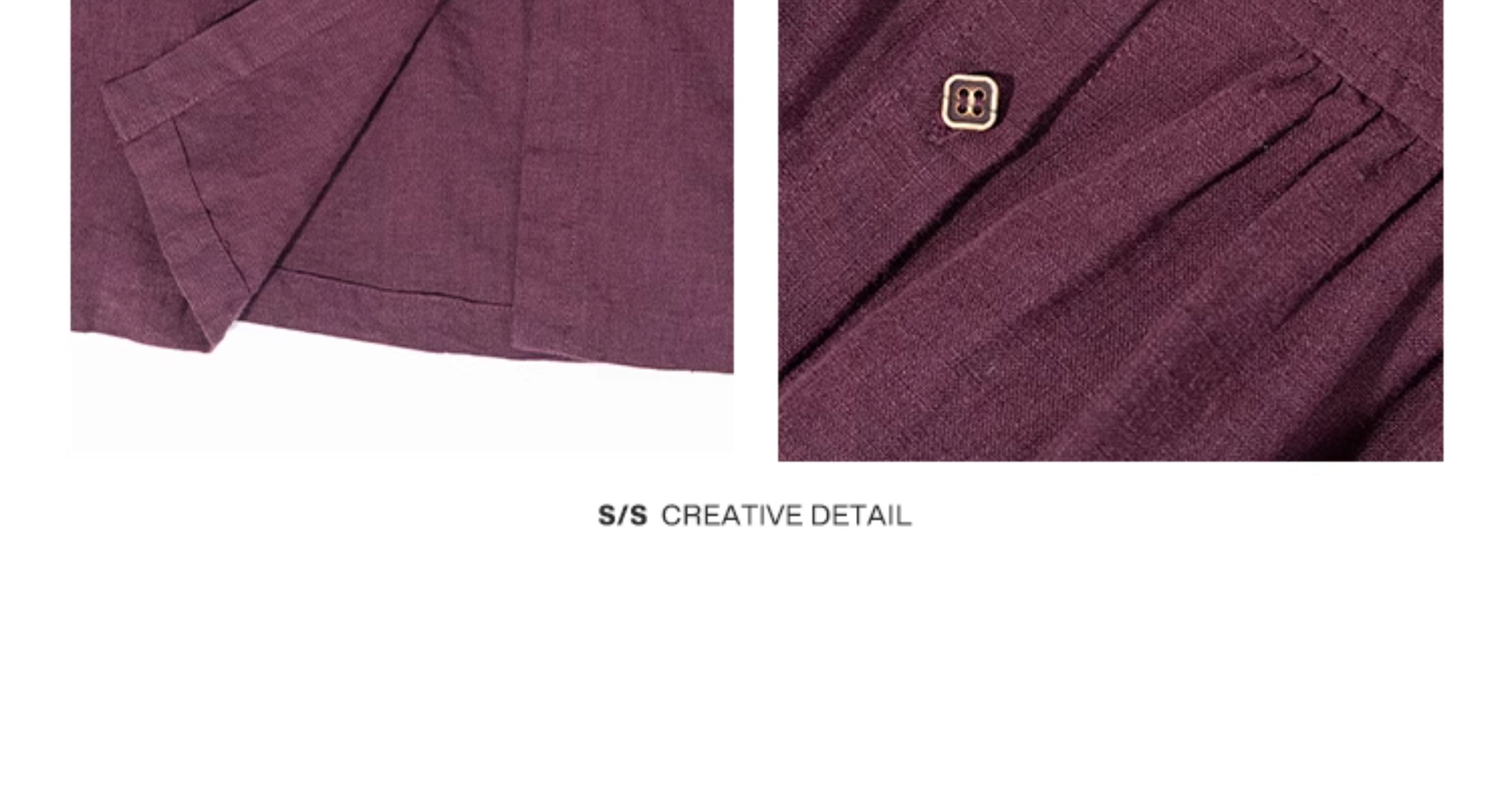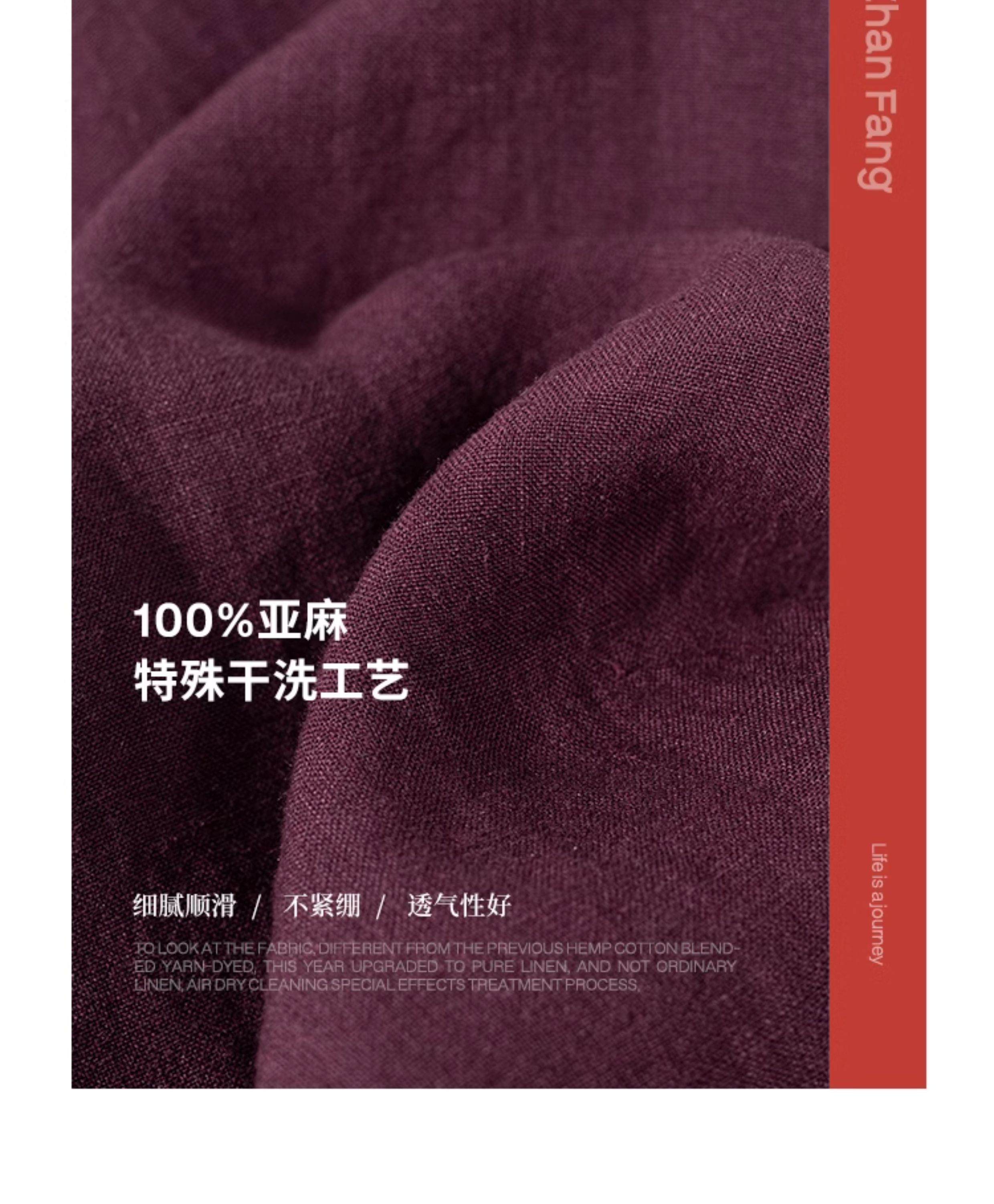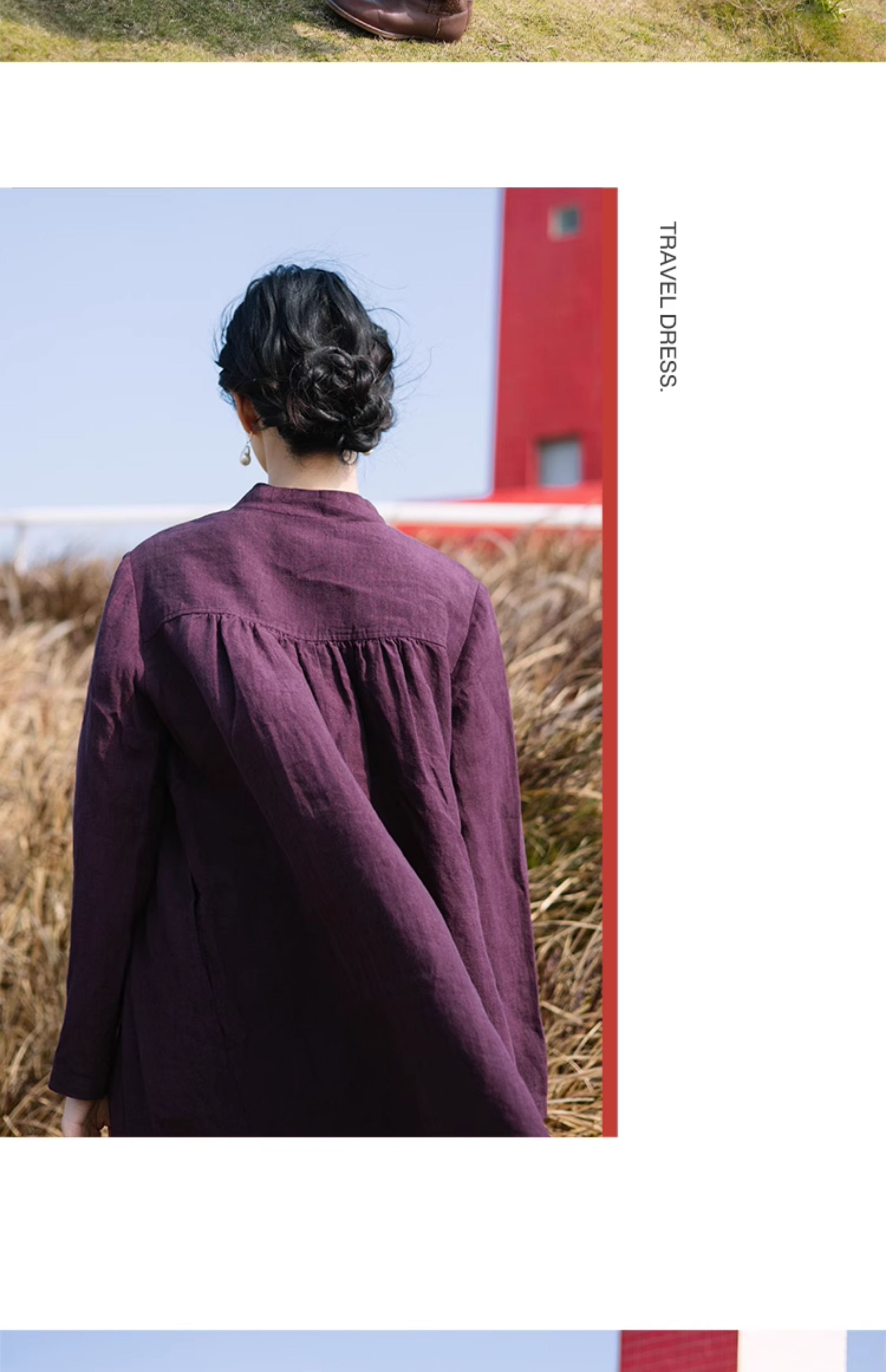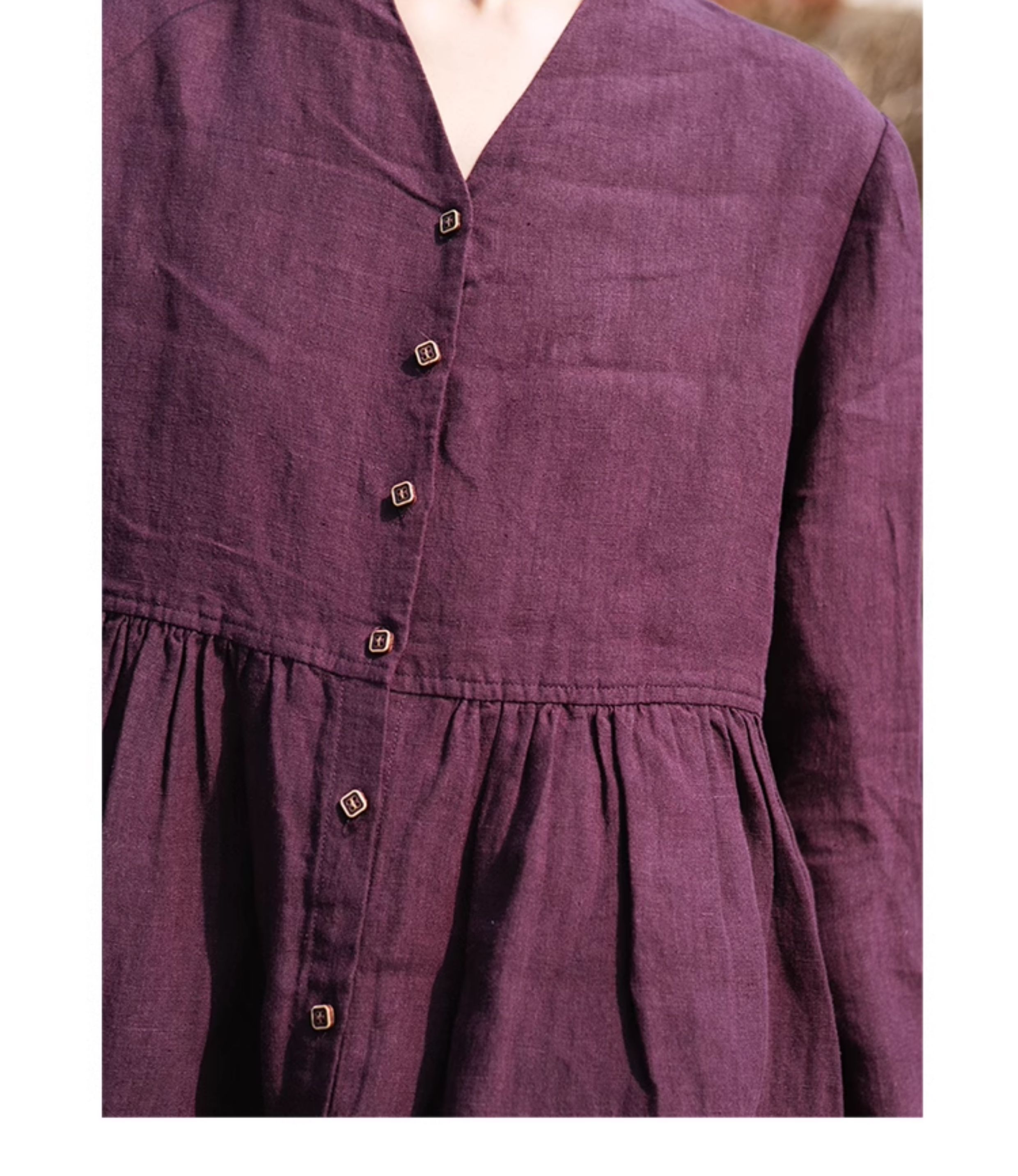绽放旅行女装059朵/干洗亚麻v领绛紫开门襟两穿长袖显瘦连衣裙